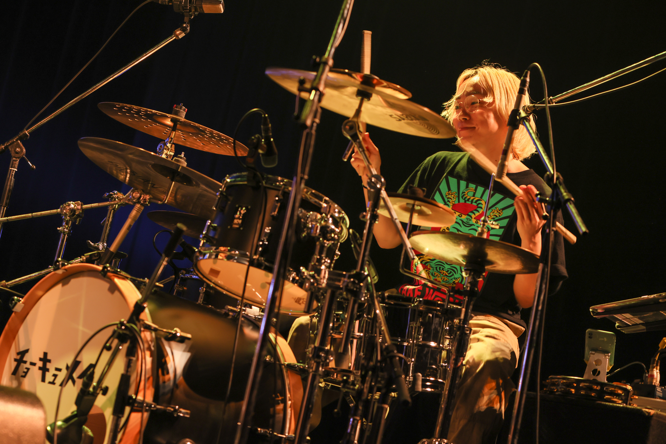 このイベントのオープニングアクトを務めたのは、2020年梅雨頃に結成され、いまSNSなどを中心に注目を集めている4人組バンドのチョーキューメイだ。空閑興一郎(Dr)、藤井ごん(Ba)、れんぴ(E.Pf)、麗(Vo.Gt.Vn)と順にステージ登場し、揃ったところでジャジーでキャッチーな「心を照らせ!」でスタート。やや緊張しているかのように見えたが、それを跳ねのけるようにパワフルに楽曲を届け、間奏では麗がバイオリンを弾き、くるりやザ・クロマニヨンズのファンを驚かせる。