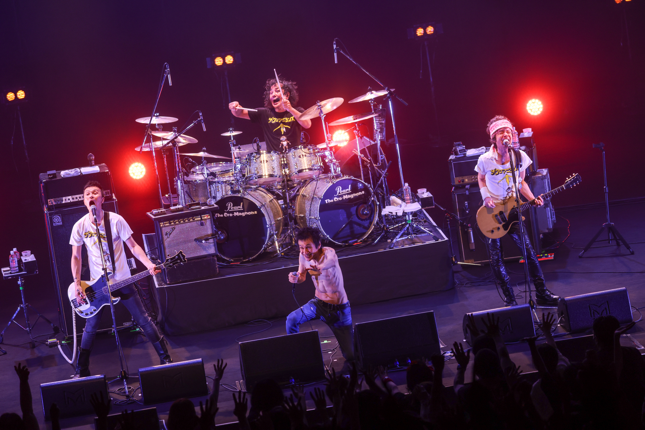 「ヒロトー!」、「マーシー!」など大歓声と手拍子が起こるなか、桐田勝治(Dr)、小林勝(Ba)、真島昌利(G)、甲本ヒロト(Vo)のザ・クロマニヨンズの面々が登場。まずは最新アルバム『MOUNTAIN BANANA』に収録され、映画『Gメン』の主題歌になっている「ランラン」でスタートを切ると、1stシングル「タリホー」、直球のロックンロールナンバー「生きる」、彼ら流の生命の讃歌「イノチノマーチ」まで、怒涛の勢いでぶっ放す。彼らが贈る初期衝動に満ちた純度の高いロックンロール、そして観客の熱量も相まってホール公演にも関わらず、序盤からまるでライブハウスのような熱気が充満。