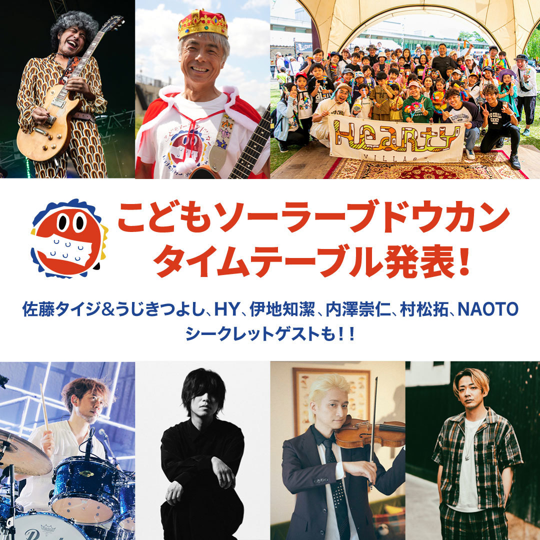 こどもソーラーブドウカンの国王・うじきつよしは、パーカッショニスト・辻コースケと共に両日こどもパレードを実施。誰でも簡単に弾くことができるギター「一五一会」とパーカッションで、こどもたちと一緒に、うじきと内澤崇仁(androp)が共作した<こどもソーラーブドウカンのテーマソング>を演奏する。