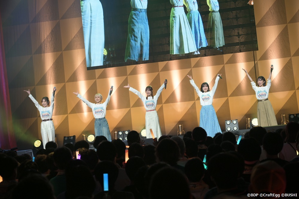 それぞれのキャラらしさをまじえたパフォーマンスと共にソロとデュエットを重ねながら全員のハーモニーへと繋げていく。ファンも5人の振る手に合わせて場内のファンもコンサートライトの横乗りを重ねて、場内はハッピーな一体感に満ちていく。そしてラストは全員手を繋いで礼をしてからのポーズを決めて、ライブは大団円で締めくくられた。