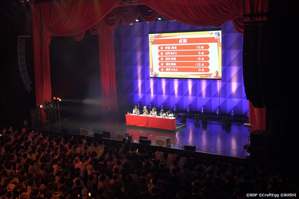 最初のコーナーは5人が様々なテーマでトークを繰り広げる「ハロハピ!フェスティバル☆トーク!」。「ハロハピメンバーがそろってお話しできる、またとない機会です」という前振りに「もうないんだ」「最初で最後ってこと?」「レアイベントじゃん」と次々にツッコミが入り、さらに黒沢が第一部のみの出演なことをネタに「共演NGだされてるの?」などの際どいネタに田所が「初っ端からギスギスするのやめてください!」とツッコむなど、スタートからステージ・客席共に笑いが絶えない始まりとなった。