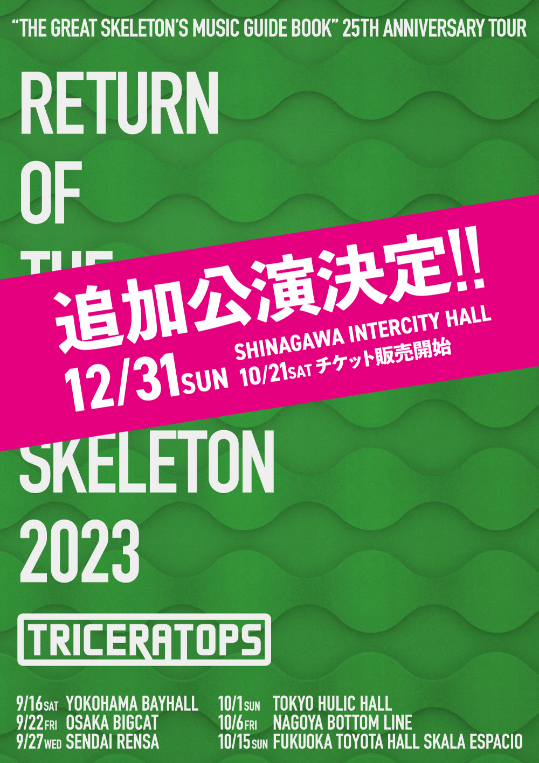 『RETURN OF THE GREAT SKELETON 2023』は、TRICERATOPSが1998年に発表した2ndアルバム『THE GREAT SKELETON’S MUSIC GUIDE BOOK』のリリース25周年を記念したツアー。2ndアルバムを再現した同ツアーは、10月1日(日)の東京公演(有楽町ヒューリックホール)が発売2分でソールドアウト。初日の横浜 BAYHALLでは、アンコールで、バンド初となる大晦日の追加公演の開催が発表された。