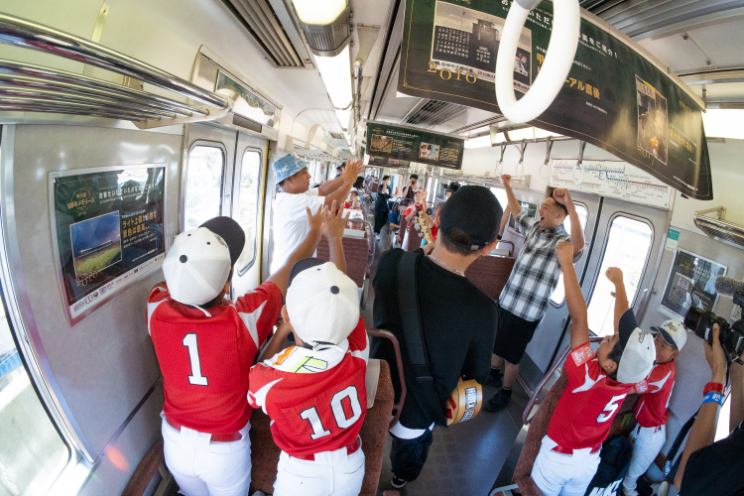 電車の中では球児とふれあい、ライトスタンドでは阪神甲子園球場100周年記念事業応援ソング「CLASSIC」ほか、ベリーグッドマンの代名詞とも言える 「パワーソング(応援歌)」 を5曲披露。球児たちが未来の甲子園球児になるようエールを送り、ともに盛り上がった。