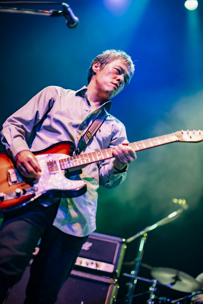 田中による、実にらしい挨拶を挟んでから、バンドは早速、『Almost there』から「Ready to get started?」を初披露。イントロから田中と西川がハモらせるツインリードギターに少々面食らいながら、GRAPEVINEらしからぬ(?)爽やかなパワーポップサウンドが心地いい。間奏で、嬉々としてギターソロをハモらせる田中と西川に観客は大歓び。踊り始める観客も少なくない。