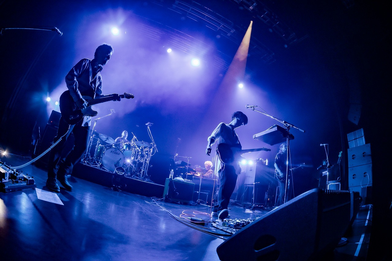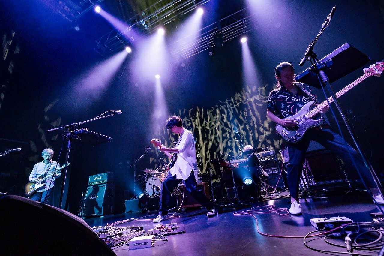 田中がソリッドギターをセミアコに持ち替えた「目覚ましはいつも鳴りやまない」は、ファルセットを交えた田中の歌に亀井がハーモニーを加えるアーバンなソウルナンバーだ。西川がワウを踏みながら加えるオブリもムーディーで曲調にぴったり……なんだけれど、西川が艶っぽい音色でソロを弾き始めとたん、金戸と亀井がそれぞれダイナミックなグリッサンドとフィルを割り込ませ、さらには高野がアナログシンセでドローンサウンドを加えるという、誰一人、一歩も退かずに曲の印象をがらっと変えるアンサブルがあまりにもスリリングで、これこそがバンドサウンドだろ!と筆者はメモを取るノートに書き殴らずにいられなかった。