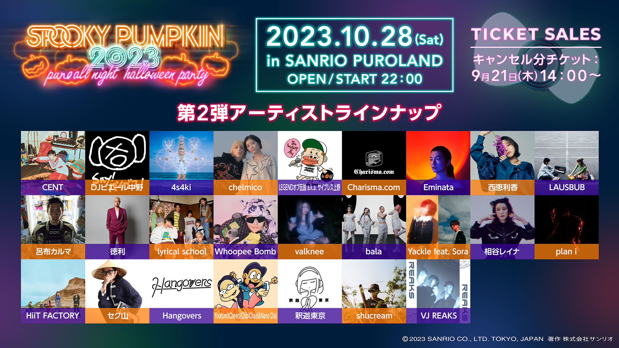 10月28日(土)に東京・サンリオピューロランドで開催される『SPOOKY PUMPKIN 2023 〜PURO ALL NIGHT HALLOWEEN PARTY〜』から、第2弾出演アーティストが発表された。
