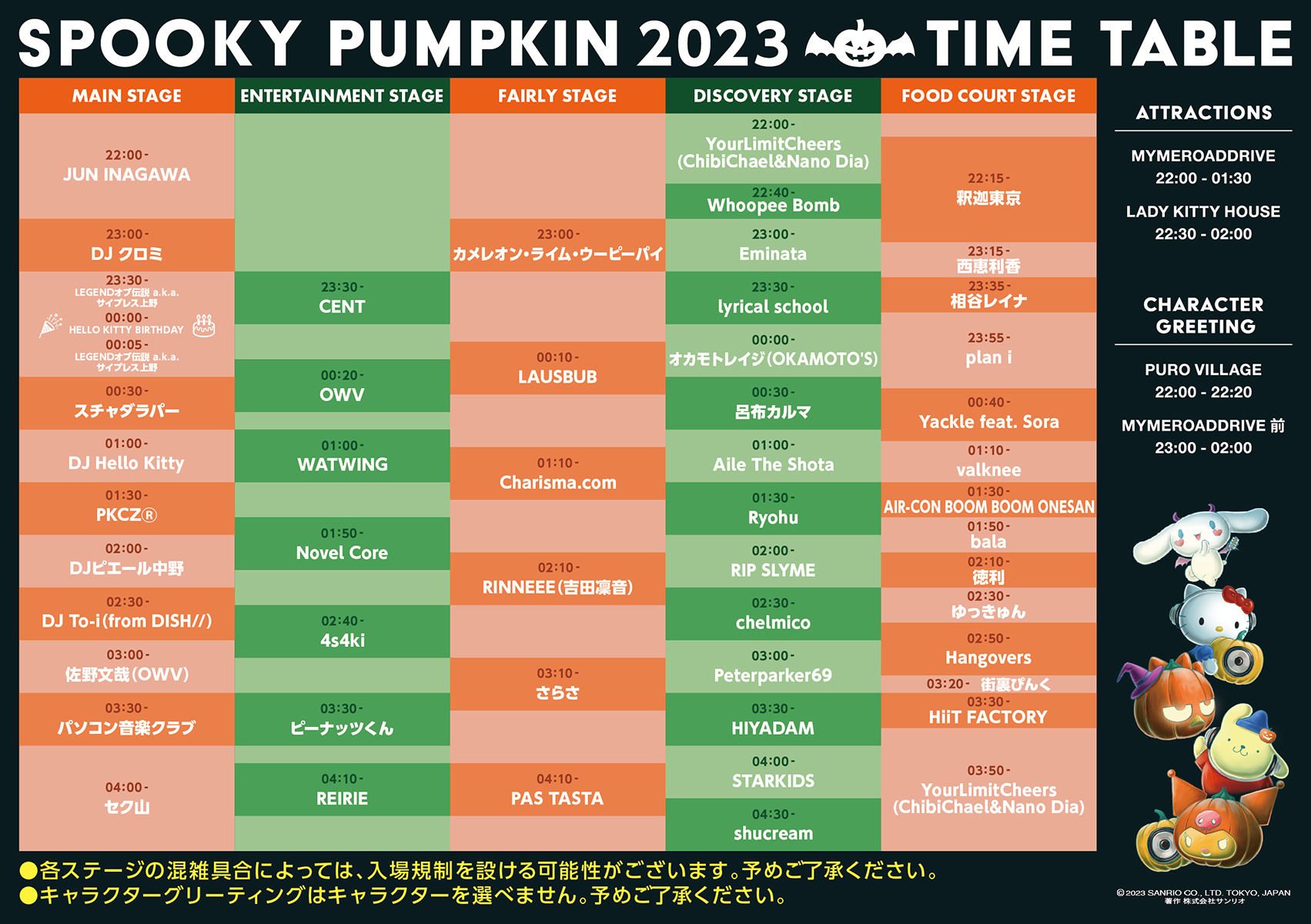 『SPOOKY PUMPKIN 2023 〜PURO ALL NIGHT HALLOWEEN PARTY〜』は、サンリオピューロランドで開催される、一夜限りのオールナイトハロウィーンパーティ。当日は、アルコールドリンクの提供や、様々なアーティストたちの出演、サンリオキャラクターによるグリーティングや一部アトラクションの特別運営などが行われる。また、11月1日に迎えるハローキティの誕生日を一足先に祝うスペシャルタイムも予定。ドレスコードはハロウィーンにちなみ「オレンジorパンプキン」と定められており、仮装での来場も可能だ。