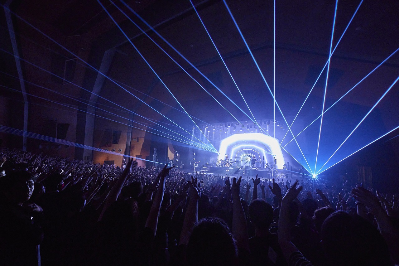 たとえば過去に上毛かるたの言葉を使ったメンバー紹介をしてみたり、地元では何か特別なことがあるんじゃないかと期待する観客の思いが伝わったのか、「いつも高崎で何かあるんじゃないかって……何もないっすよ」とかわす櫻井。「地元でメンバーに会えた。それぐらいでしょうか」と語ると、「あの子が待ってくれている。だからステージへ行くのさ」と、バンド初期のエピソードを歌詞に盛り込んだ「Boogie Woogie」、ブルージーな「野良猫ブルー」、シャッフルビートの「THE FALLING DOWN」と同じ『創世記』を軸とした世界観を持つ「天使は誰だ」を続けると、いよいよ本編のクライマックスへ。戦争という重いテーマを軽快なメロディに乗せて歌う「太陽とイカロス」。“悲シクハ無イ コレデ自由ダ”と、背景に広がる真っ赤な太陽に向けて、両手を広げて羽ばたく姿が美しくて哀しかった。そして、その先にある精神世界へと導いていく「die」へ。大きな曼荼羅の映像と没入的なサウンド、全体を包み込むような光の中で、ある種の恍惚感を味わった。