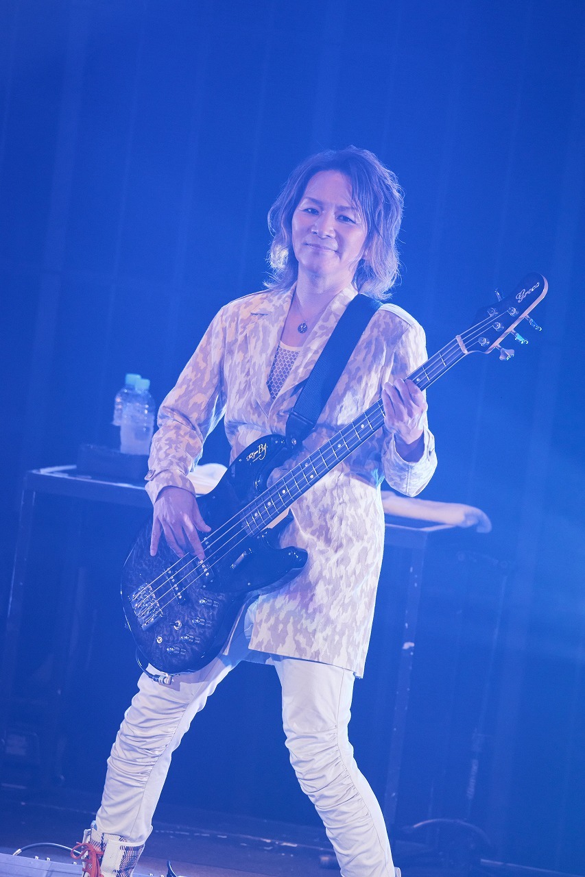 ヤガミのドラムソロから始まったアンコールは、35周年の思いを込めて“WE LOVE ALL 抱きしめたい”とアップチューンの「CLIMAX TOGETHER」で盛り上げると、「Cuba Libre」「Coyote」とスパニッシュ調のナンバーを続け、「ヒズミ」へ。センターに火を灯したキャンドルと椅子を置き、腰を掛けた櫻井の独演が始まると、フロアの空気も櫻井の表情も変化する。眼光鋭く悲痛な表情で歌う櫻井の横で、ピョンピョンと「ジェンガ」のステップを踏む今井のアンバランスなパフォーマンスが物悲しさを倍増させた。命咲かせよと歌う「名も無きわたし」では、ステージいっぱいに花びらが舞う映像が広がり花吹雪が舞う会場の中、クリアーなアンサンブルと力強いボーカルが、陶酔感を与えながらカタルシスへと導いていった。