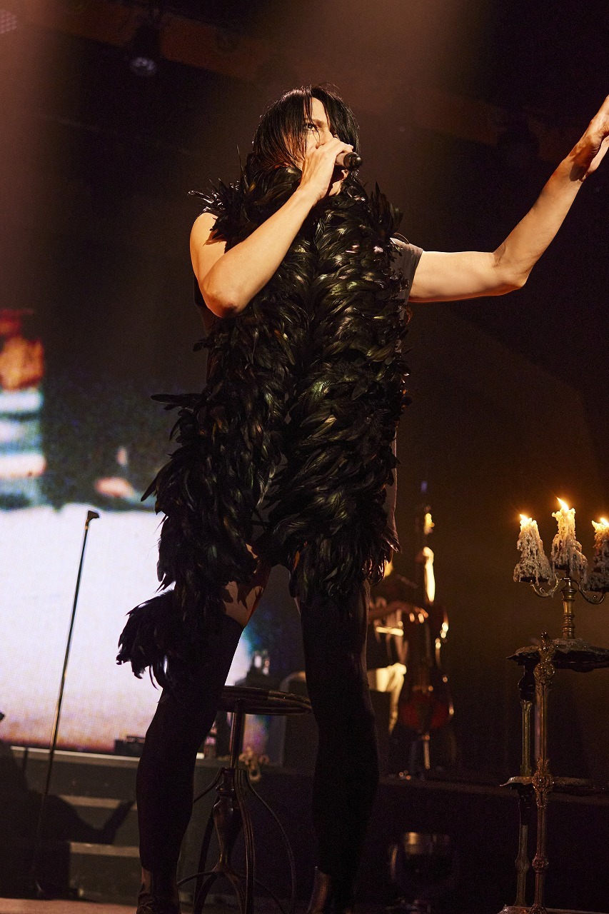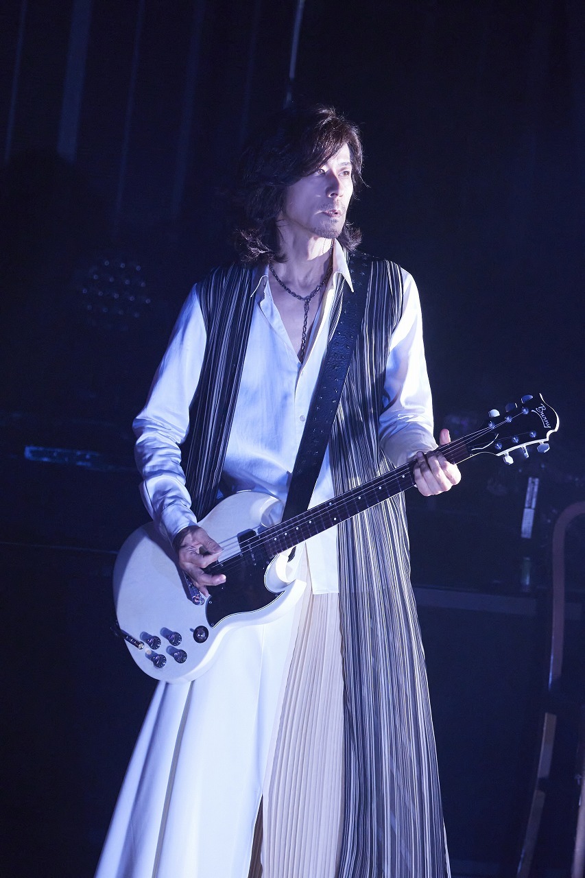 SEの「QUANTUM Ⅰ」が流れた後、ステージ上手から今井寿(Gt)を先頭に、ヤガミ、樋口豊(Ba)、星野英彦(Gt)と順に登場すると、大きな歓声と拍手があがった。4人が定位置につき楽器を手にする間、観客は逸る気持ちを抑えられない様子で、拍手は手拍子へと変わっていた。その音が最高潮に達した頃、センターに櫻井敦司(Vo)が姿を見せた。太腿を露にした黒い衣装に、黒いハットと黒いマラボー姿。一曲目「SCARECROW」の背景に映る案山子のシルエットとシンクロしているようでもあるし、歌詞に出てくる案山子を襲う鴉のようでもある。楽器陣の4人が白い衣装で揃えてきたので、その姿はとりわけ異質に見えた。行き場のない現実に膨らんでいく切迫感を、サビからテンポアップしてギリギリのところまで追い込んでいく。緊張感そのままにインダストリアルナンバー「ワルキューレの騎行」を響かせた後、“ガッガッガガッ”と今井が鳴らしたピックスクラッチを合図に「ICONOCLASM」へ。ツアーでは入っていなかったライヴ定番曲に歓声があがった。さらに中盤の“Five for Japanese Babies”のところを、櫻井が“Five for Takasaki Babies”と歌詞を変えて歌ったものだから、会場の熱もヒートアップ。続く「残骸」もこのツアーでは初出。死と隣り合わせで在りながら、パワフルに命を燃やすこのロックチューンは、『異空 -IZORA-』の世界観に通ずるものがあると感じた。