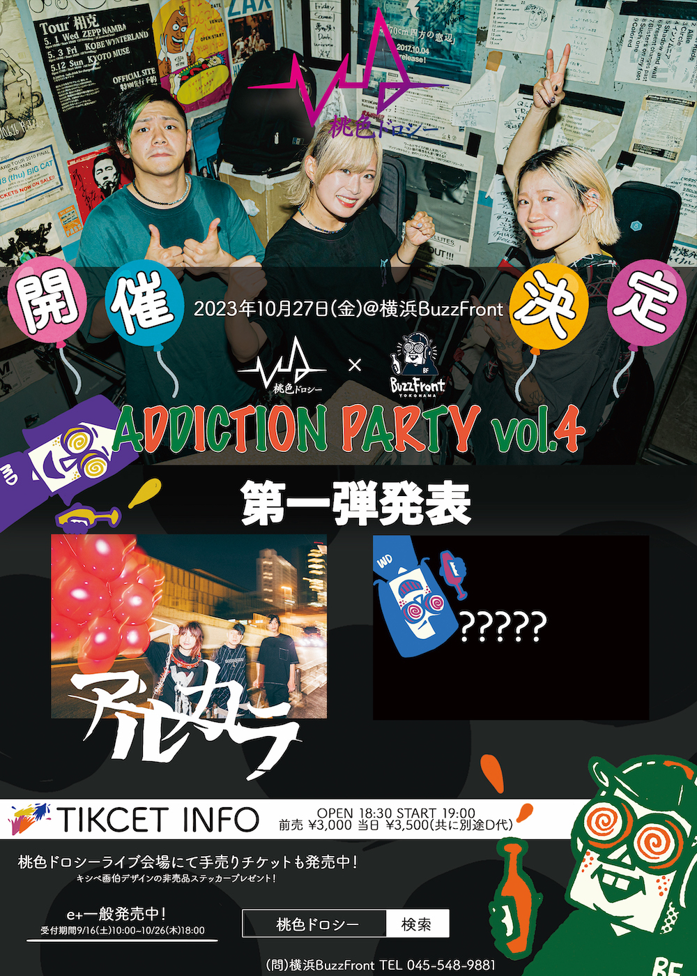 横浜のロックバンド・桃色ドロシーが主催となり横浜BuzzFrontと共同で開催する『ADDICTION PARTY vol.4』にアルカラの出演が決定した。