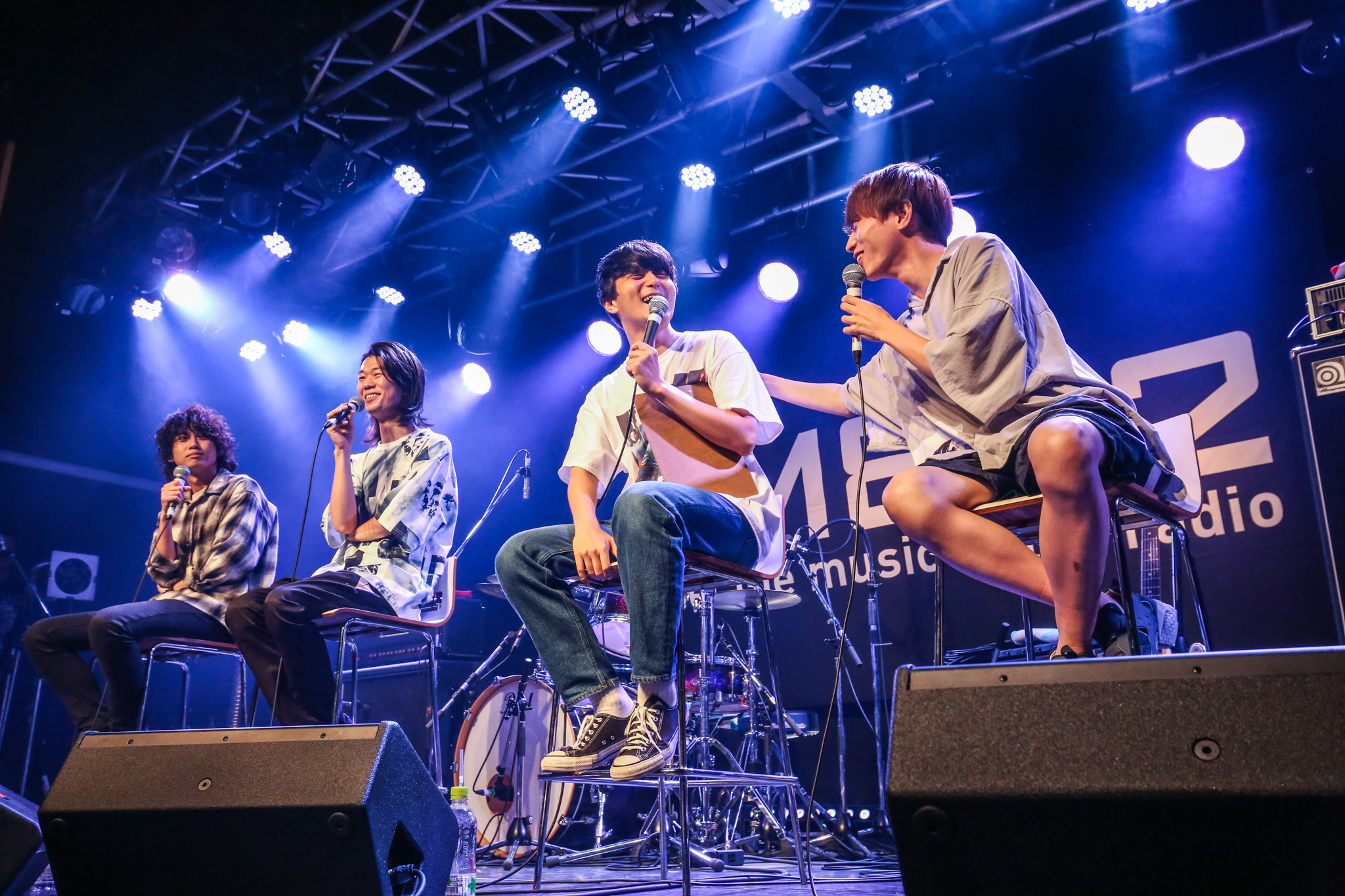 バンド名入りのTシャツを身につけた熱心なファンが多く待ち受けるなか、FM802のDJ・樋口大喜がムツムロを招き入れ、まずはムツムロ一人でのトーク。会場の様子を見て安堵しつつ、昨夜実家で母に言われたという辛口のアドバイスを明かしたら、メンバーを呼び込み「MUSIC FREAKS」の話に。