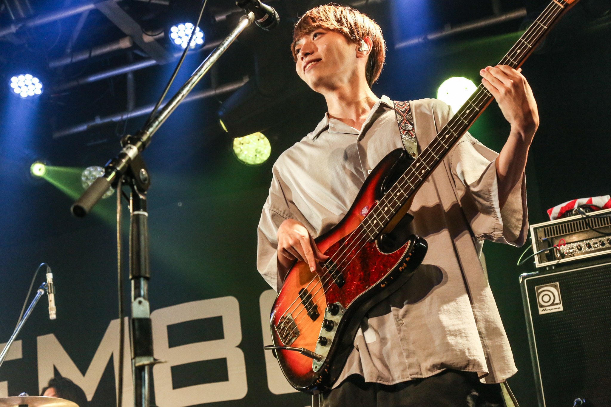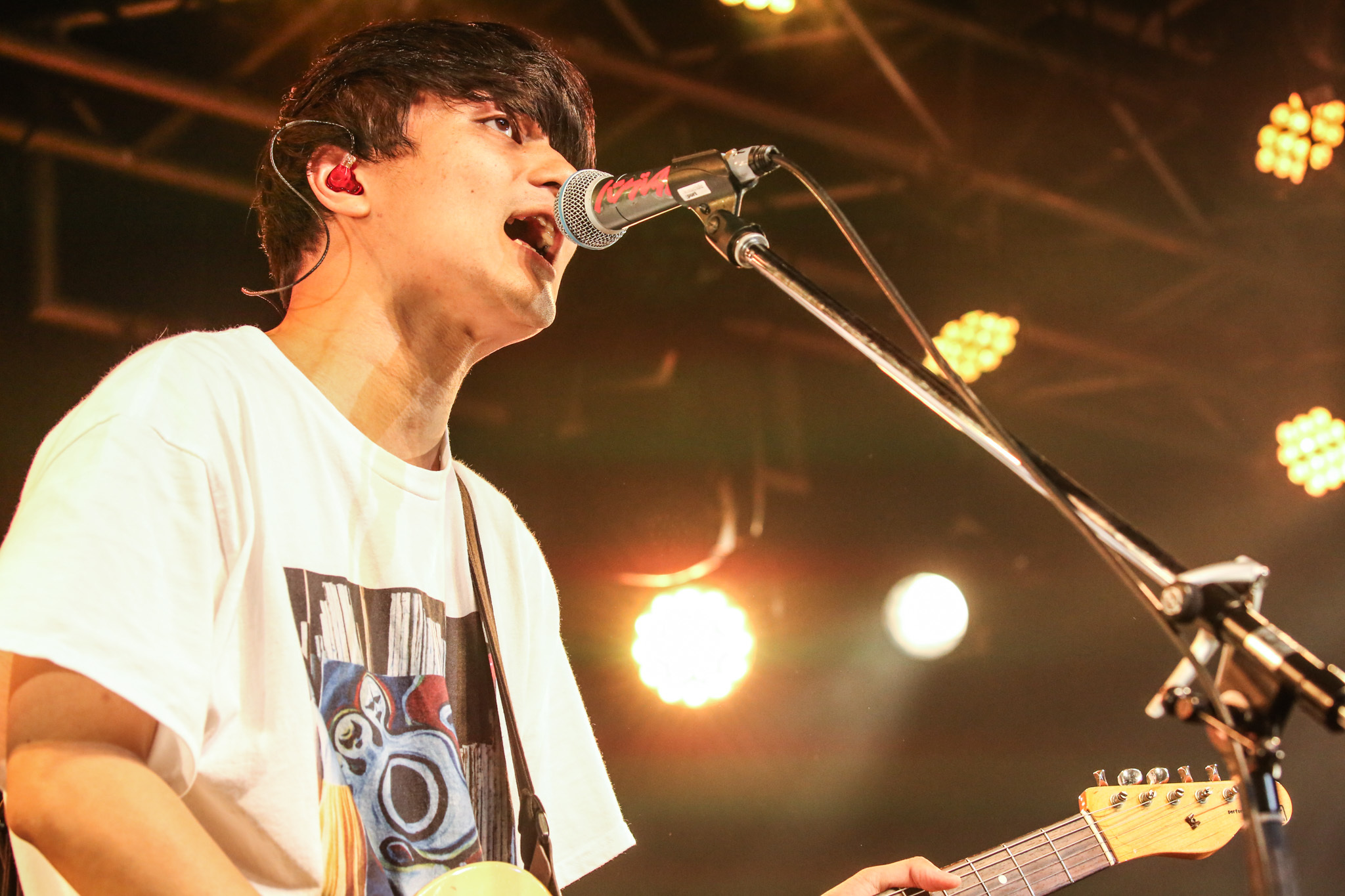 休止後はお待ちかねのライブ。まずは代表曲の一つ 「DAY DREAM BEAT」と 、ライブで人気の「ワールドイズマイン」を立て続ける。キャッチーなメロディや口ずさみたくなる言葉、耳に残るギターリフに触発されて拳が上がり、クラップも大きくなって全員がバウンドし、 さらにMCでも「楽器を持ってると緊張せーへんな(笑)」(ムツムロ)とご機嫌。また ukicasterが舞台裏でのムツムロのバタバタを暴露し、笑いを起こしたら、次は2020年2月のFM802ヘビーローテーションに選曲された「ユースレスマシン」へ。ボーカルが畳みかけ、ギターが歌い、ビートは軽快かつ力強く。バンドのハーモニーもスピードを増すようだ。