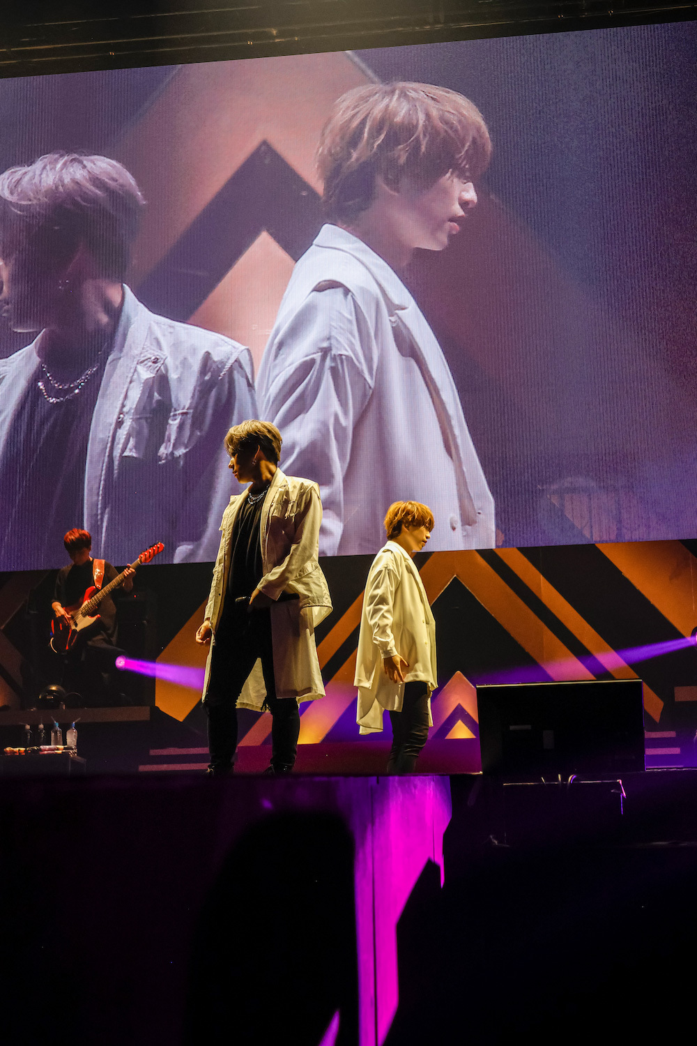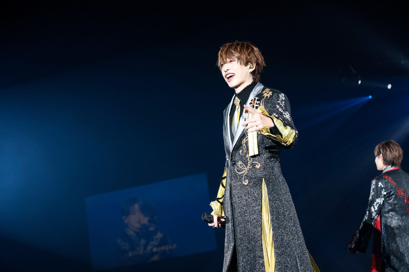 ロングコートを脱ぎ艶っぽい歌声を響かせた「シャドウ」は、センラが作詞・作曲をしたナンバー。4人で描く悲哀の色は、切なく美しい。ポップな「シンデレラステップ」からの「獣王無尽」では、またまたファイヤーボールが豪快に噴き上がる中、途端にワイルドモードに。4人それぞれが口にする殺し文句にも、射貫かれてしまう。『Plusss』に収録の「シャドウ」といい「獣王無尽」といい、どんどん表現の幅を広げていく4人が眩しい。