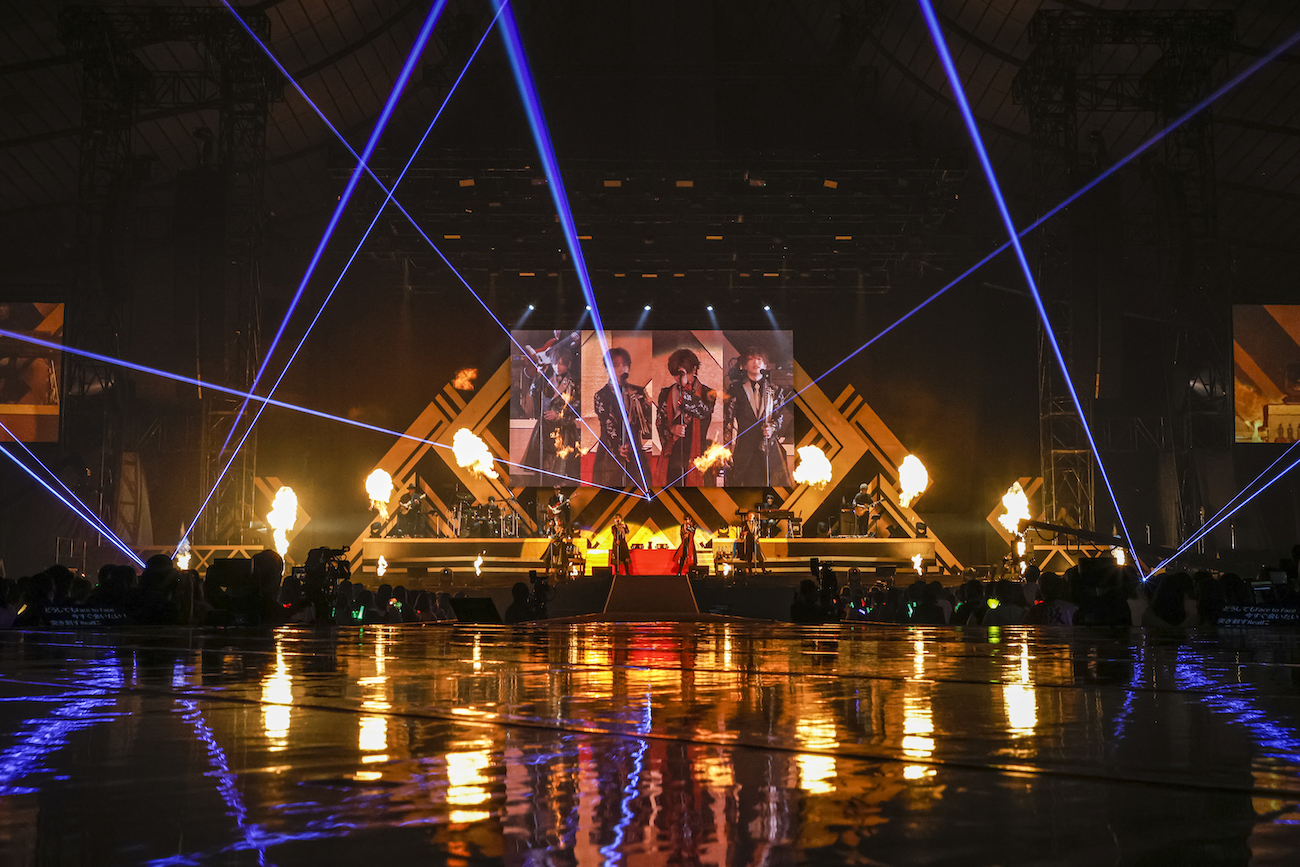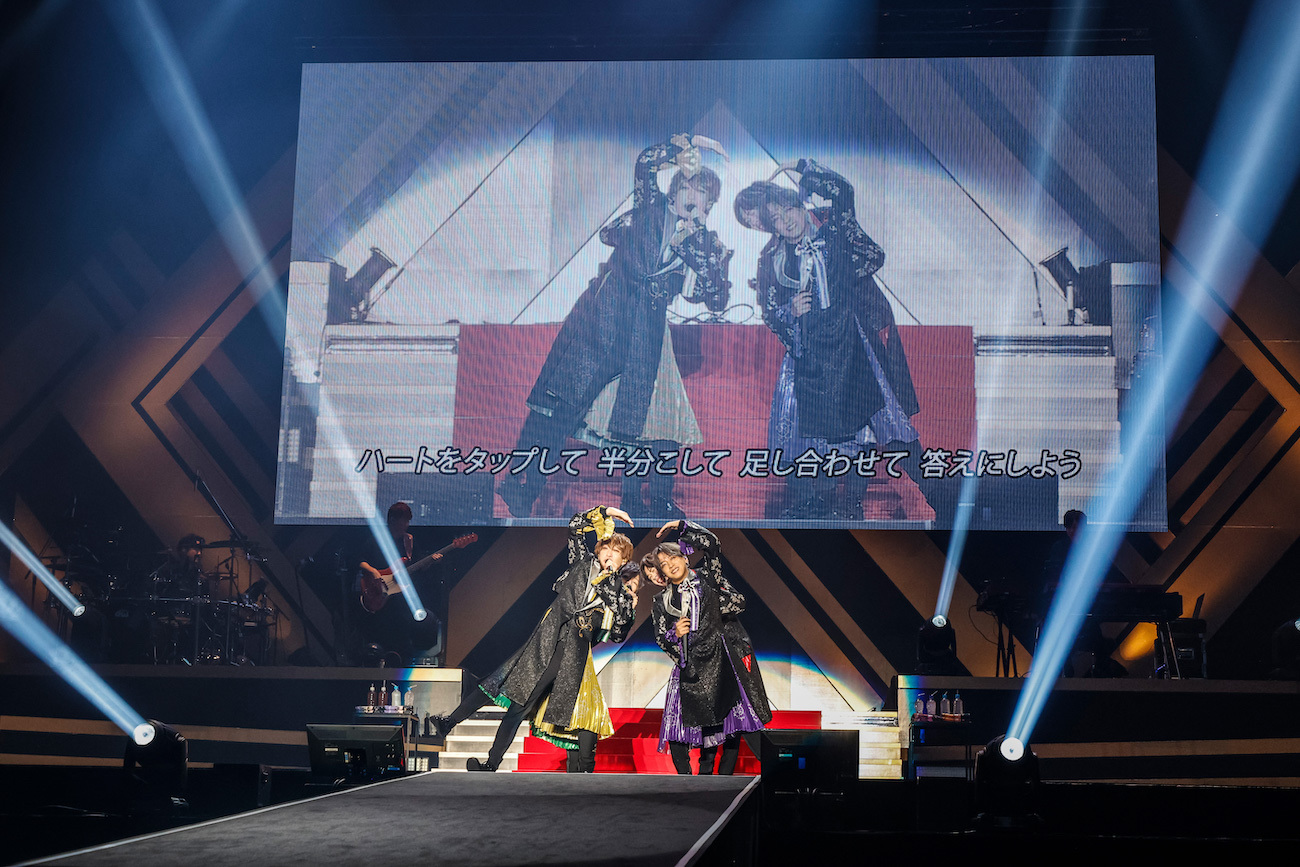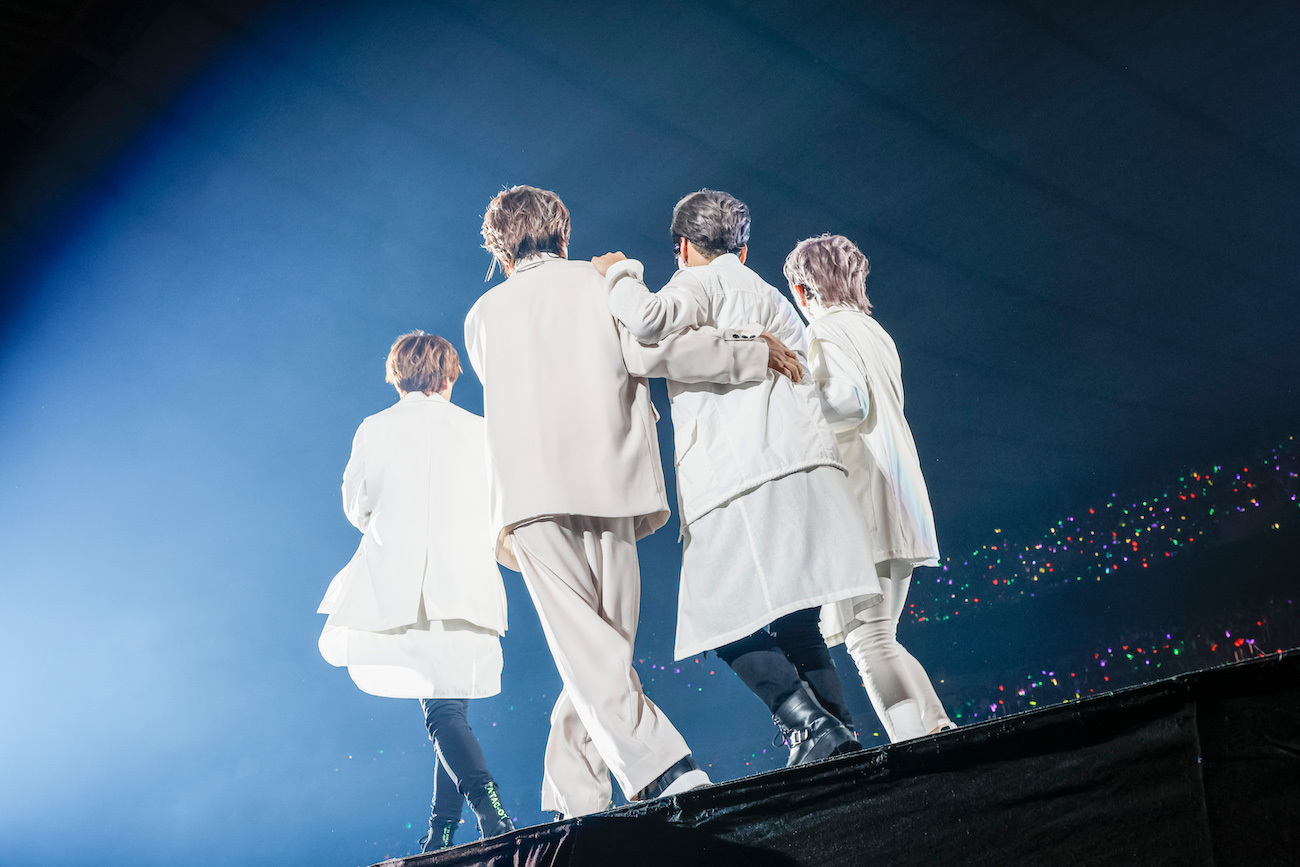メンバーとcrewの息がぴったりすぎるコール&レスポンスが起こった「Q for U」、<絶対好きを枯らさない><絶対そばで楽しませる>という4人の誓いがいつにも増して強く響いた「世界で一番好きな名前」とたたみかけ、「千本桜 -guitar rock arrangement ver.-」では、メンバーがアリーナ客席通路をトロッコで進み、crewの轟くようなメンバーコールに笑顔を見せる。「SHINY」ではメインステージから花道を通ってセンターステージへと向かい、「明日へのBye Bye」では演出のファイヤーボールが噴き上がる中、マイクスタンドで歌う姿がさまになりすぎる4人。息もつかせぬ展開に、客席ではメンバーカラーを灯したペンライトがますます大きく揺れる。