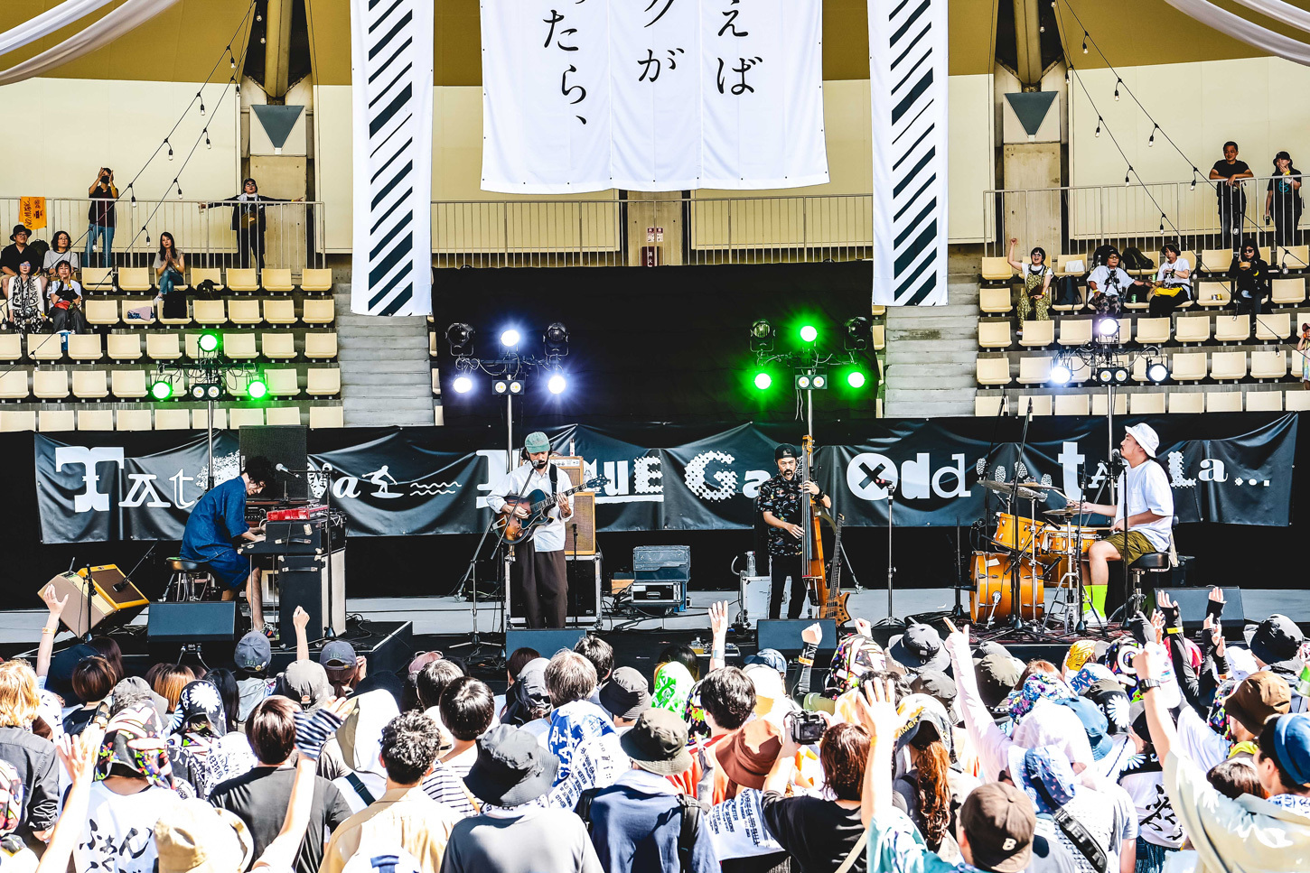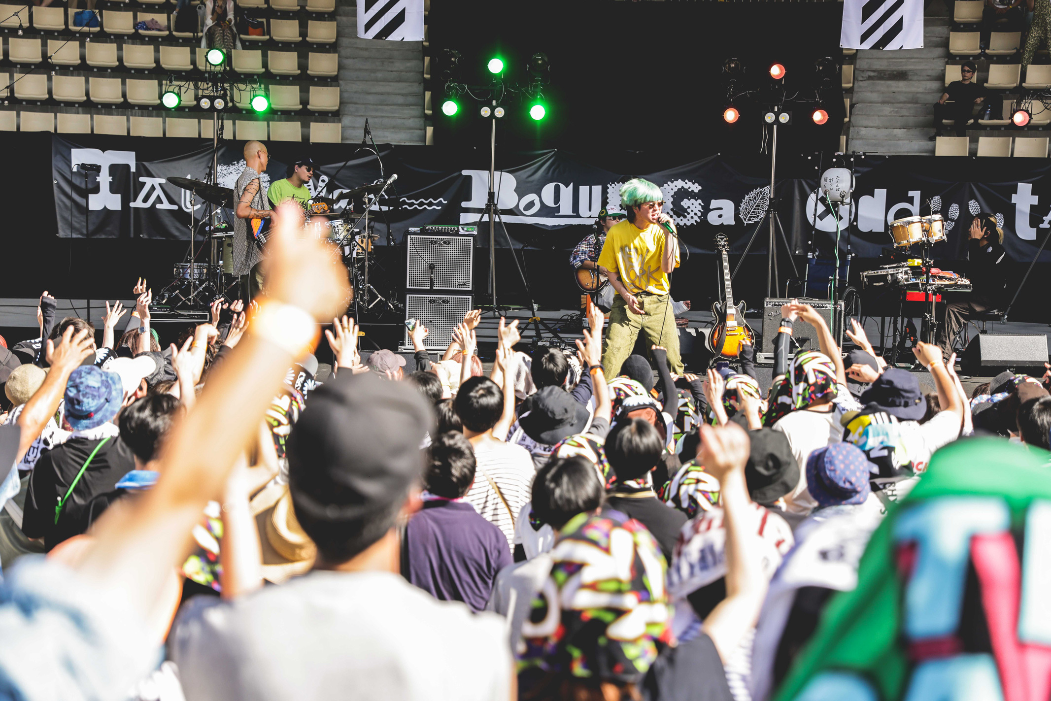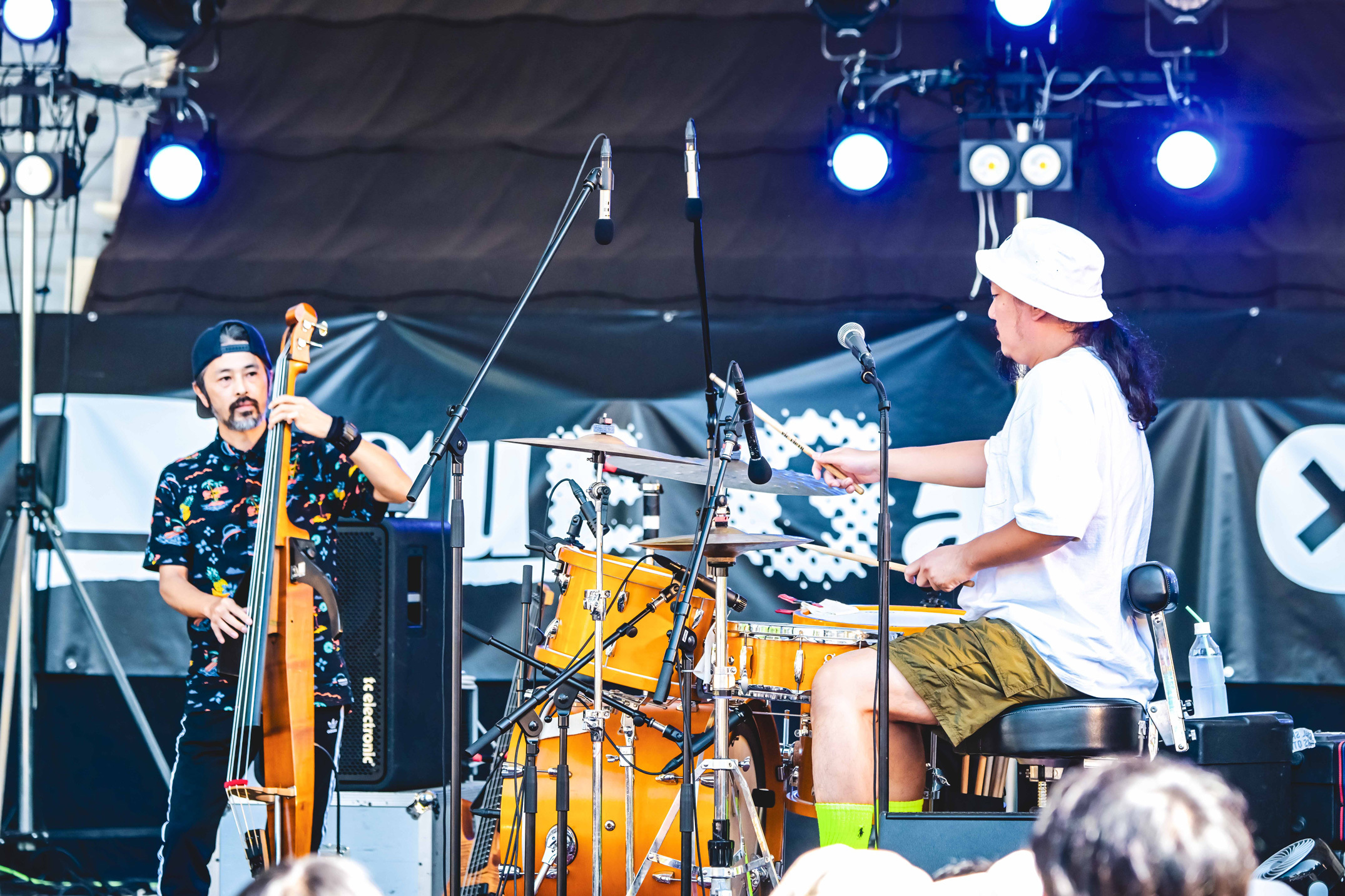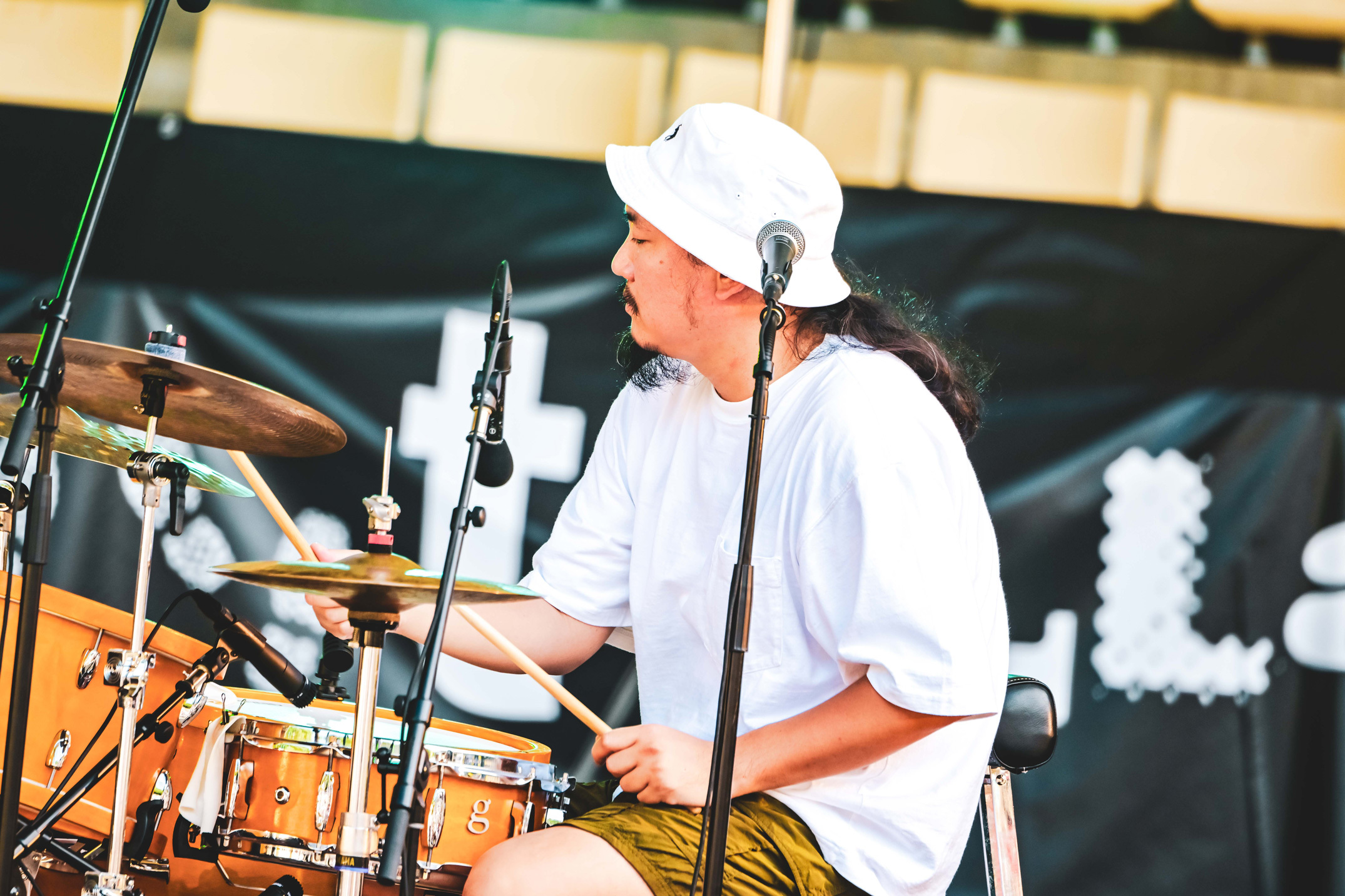 「ホーム感が出てきた」と内田怜央(Gt.Vo)も笑顔を見せたが、前回の出場に引き続き『ボク踊』の舞台がとにかく似合う。今回の緑地野音はステージが低く、オーディエンスとの距離も近いからこそまた他にはない一体感があり、Kroiの新たな一面が引き出されていたようにも思う。ラスト「Fire Brain」でのシャウトと、ギブス姿の長谷部も立ち上がるほどの全身全霊のプレイの爆発力には、フロアから続々と拳が突き上がる。堂々たる痛快なステージを駆け抜けていった。