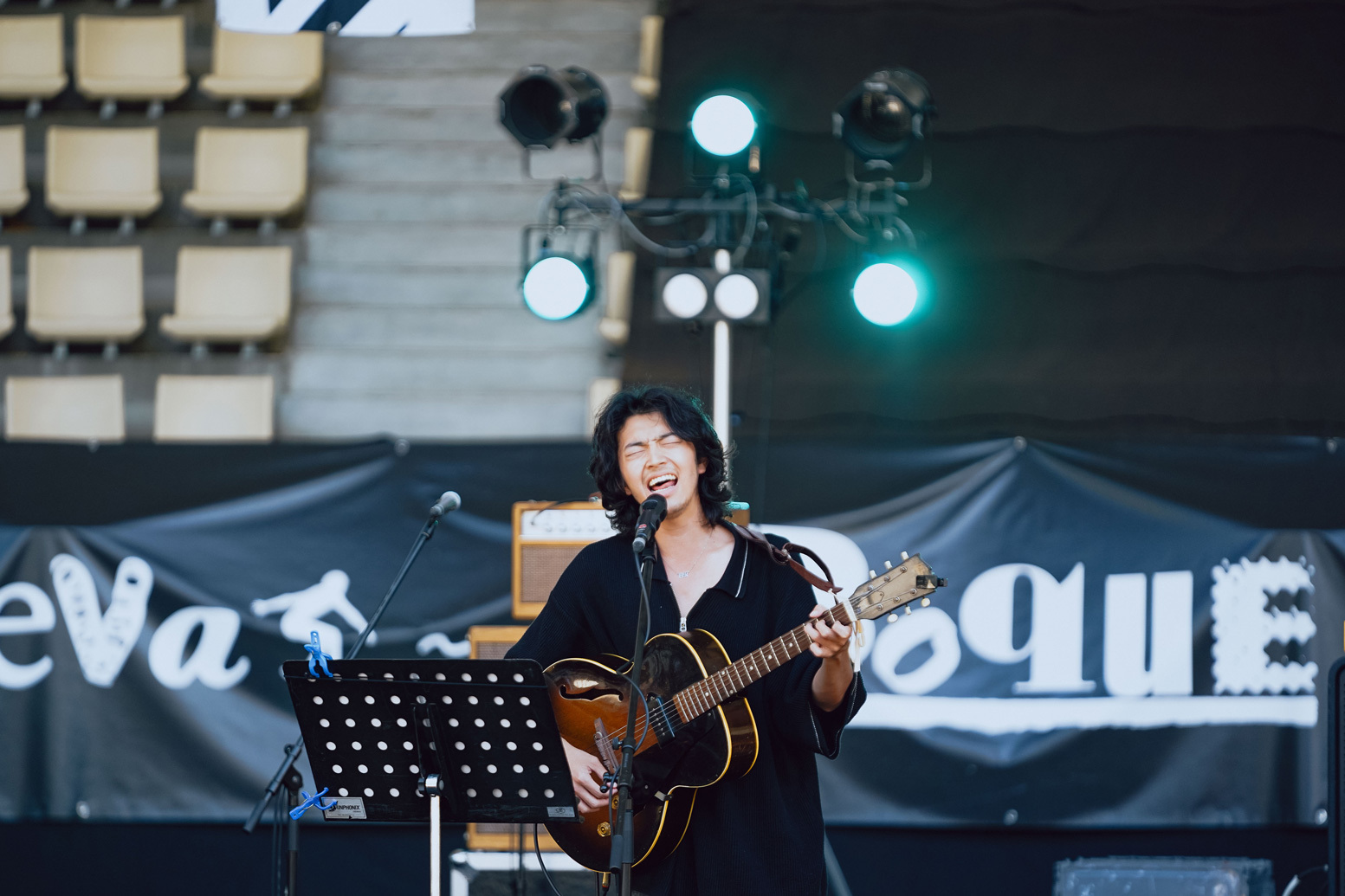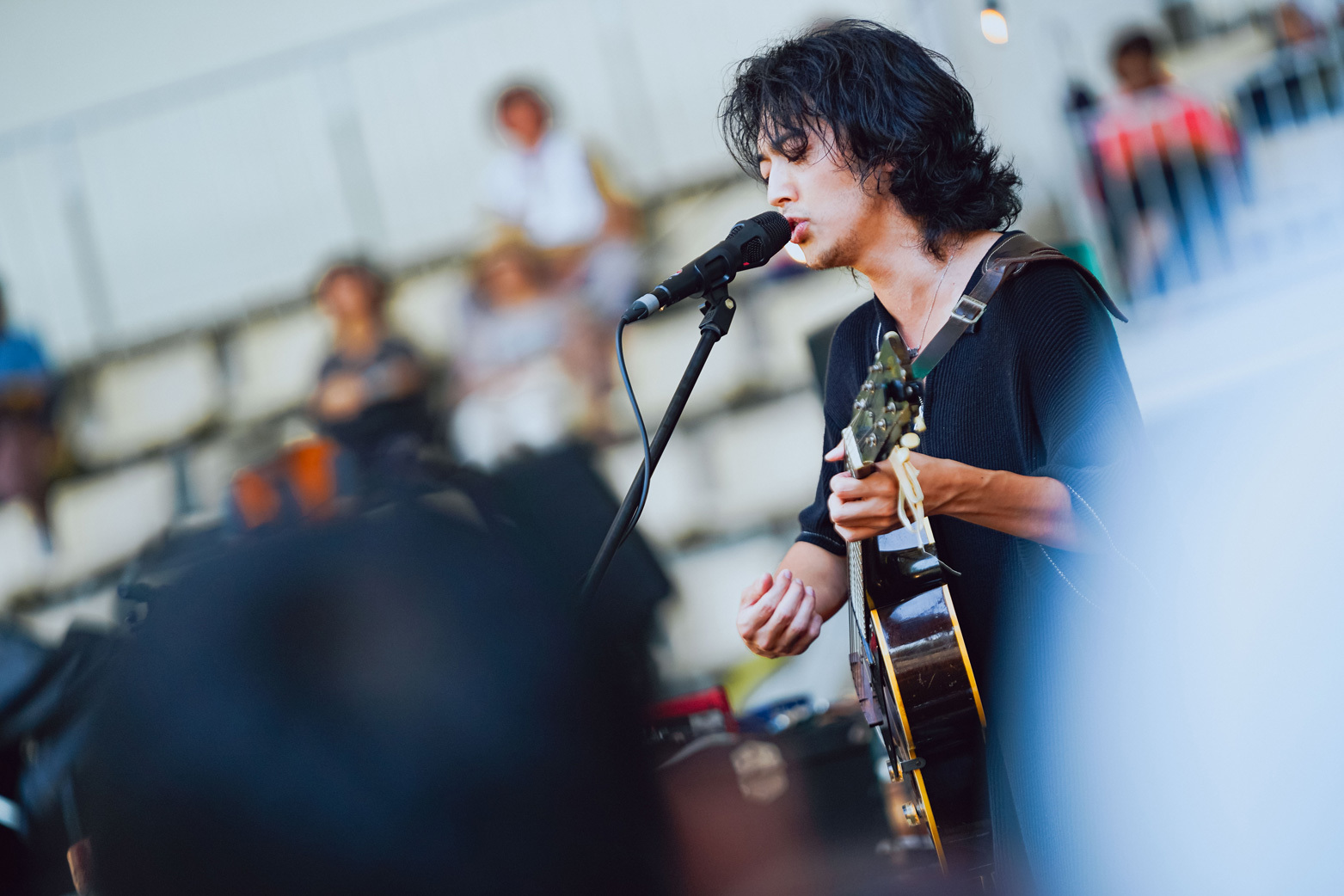 「福岡出身なので、福岡の町の曲を」と「天神」から始まり、「次は好きな曲を」と奇妙礼太郎の「君が誰かの彼女になりくさっても」を歌い上げる。さらに「ソロでしかやらない曲を」と「Kissbug」、荒谷が作詞作曲を担当したKing & Princeの「Kiss & Kill」など、弾き語りならではの贅沢なステージが続く。「caffe latte」からはフィーチャリング多数参加の「tokyo」をひとりで歌いきり、なんと最後は「チバさんの回復を願って」と祈りを添え、THEE MICHELLE GUN ELEPHANTの「世界の終わり」をカバー。トップバッターから早くも拍手喝采が巻き起こる、エモーショナルな幕開けに。