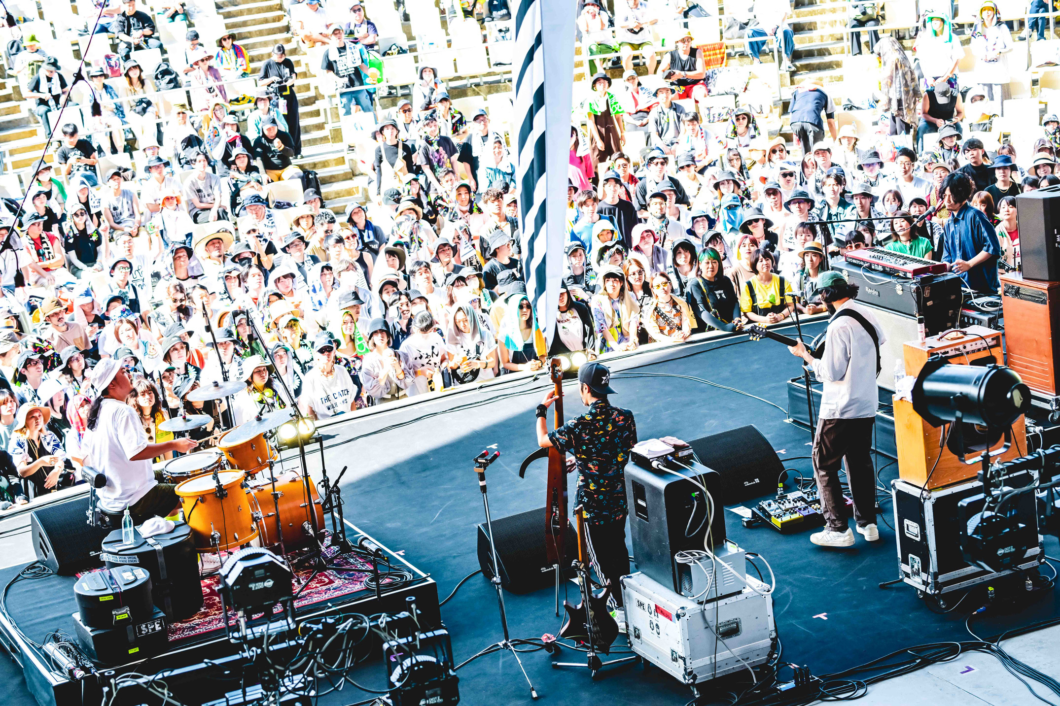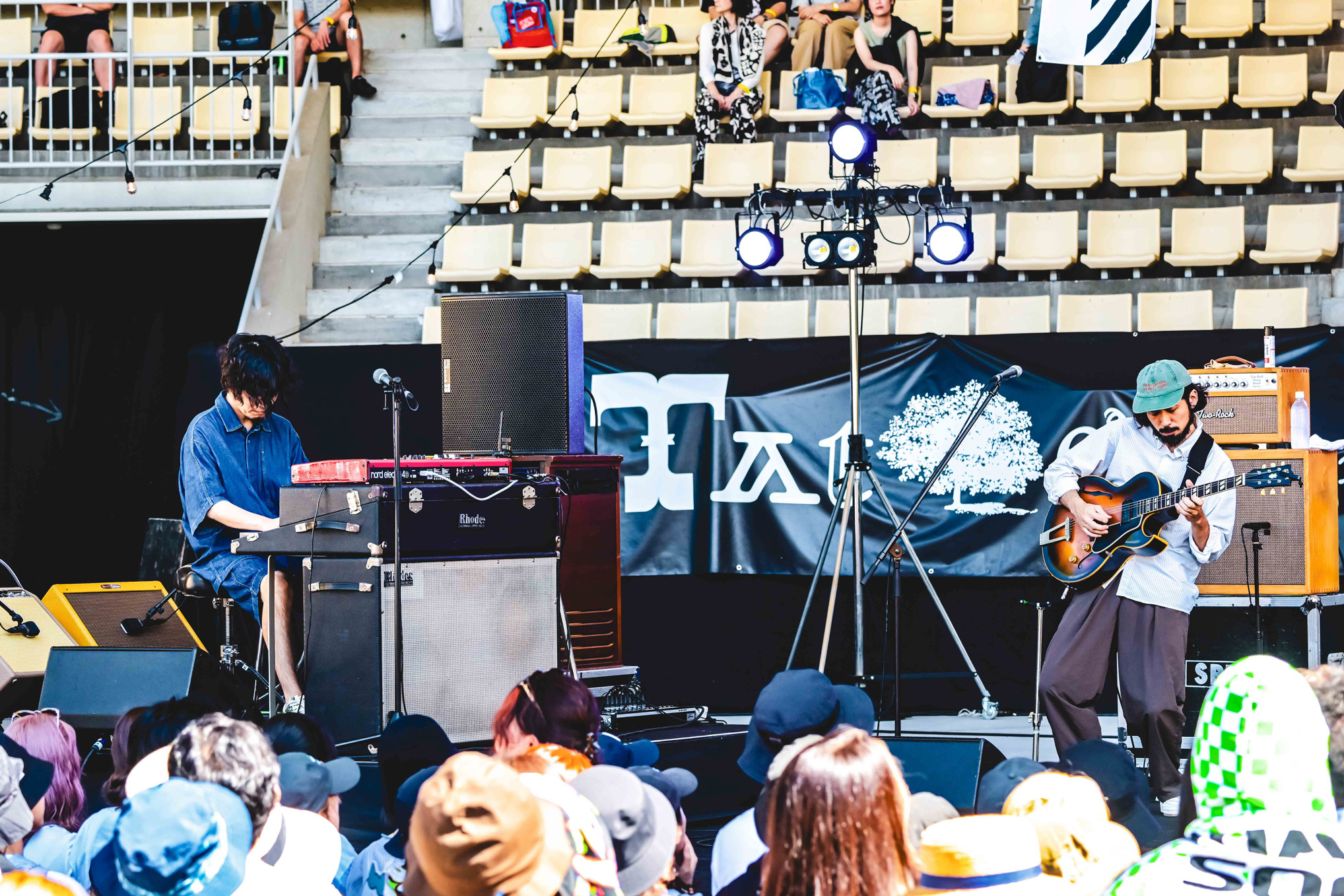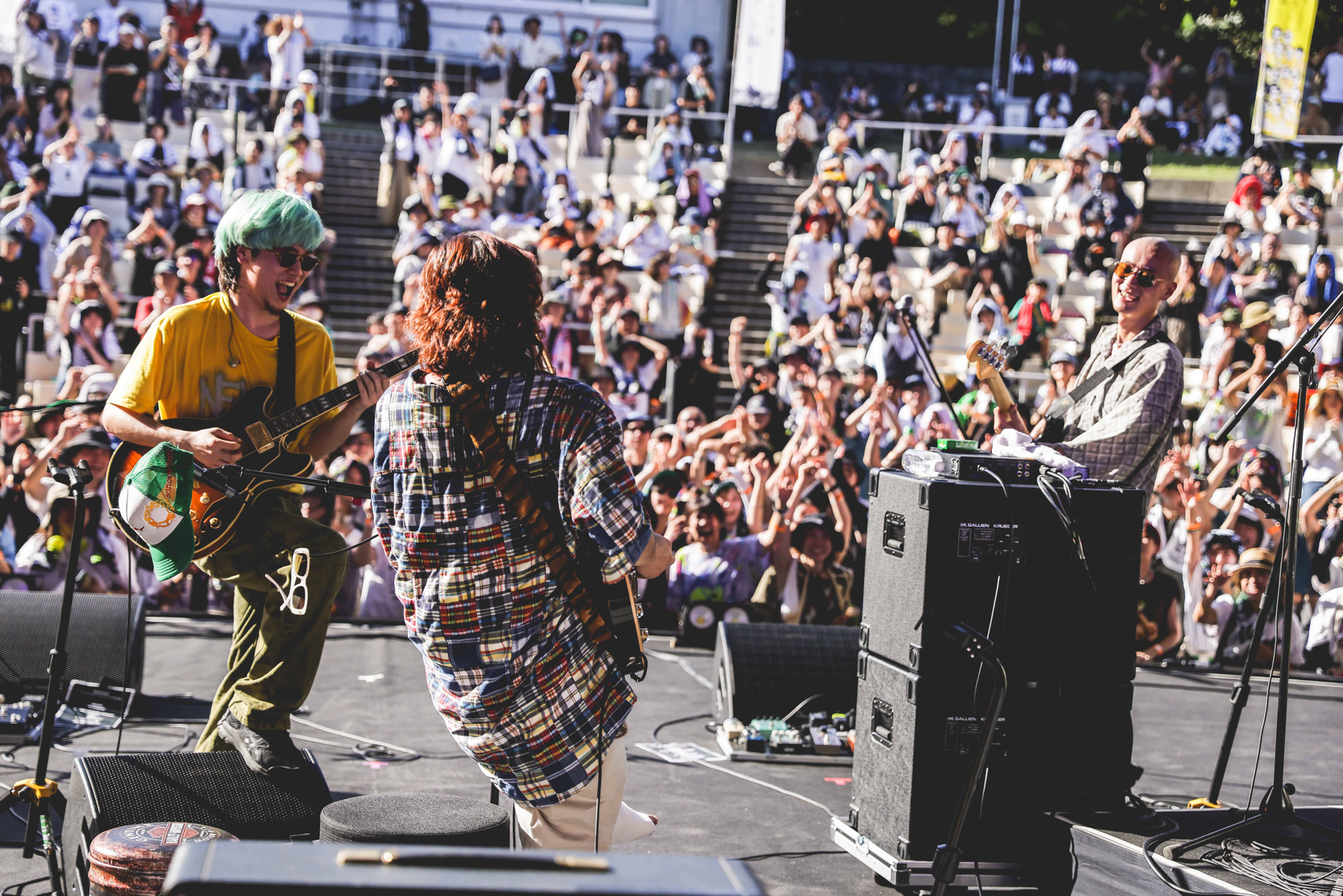 MCでは「いつもいつも気持ちいい音が鳴っていて、毎年近い仲間たちが集まって一緒に音を出せる機会を作っていただけていることを嬉しく思います。どうか続けてくれてるスタッフのみなさんに大きな拍手を」とイベントへの想いを届け、Kroiの内田怜央を呼び込む。社長が顧問を務める『ONE PARK FESTIVAL』にKroiが出演した際のことを振り返りながら、少し緊張気味な怜央としばしトーク。ゆるりとした流れから、「闘病中のチバさんに捧げます」(社長)と「LOVE ROCKETS」のイントロが流れた瞬間のざわめきの大きさたるや。「チバさんに届けー!」と歌われ、ぶつけられたロックンロールにみんながみんな狂喜乱舞の盛り上がりに。勢いはそのままに、ラストの「SUMMER GODDESS」まで熱気と幸福感は高まりっぱなしとなる。