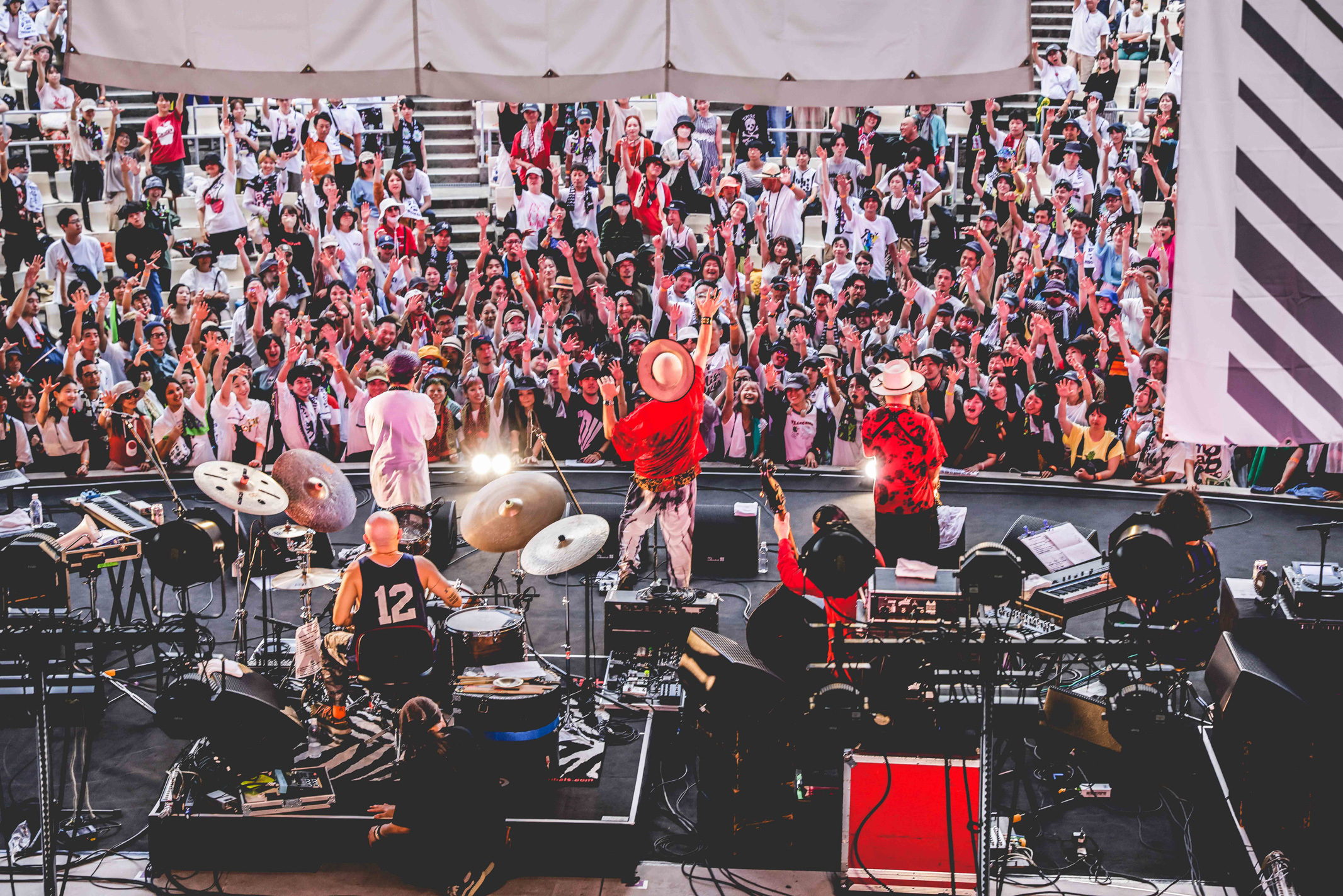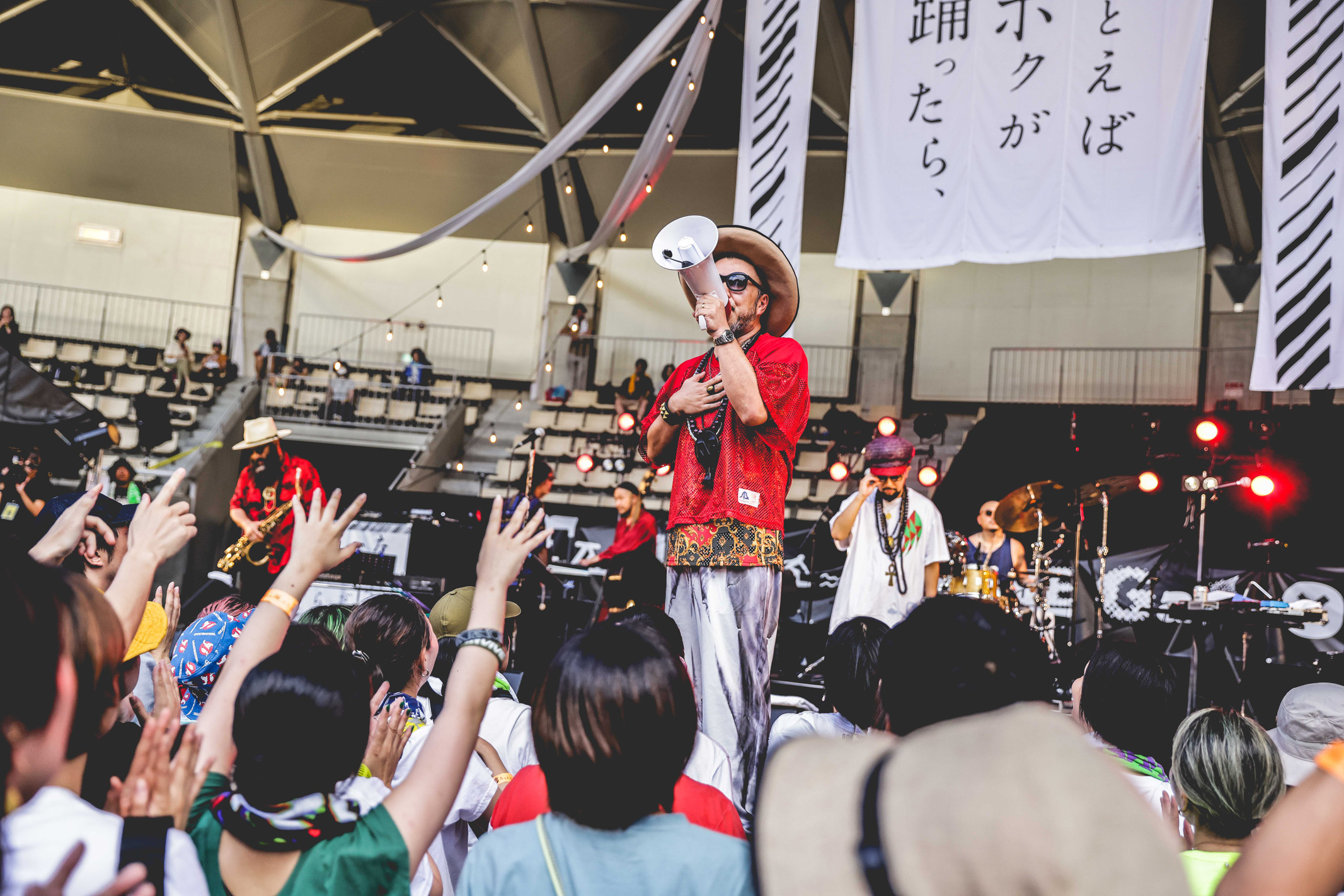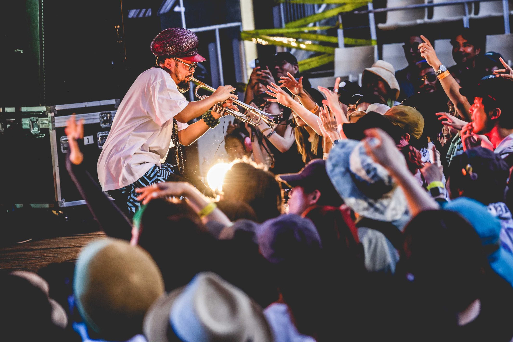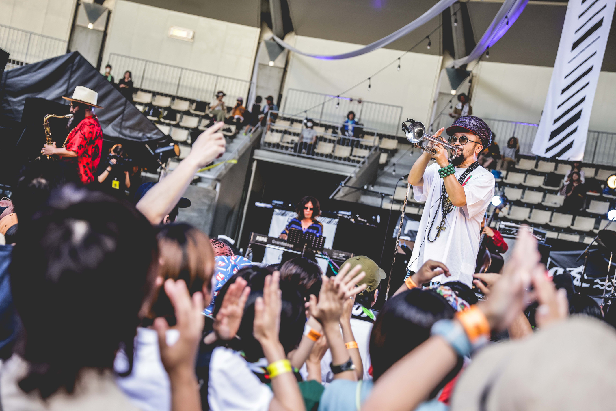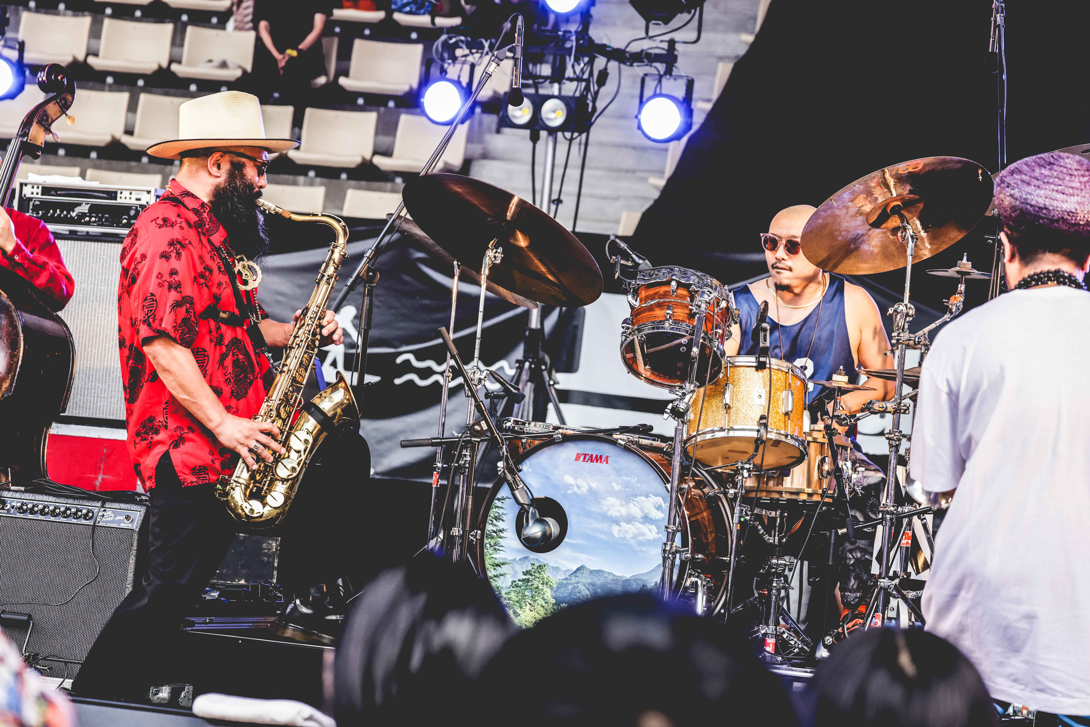 そして、いよいよSOIL&"PIMP"SESSIONS。社長も「めっちゃ気持ちいい」と声を漏らしたほど、夕暮れ時に浴びるソイルは格別だ。1曲目「Meiji-Jingumae 'Harajuku'」からフロアが波のように揺れ、歓喜の声で溢れかえる。「みんなひとりひとりがこの場を作ってくれてます!」(社長)の言葉通り、集まったオーディエンスひとりひとりが自由に音楽を楽しむ一体感のエネルギーが凄まじい。打ち鳴らされるリズム、突き抜けるホーン、美しい鍵盤のひとつひとつがキマるたびに、手が上がり歓声が沸く最高潮の連続に。