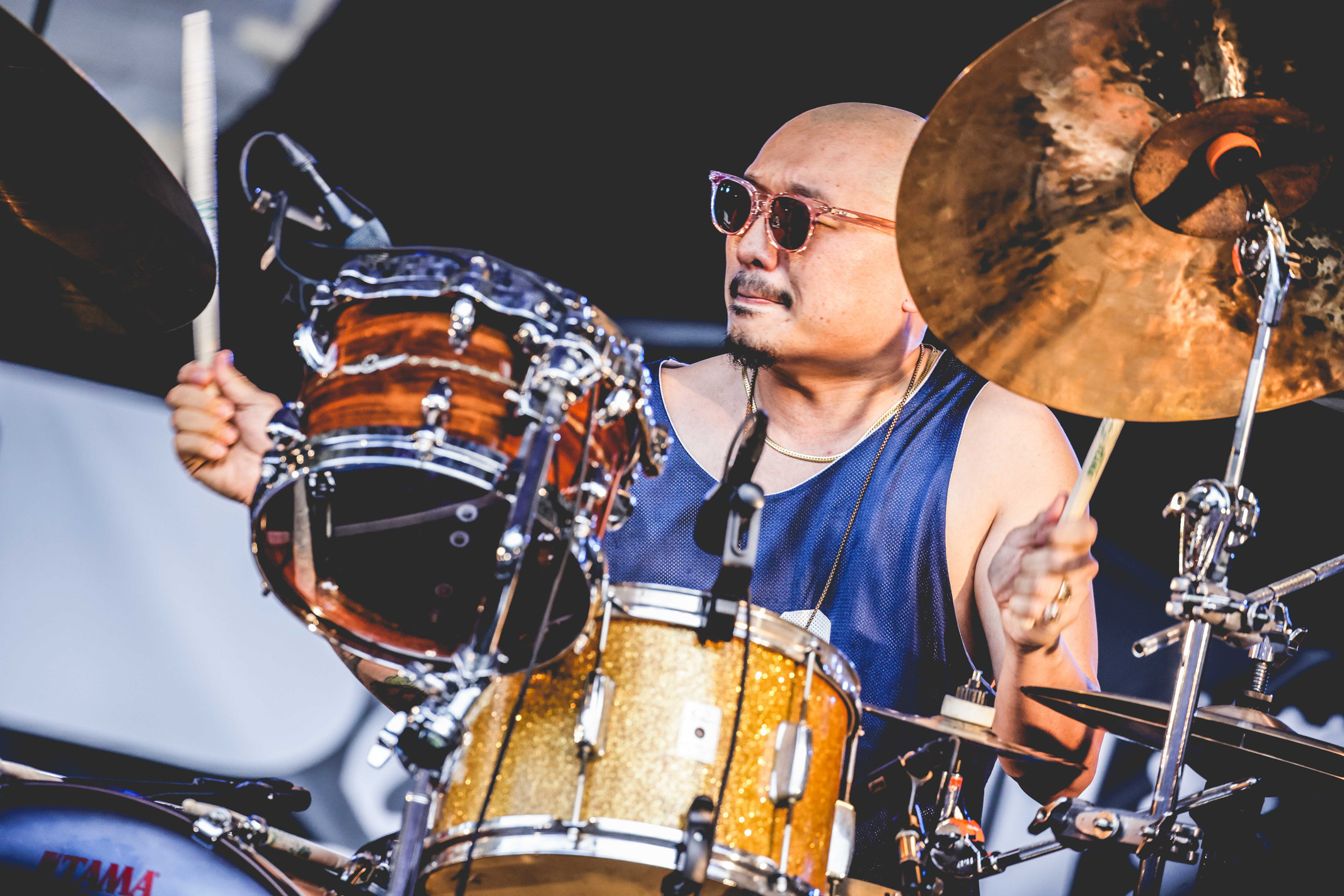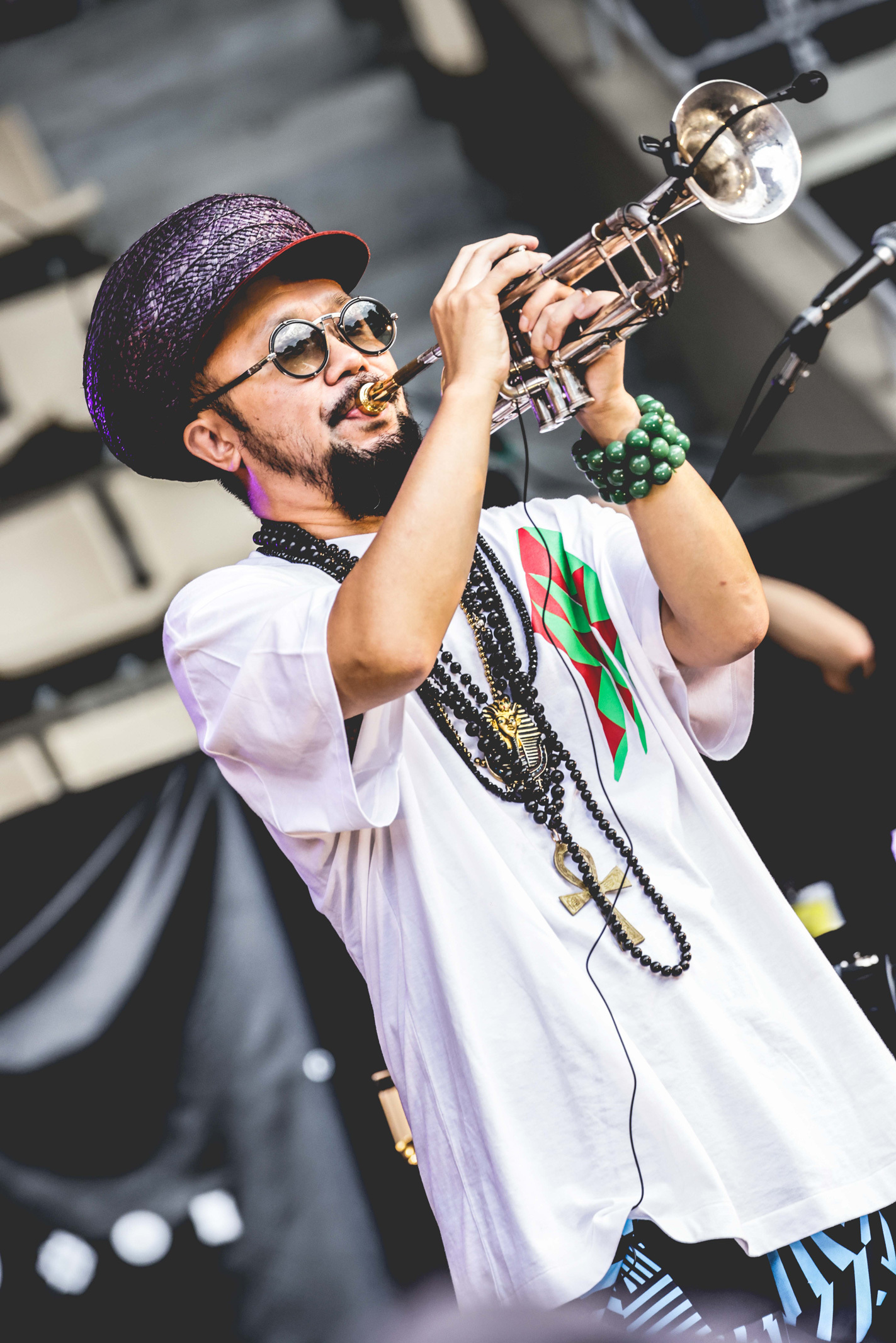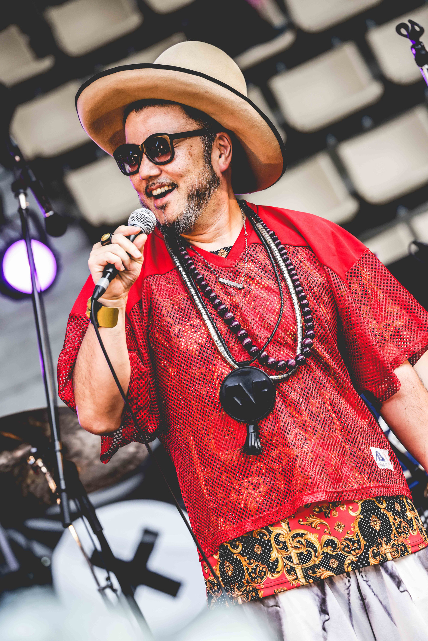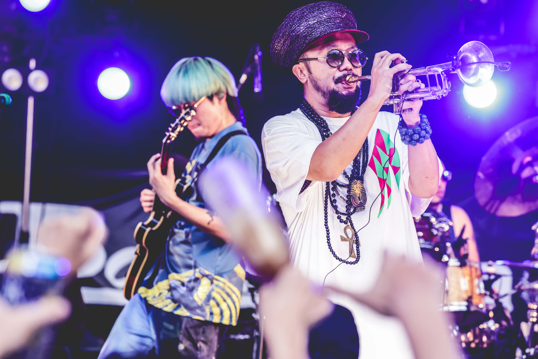そして、いよいよSOIL&"PIMP"SESSIONS。社長も「めっちゃ気持ちいい」と声を漏らしたほど、夕暮れ時に浴びるソイルは格別だ。1曲目「Meiji-Jingumae 'Harajuku'」からフロアが波のように揺れ、歓喜の声で溢れかえる。「みんなひとりひとりがこの場を作ってくれてます!」(社長)の言葉通り、集まったオーディエンスひとりひとりが自由に音楽を楽しむ一体感のエネルギーが凄まじい。打ち鳴らされるリズム、突き抜けるホーン、美しい鍵盤のひとつひとつがキマるたびに、手が上がり歓声が沸く最高潮の連続に。