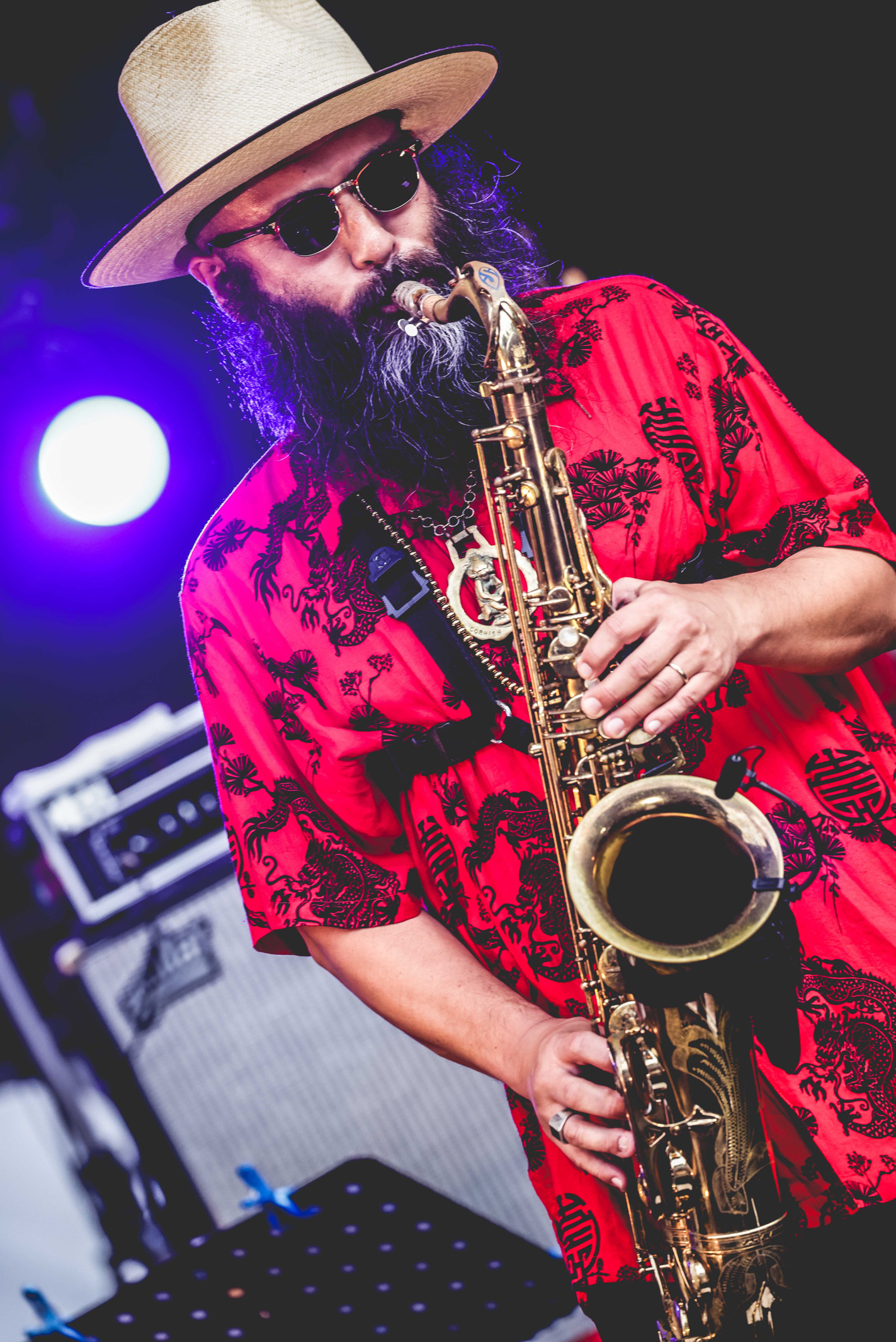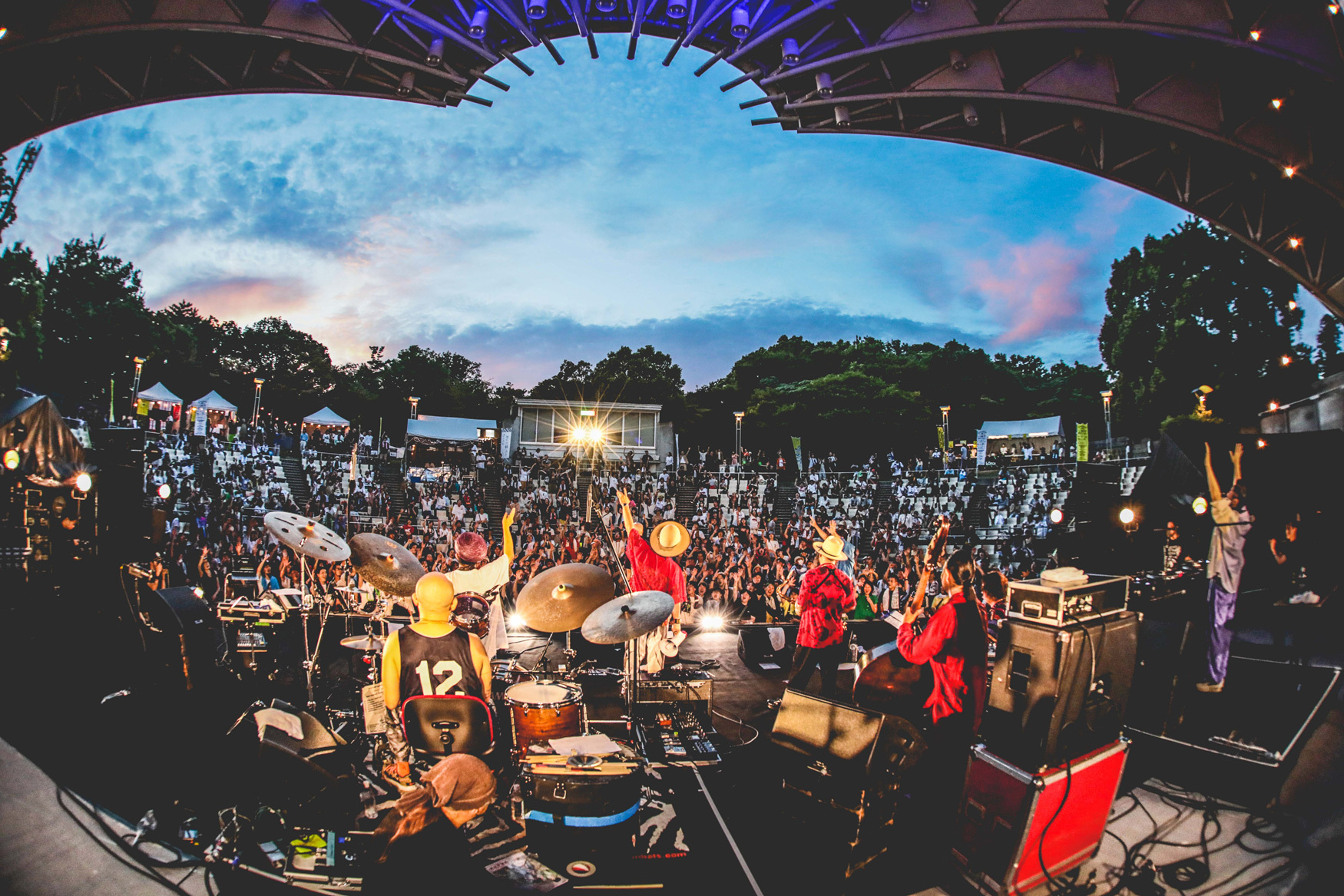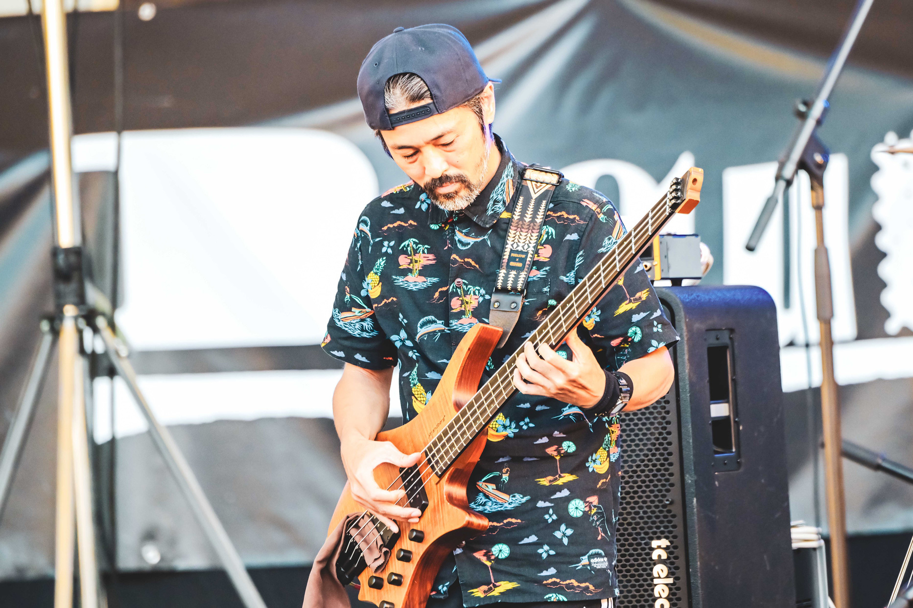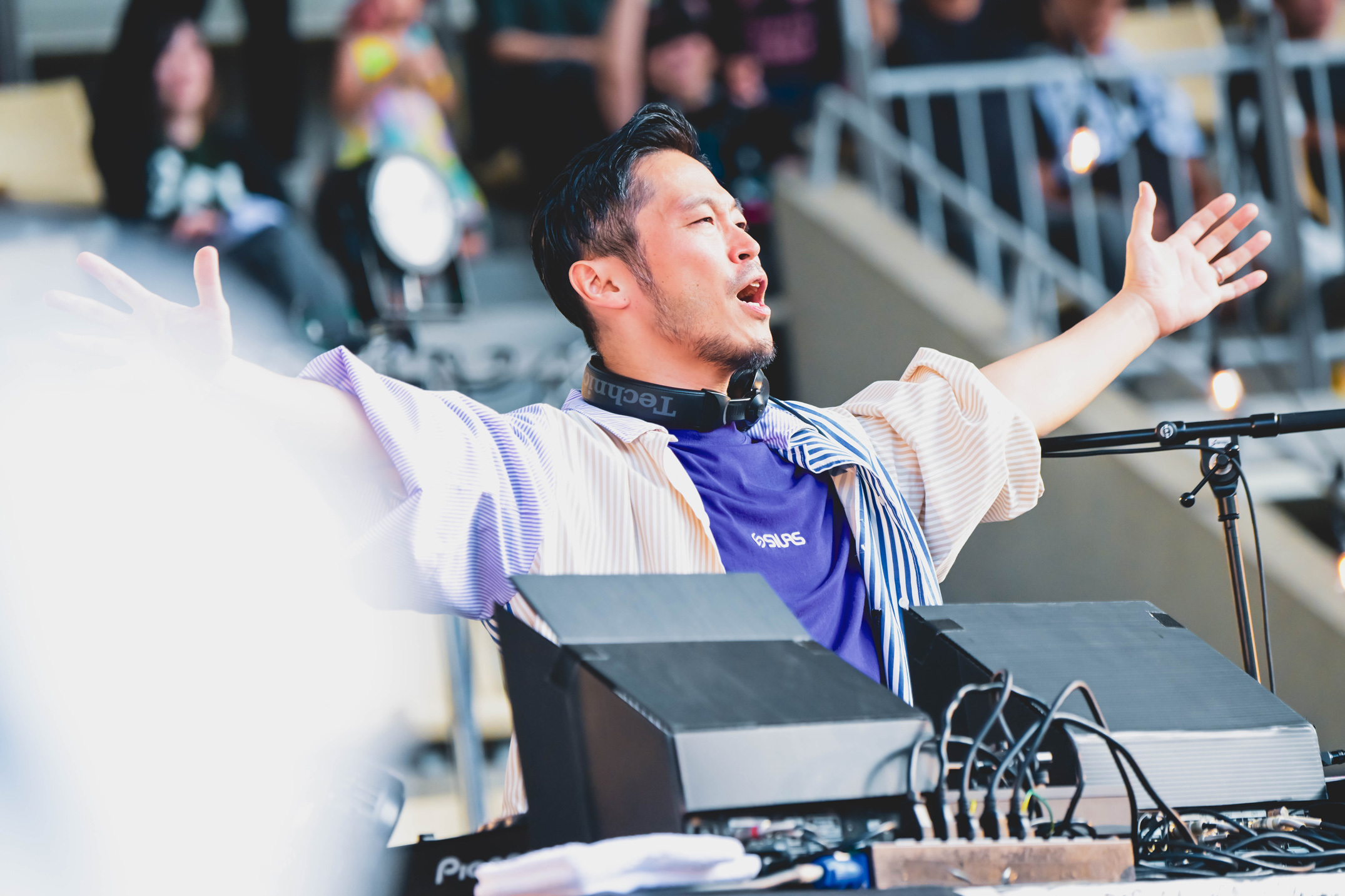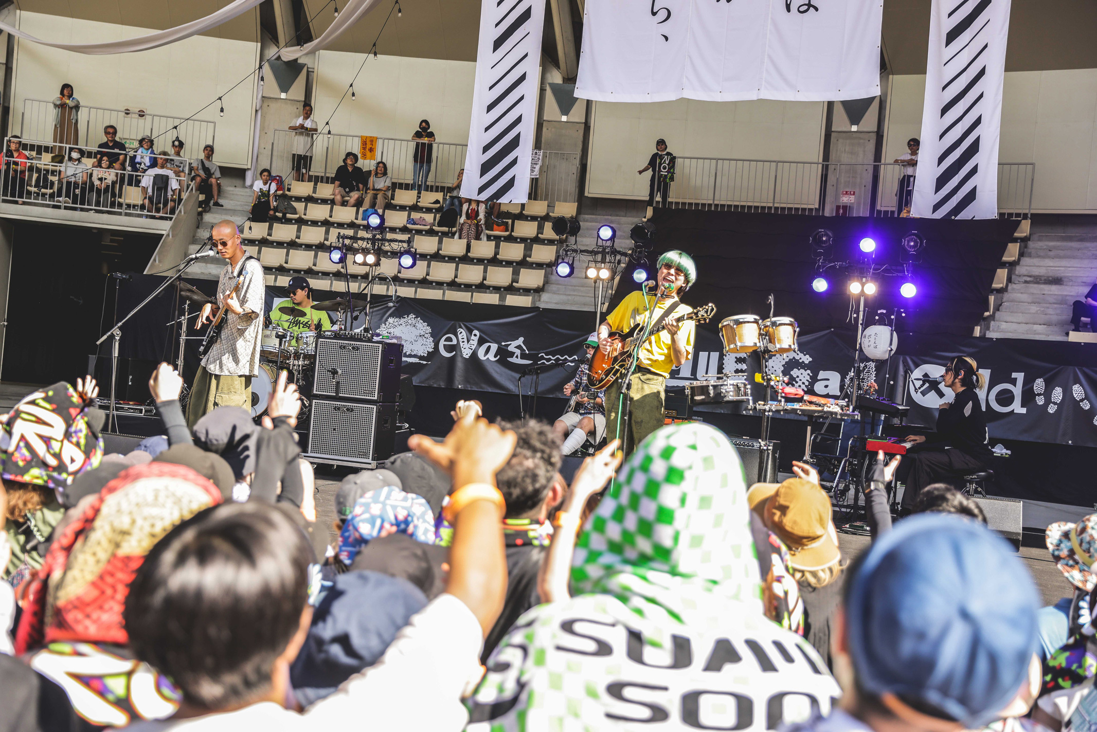 そして、いよいよSOIL&"PIMP"SESSIONS。社長も「めっちゃ気持ちいい」と声を漏らしたほど、夕暮れ時に浴びるソイルは格別だ。1曲目「Meiji-Jingumae 'Harajuku'」からフロアが波のように揺れ、歓喜の声で溢れかえる。「みんなひとりひとりがこの場を作ってくれてます!」(社長)の言葉通り、集まったオーディエンスひとりひとりが自由に音楽を楽しむ一体感のエネルギーが凄まじい。打ち鳴らされるリズム、突き抜けるホーン、美しい鍵盤のひとつひとつがキマるたびに、手が上がり歓声が沸く最高潮の連続に。