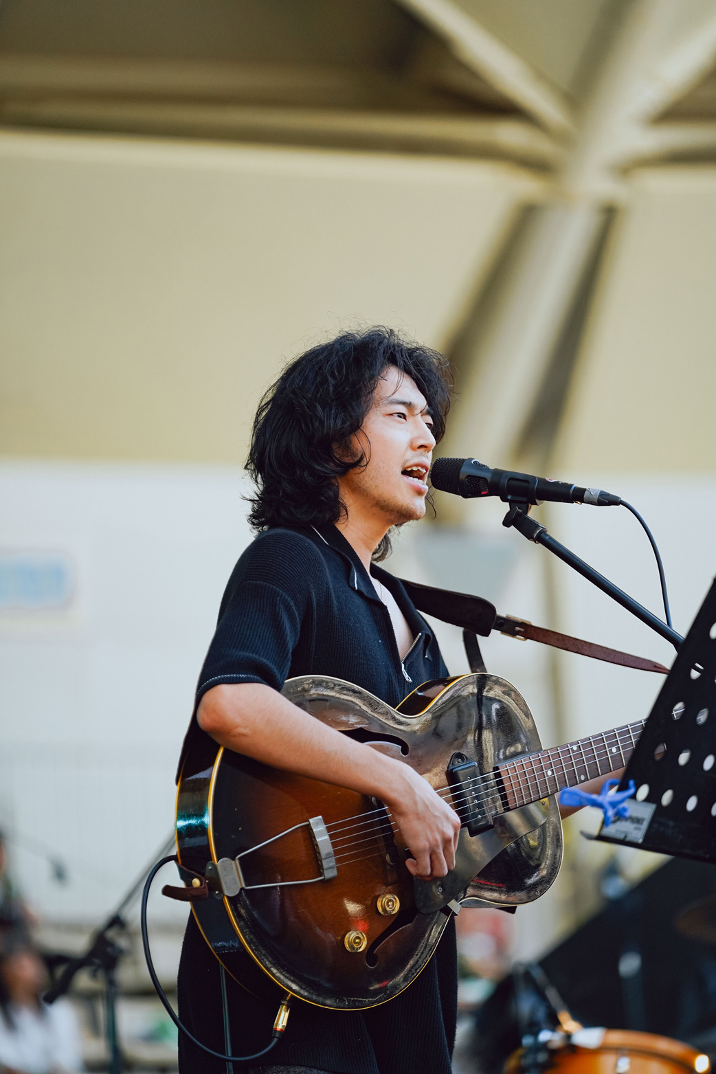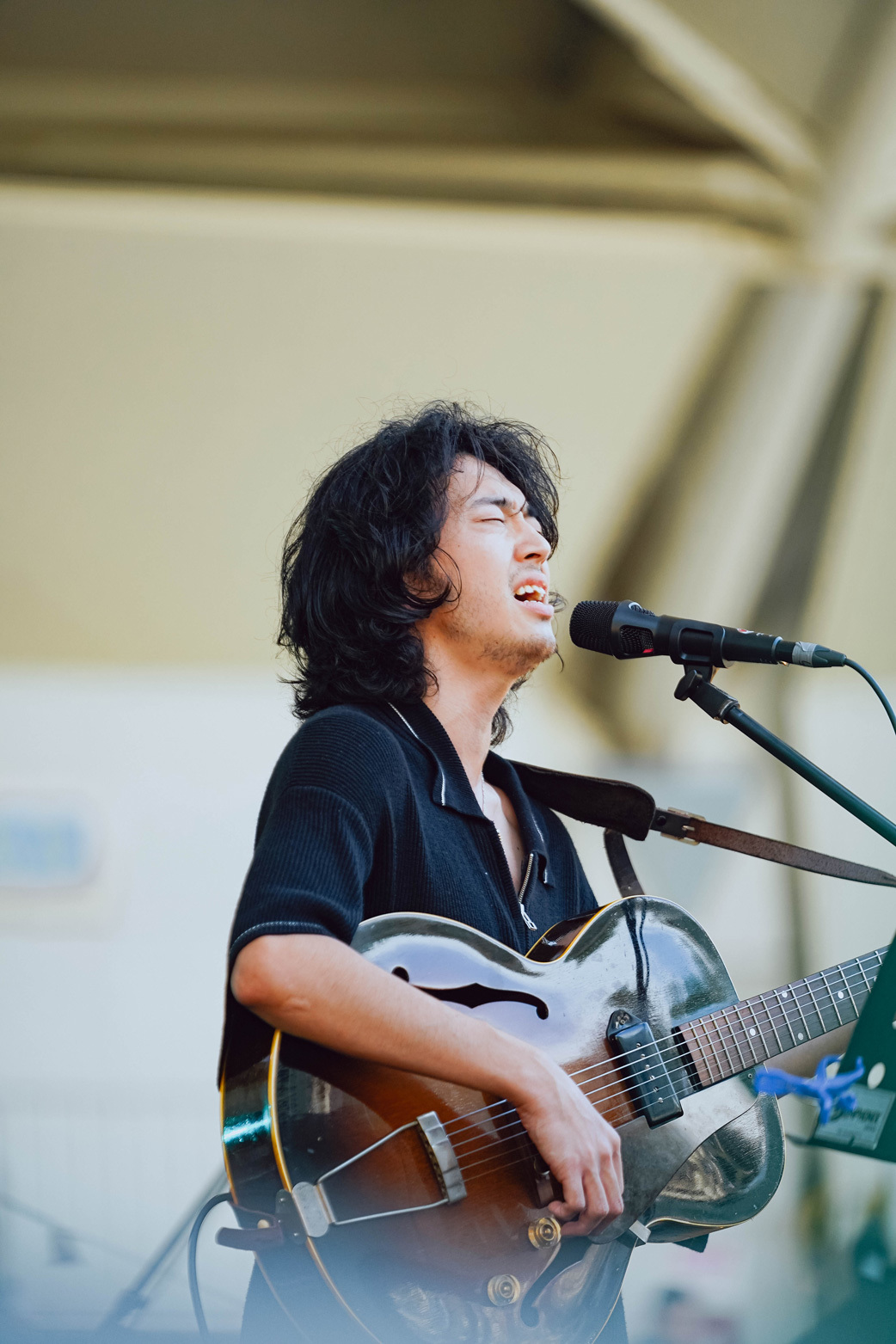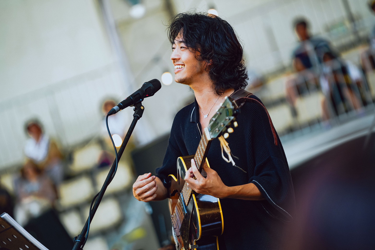 MCの加藤真樹子(FM802)が会場案内と共に、「#待ってるチバさん」のハッシュタグで復帰を願うメッセージをSNSで呼びかける。そして「とろけるような音で気持ちよく揺らしてください!」と紹介され、登場したのは荒谷翔大(yonawo)。7月には、この服部緑地野外音楽堂で開催されたスピンオフ企画『たとえばボクが踊ったら、presents「Chillaxx」× yonawo presents「tokyo」』を盛大に盛り上げたばかりの彼だが、この日は弾き語りでまさにとろけるような音を奏でていく。