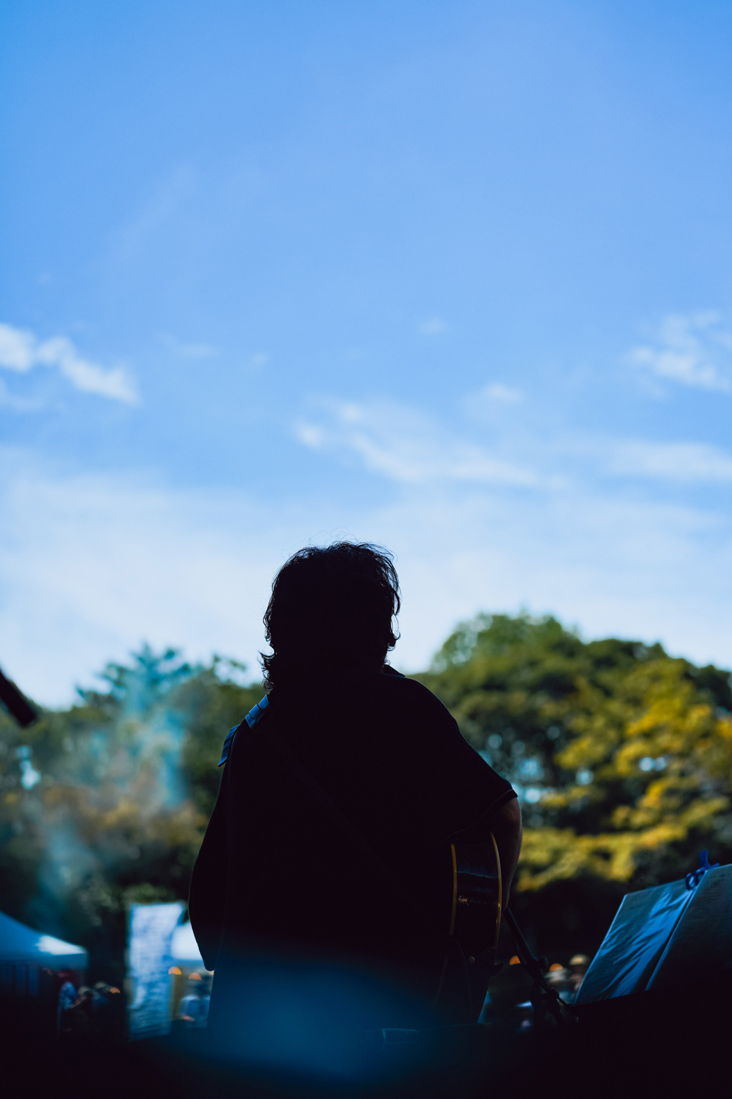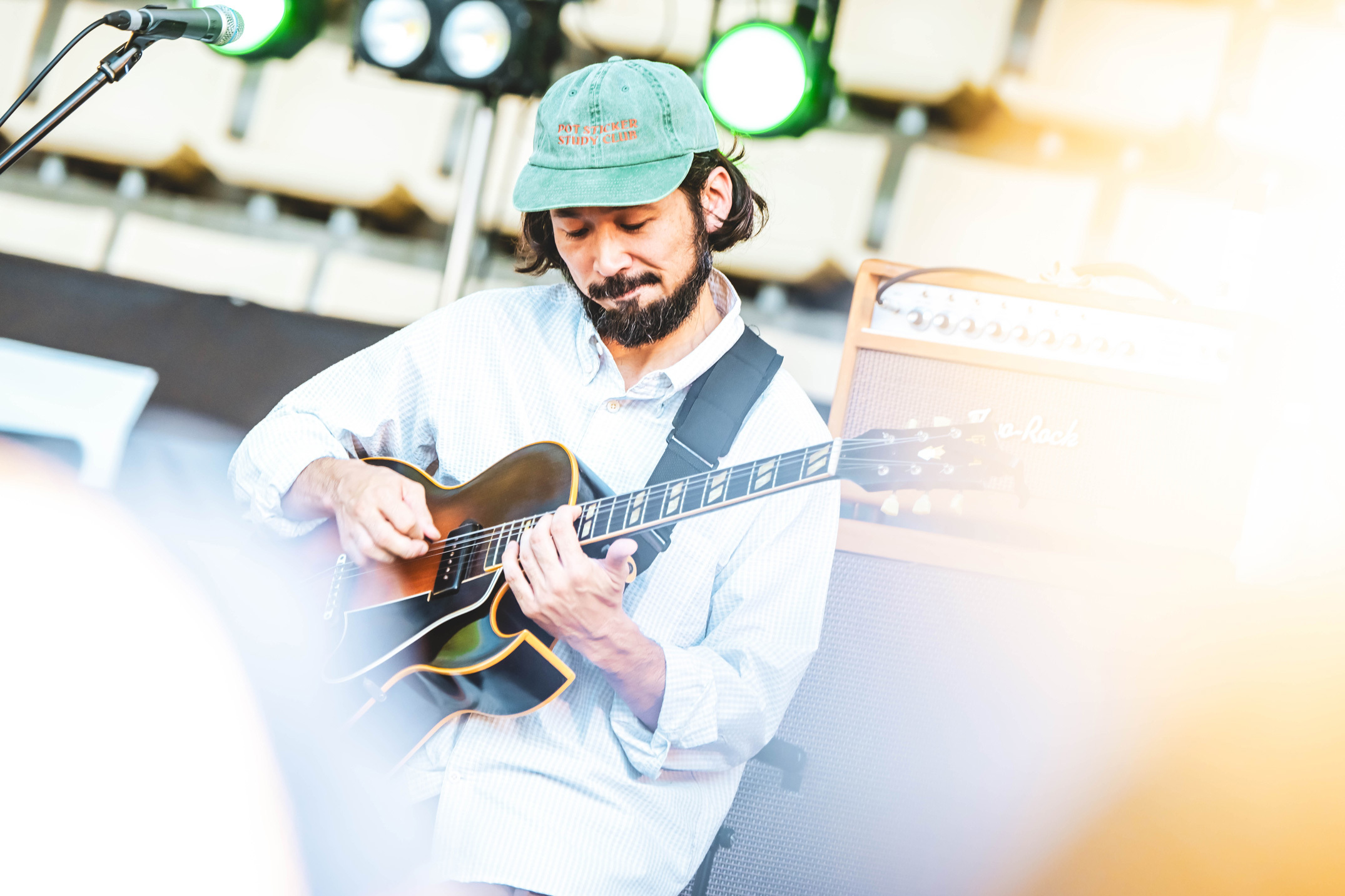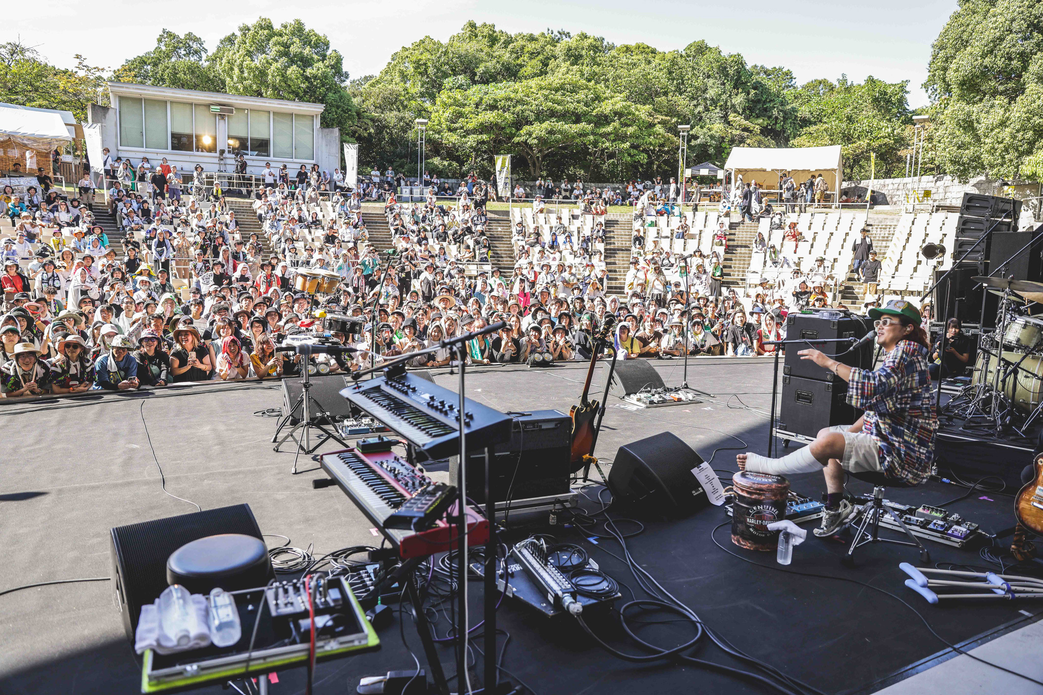 MCの加藤真樹子(FM802)が会場案内と共に、「#待ってるチバさん」のハッシュタグで復帰を願うメッセージをSNSで呼びかける。そして「とろけるような音で気持ちよく揺らしてください!」と紹介され、登場したのは荒谷翔大(yonawo)。7月には、この服部緑地野外音楽堂で開催されたスピンオフ企画『たとえばボクが踊ったら、presents「Chillaxx」× yonawo presents「tokyo」』を盛大に盛り上げたばかりの彼だが、この日は弾き語りでまさにとろけるような音を奏でていく。