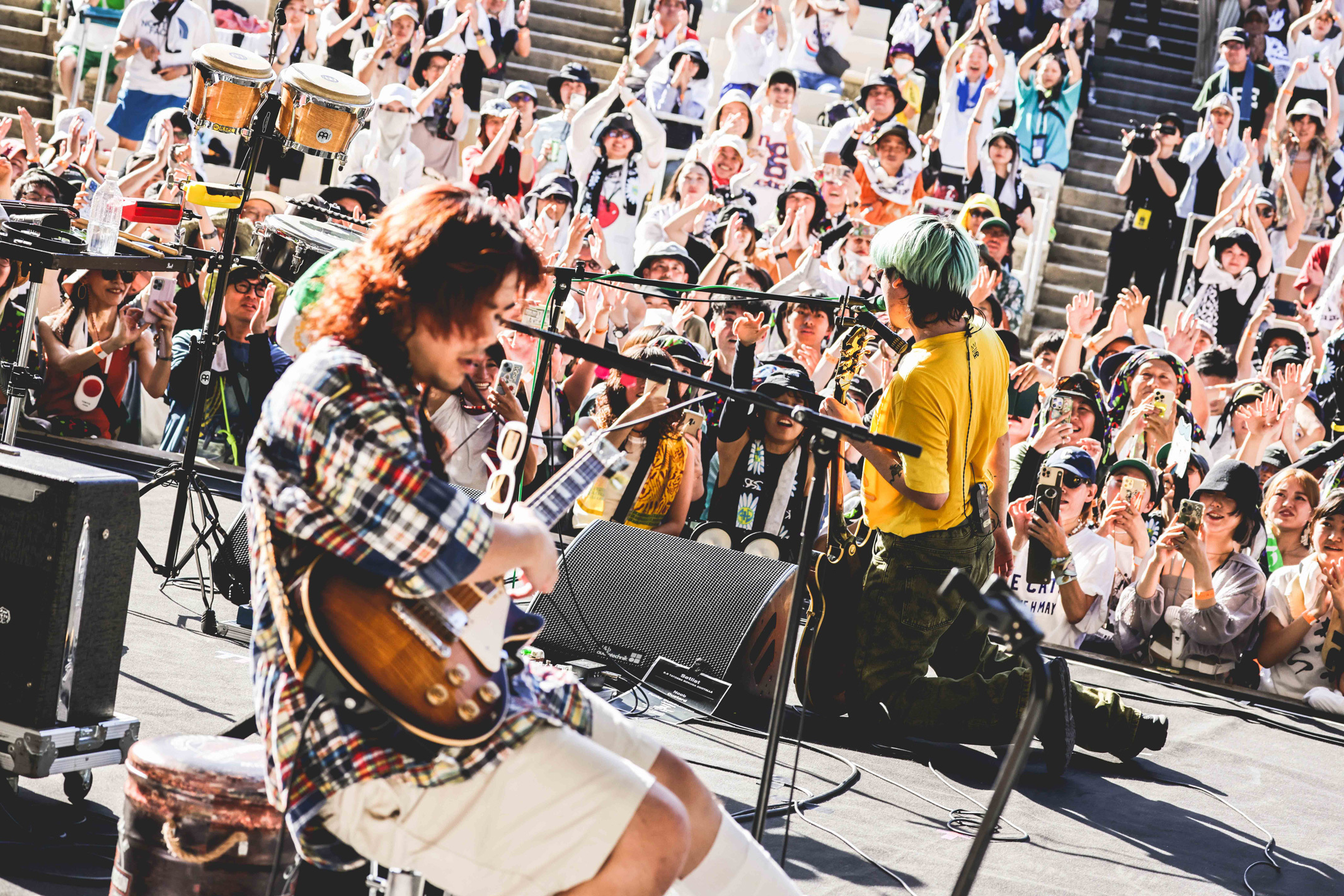リハーサルから観客の心を惹きつけていた、Kroi。アキレス腱を断裂してしまい、手術をしたばかりのため『ボク踊』仕様に提灯があしらわれた車椅子で登場した長谷部悠生(Gt)は、リハ終わりでほかメンバーがいったんハケる中、そのままひとりポツンとステージに取り残される。そんなシュールな光景でもまたひと盛り上がり。とにかくファンから愛され、そしてこの日のステージがいかに注目されているかが始まる前からフロアのテンションで伝わってきた。