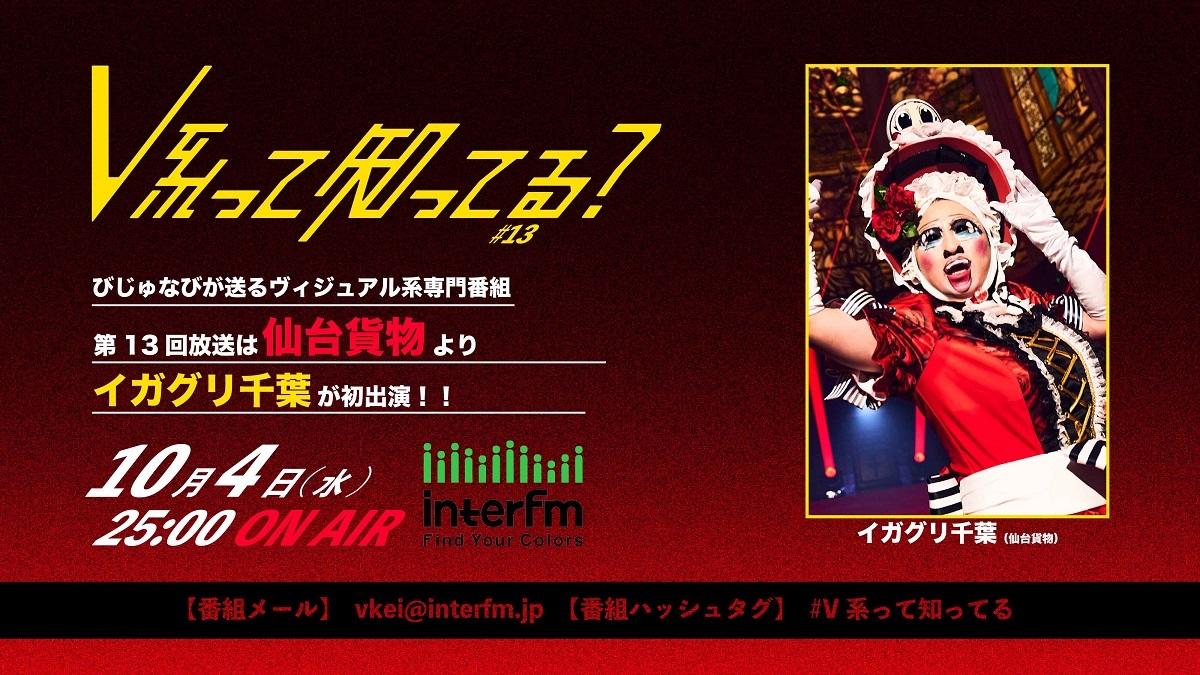 10月4日(水)25時(5日午前1時) interfmにて放送のラジオ番組『#V系って知ってる?』第13回放送のゲストに、仙台貨物のイガグリ千葉(Vo)が出演することが決定した。