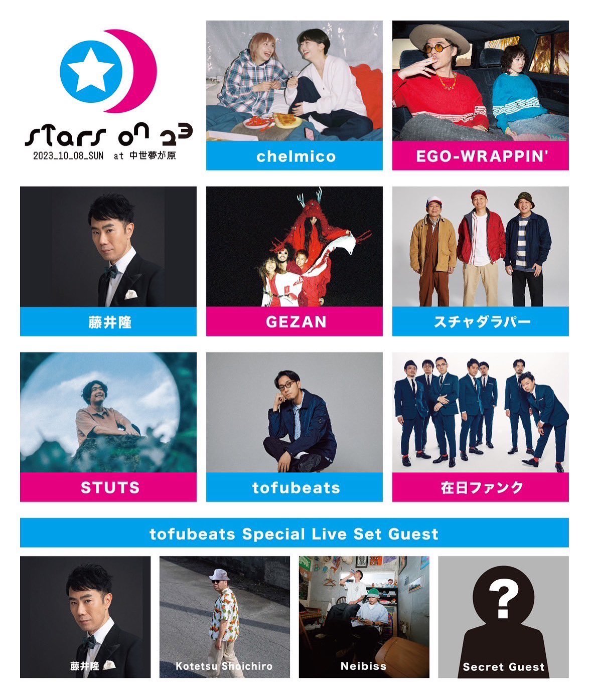 『STARS ON』は、美しい星空で知られる岡山県美星町で開催される秋の音楽フェス。今年は、chelmico、EGO-WRAPPIN'、藤井隆、GEZAN、スチャダラパー、STUTS、tofubeats、在日ファンクのほか、 tofubeatsは「Special Live Set」として、藤井隆、Kotetsu Shoichiro、Neibiss、シークレットゲストを招いたショーを披露する予定。