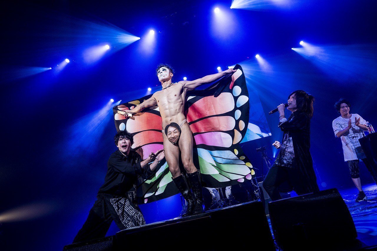 もはやこれがフリであることは明らかで(笑)、このあとに始まった「抱きしめてシュヴァルツ」では喜矢武がガリガリくんを食べながら炭酸水をガブ飲みをしてゲップをし、それに加勢するかたちで歌広場がシャンパンファイトよろしく炭酸水をさらに頭上からブッかける、という事態が発生。かと思うと、樽美酒は「BUTTERFLY」をBGMに蝶の羽をパタパタとはためかせながらステージへ踊り出たのだが、その羽の下はTバック一丁。ただし、股間部分にはモザイクがわりに浅井氏の顔写真が貼られていた…(唖然)