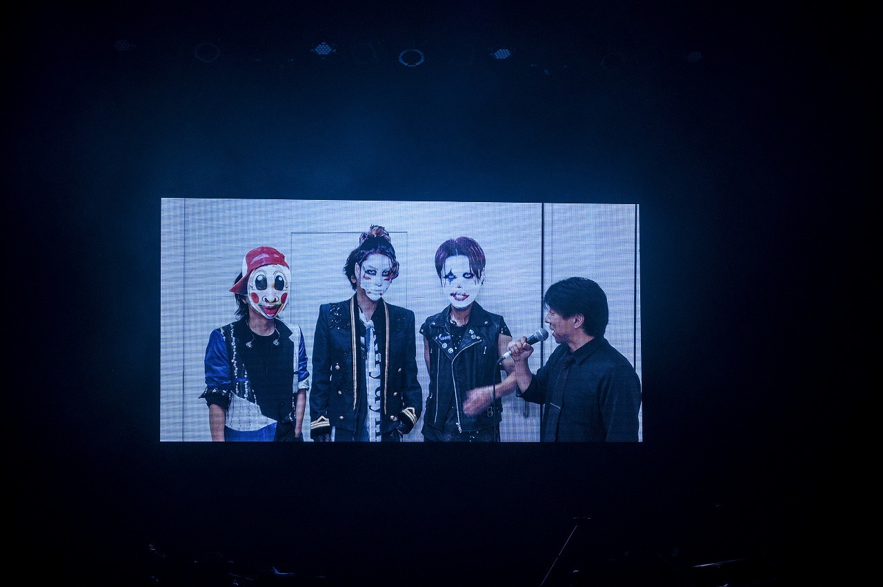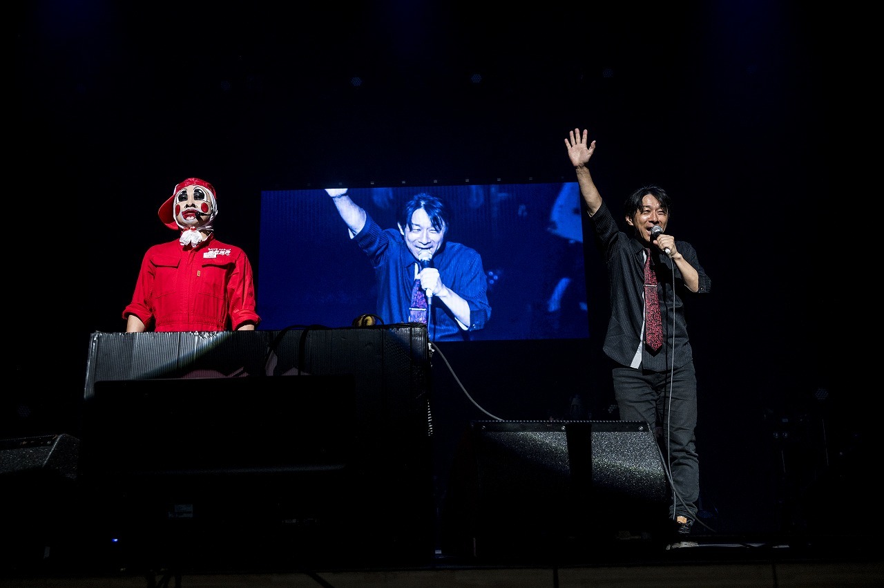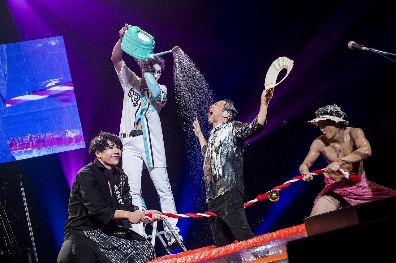 そう言いながらも、DAIGOがこの時にかぶっていたのは樽美酒のお面。AKIHIDEはイガグリ千葉、SHINPEIも団長のお面をかぶっており、彼らがまずこの白塗り顔のトリプルアタックで観衆をひと笑いさせてくれたことは言うまでもない。