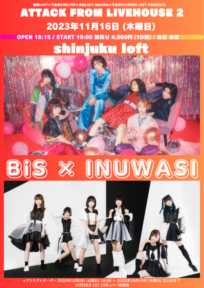 『ATTACK FROM LIVEHOUSE』は、ロフトグループ運営の音楽ライブハウス4店舗(新宿LOFT、下北沢SHELTER、渋谷LOFT HEAVEN、下北沢FLOWERS LOFT)で開催されてきたライブシリーズ。今回は新宿LOFTを舞台に、BiSとINUWASIがツーマンライブを行う。