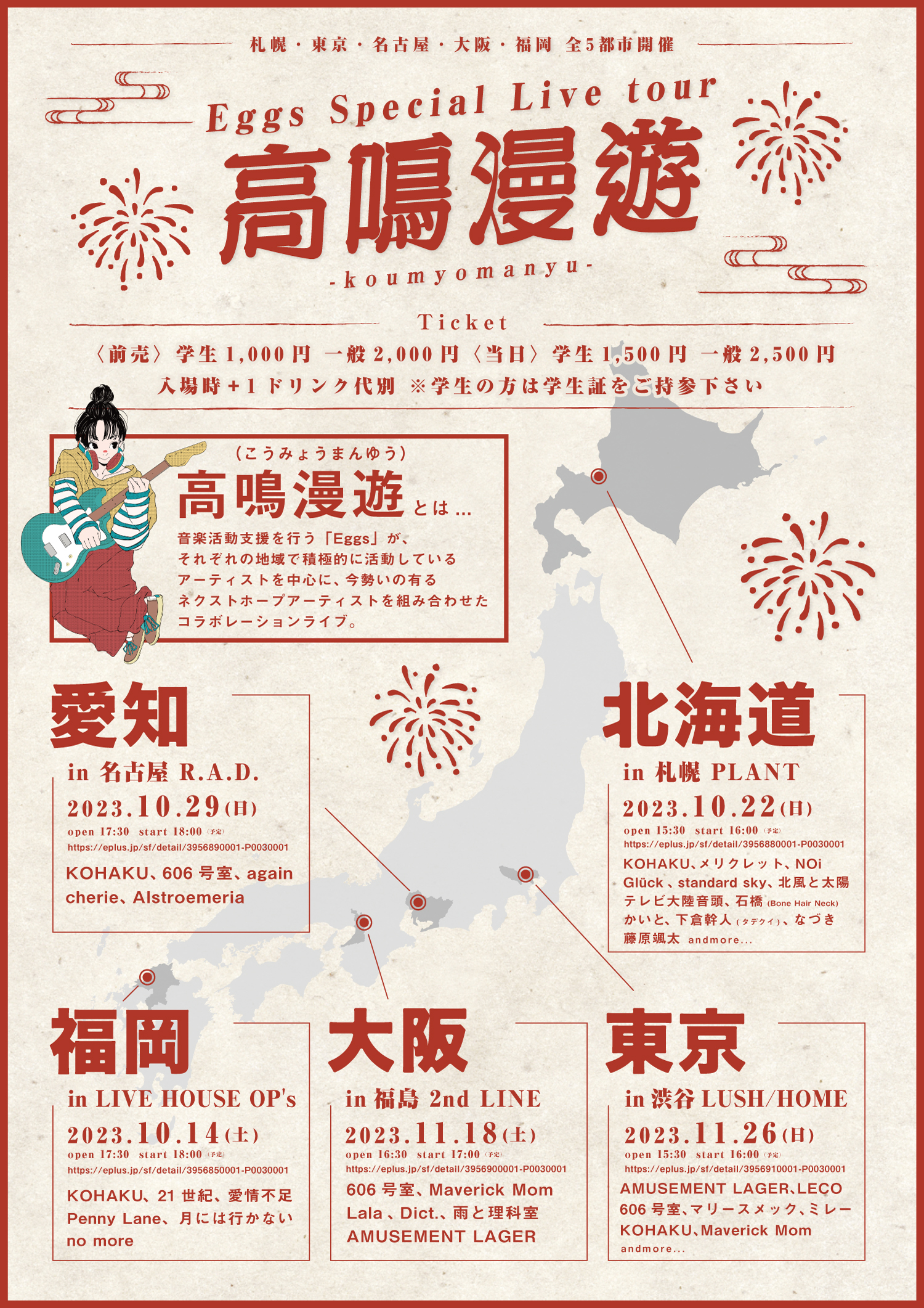 インディーズおよび新人アーティストの音楽活動支援を行う「Eggs」を運営している株式会社エッグスは、札幌・東京・名古屋・大阪・福岡の全国5都市で開催するスペシャルライブツアー「高鳴漫遊」(読み:こうみょうまんゆう)の福岡編・札幌編について、追加出演者を発表した。