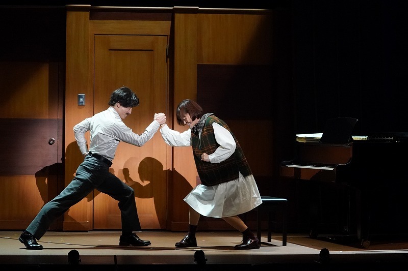 “千秋先輩”を演じるのは三浦宏規。全国バレエコンクール入賞を経て、2019年に史上最年少でミュージカル『レ・ミゼラブル』のマリウス役を射止め、その後もミュージカル『ヘアスプレー』、舞台『千と千尋の神隠し』、舞台『キングダム』に出演……という飛ぶ鳥を落とす勢いで突き進んでいる三浦だが、本作ではミュージカル俳優としてのポテンシャルを余すところなく発揮。歌うし、踊るし、ピアノも弾くし、指揮もするし、格好良さも色っぽさもあるしで、三浦のファンのみならず、作品のファンも納得する完成度の高い“千秋先輩”を好演した。