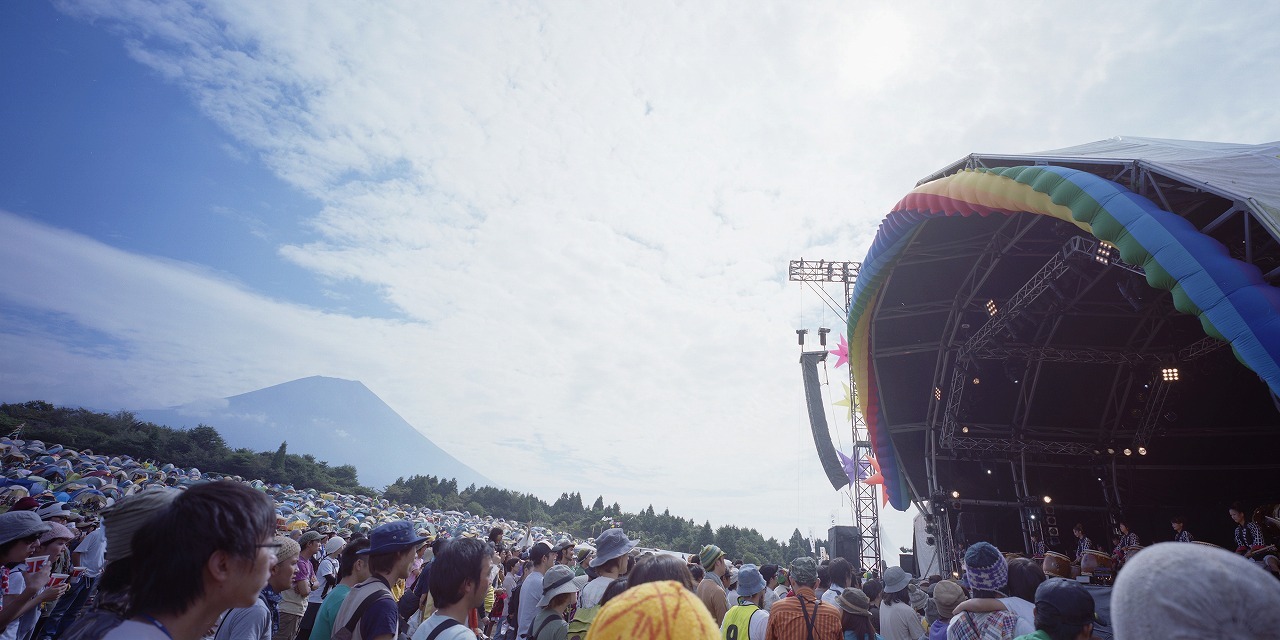 会場となる朝霧アリーナは、東京から車で約2時間、富士山西麓の標高900mに位置する朝霧高原にあります。富士山との間に遮るものがないので、天気がよければ雄大な富士山を会場の至るところから仰ぎ見ることができます。中でも展望台「宇宙大使マザーシップ」は富士山をバックにした最高の写真が撮れるフォトスポットとして賑わいます。「ここで来年用の年賀状を撮影するんです!」という人も多いそう。