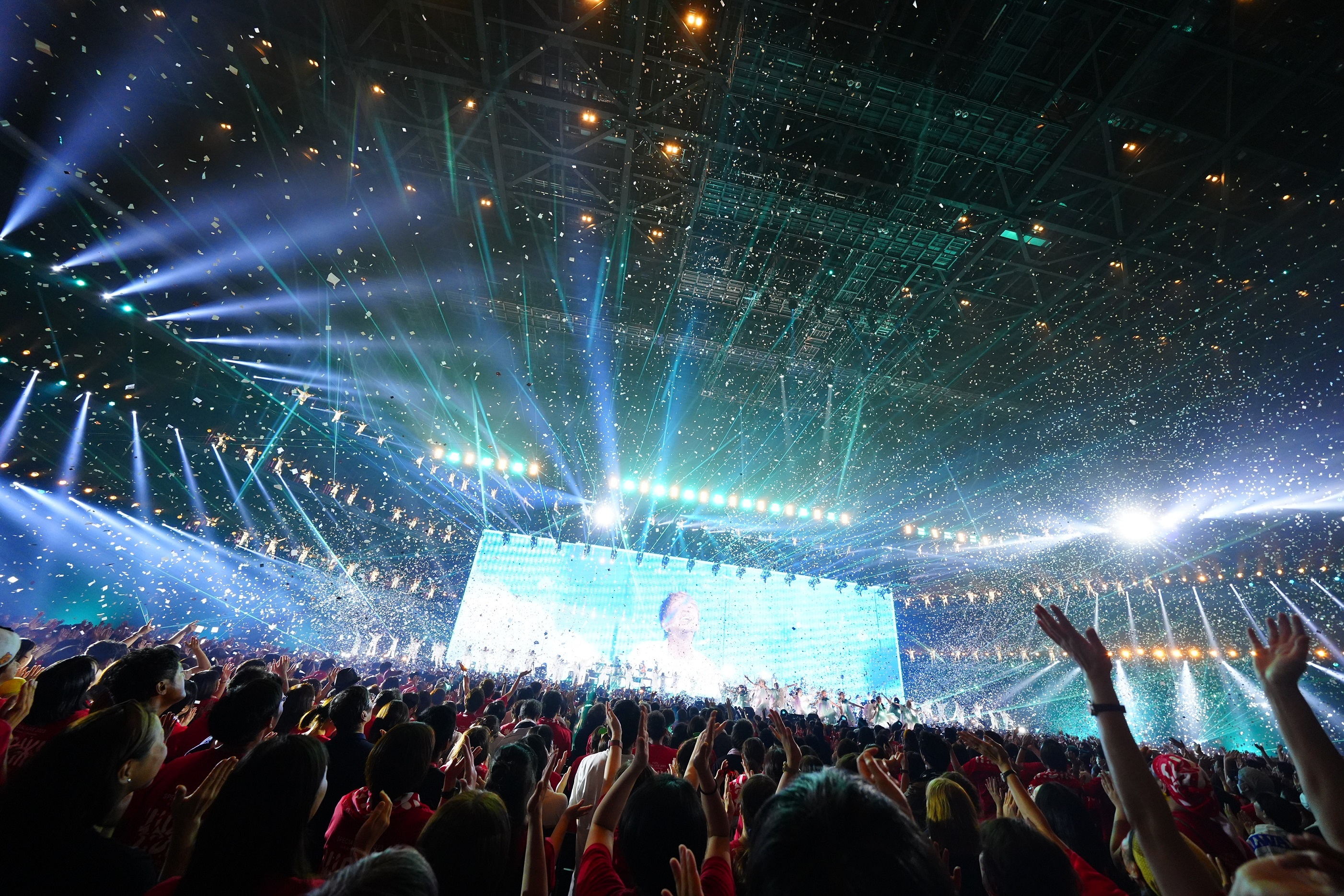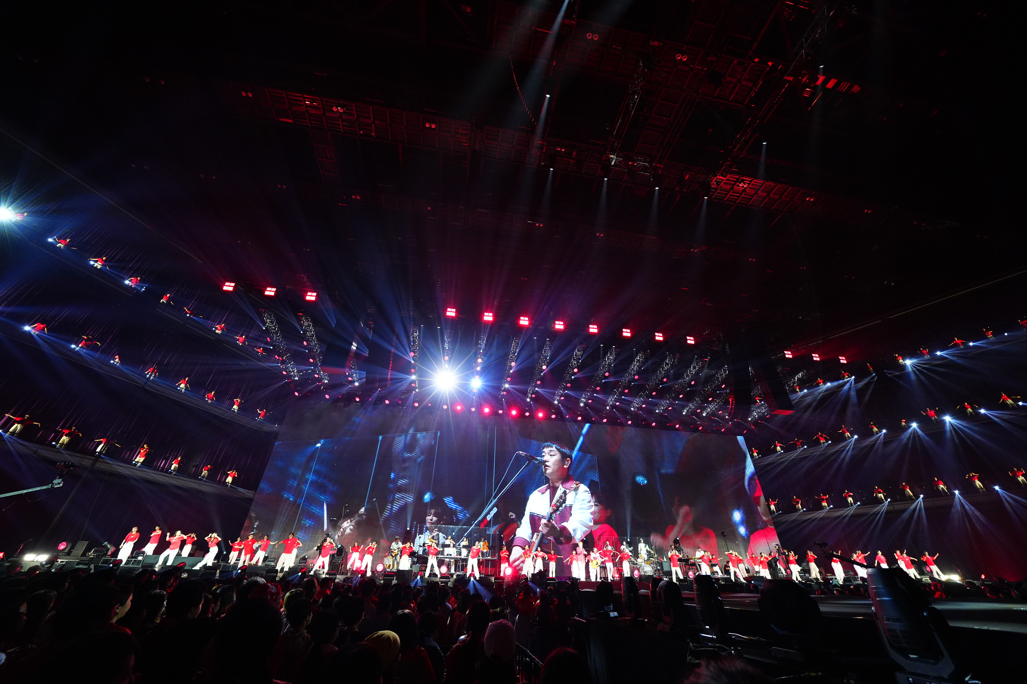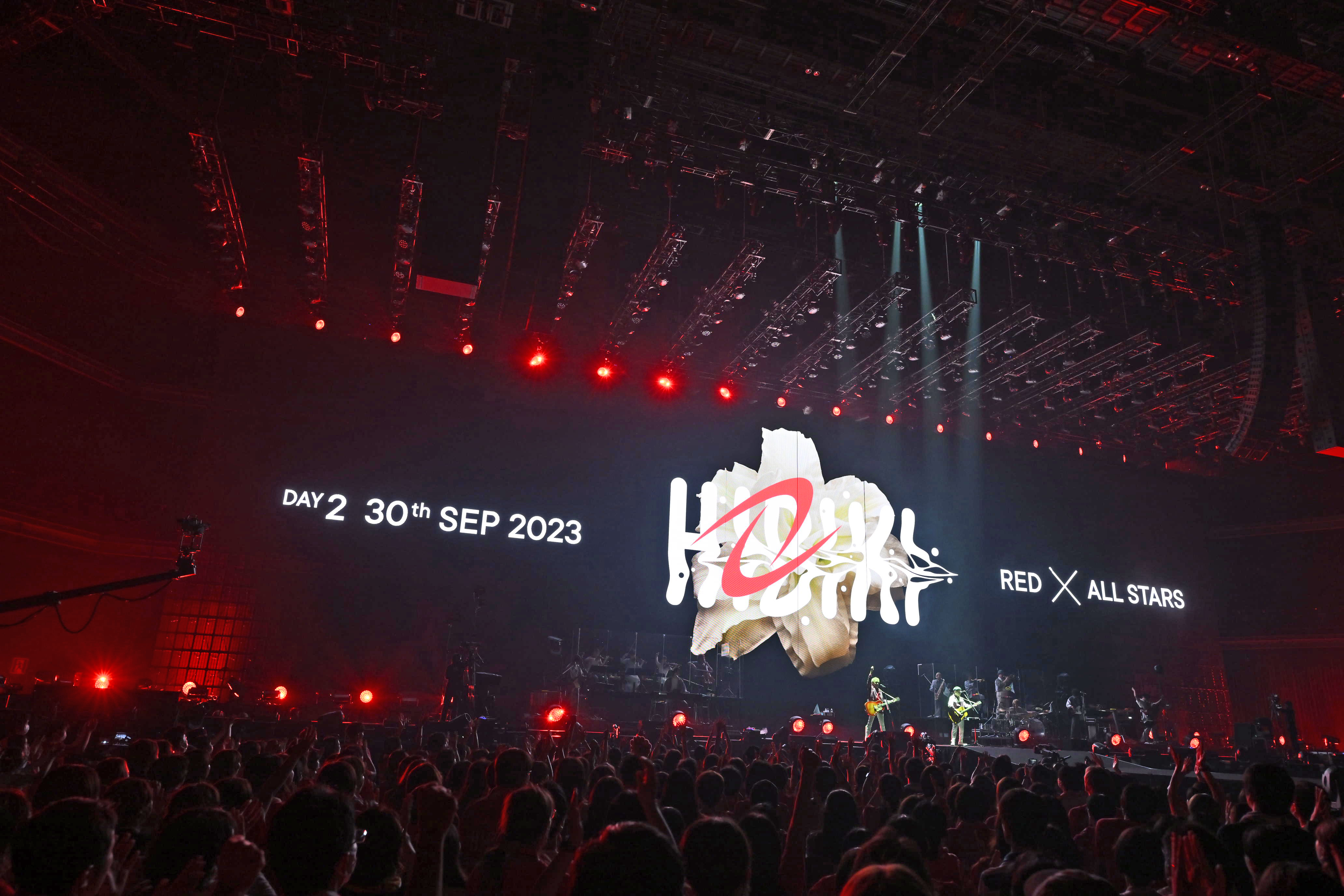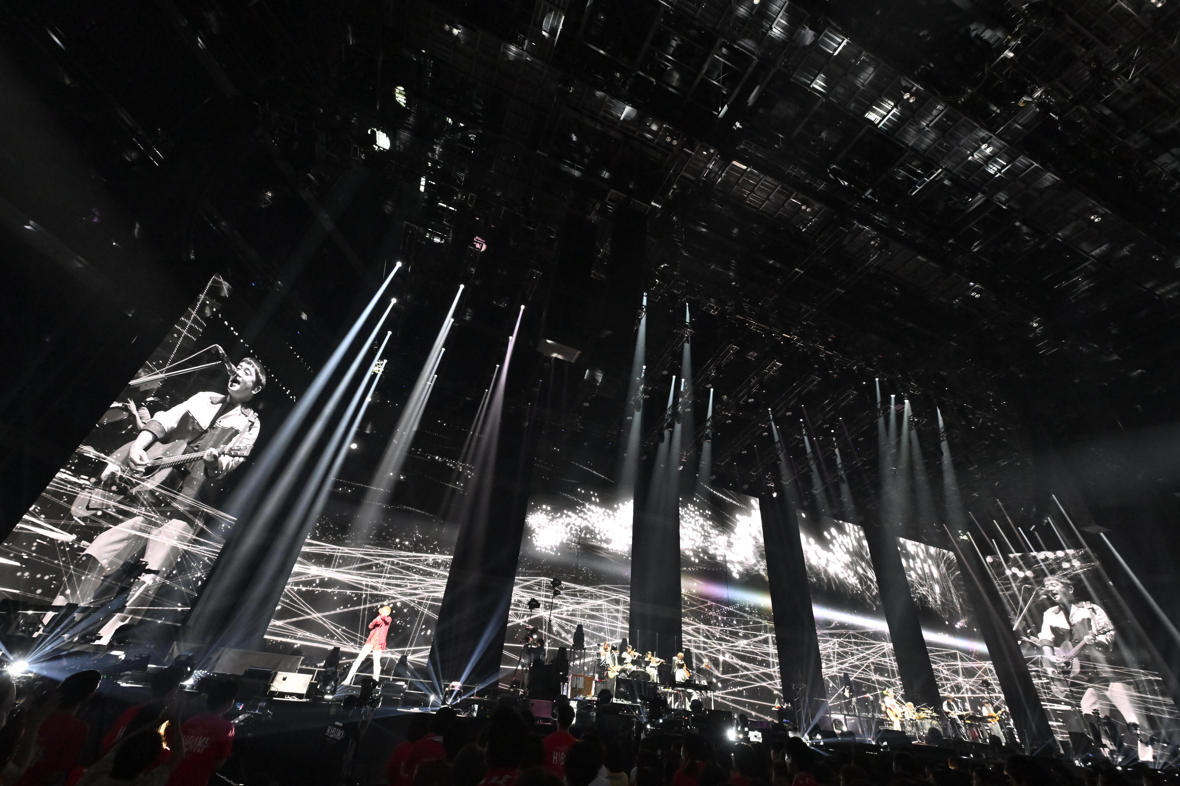 ストリングスとホーンセクションを含むHIBIKI ALL STARSの華やかな演奏が鳴り響く中、北川と岩沢がステージに登場。「ヒカレ」がスタートすると、爽やかなサウンドが一気に会場全体を満たしていった。続いて「うたエール」ではダンサーチームも合流。美しい空間が拡大する様が壮観だった。メインステージはもちろん、左右の三層のバルコニーにもダンサーが並んでパフォーマンスを繰り広げていたが、このようなダイナミックな演出はなかなか観られるものではない。この日の公演は、大所帯の編成と広大な会場の設備を存分に活用した場面の連続だった。様々な曲で登場したダンスパフォーマーは総勢150名。使用されたレーザーは70台。巨大LEDスクリーンは縦12メートル×横42メートルで約80メートルの可動領域を行き来(最大14分割)――といった数字からもスケール感が伝わるのではないだろうか? 「壮大なエンターテインメント」と称するのがふさわしい「RED ✕ ALL STARS」だった。
