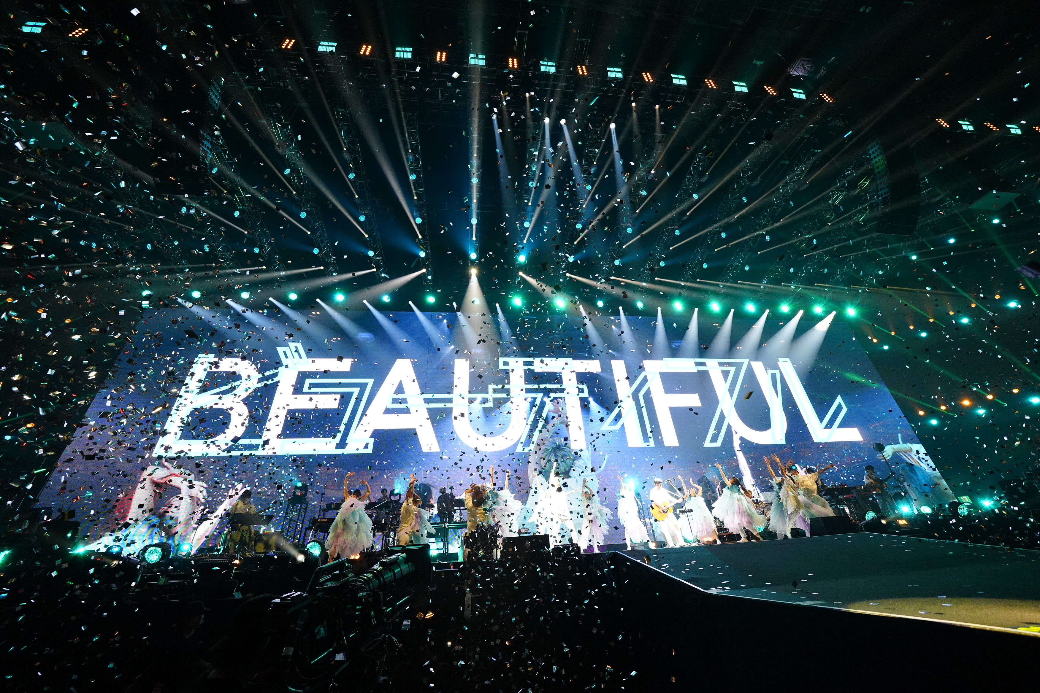 HIBIKI ALL STARSの1人1人が紹介され、各々のソロプレイが冴え渡った後にエネルギッシュに突入した「少年」。夏が戻って来そうなくらいの熱気が生まれた「夏色」。そして本編を締め括ったのは「ビューティフル」。初日公演でも生のバンド演奏とダンサーチームのパフォーマンスが加わった形で披露されたが、この日はさらにスケールアップしていた。メインステージ、花道、バルコニーに並んだ大人数のHIBIKI DANCERSによる群舞、HIBIKI ALL STARSの壮大なサウンド、北川と岩沢の黄金のハーモニー、飛び交うレーザー光線を含むドラマチックなライティング、可動式の巨大LEDスクリーンに映し出された映像……これらが一体となった空間は、「衝撃的だった」とすら言える。Kアリーナ横浜で撮影されたMVの世界観を踏まえつつ、ライブパフォーマンスとして再構築された神々しい総合芸術を体感することができた。