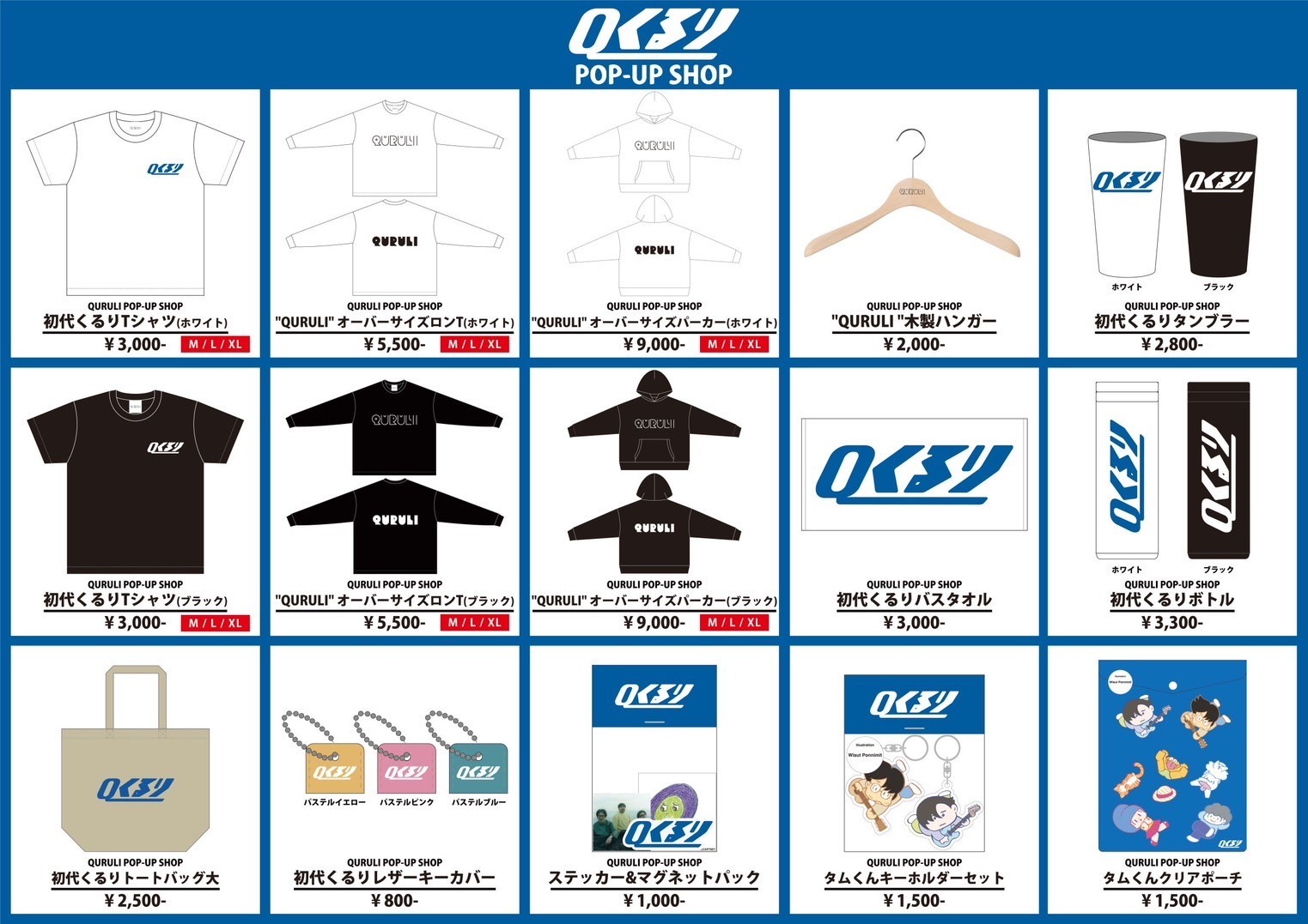 ポップアップショップでも新たに制作したグッズが販売される。初代くるりロゴデザインのTシャツ、トートバック、バスタオル、マグネット&ステッカーセット、レザーキーカバーなどの⼩物を用意。そのほかQURULIロゴのロンT、パーカー、ハンガー、更に昨年に引き続きタムくんがデザインをしたキーホルダー、ポーチなど、多種多様なグッズが盛りだくさんラインナップされる。その他にも『くるりのえいが』場⾯写真のパネルや、ツアーで着⽤した⾐装も展⽰予定となっている。
