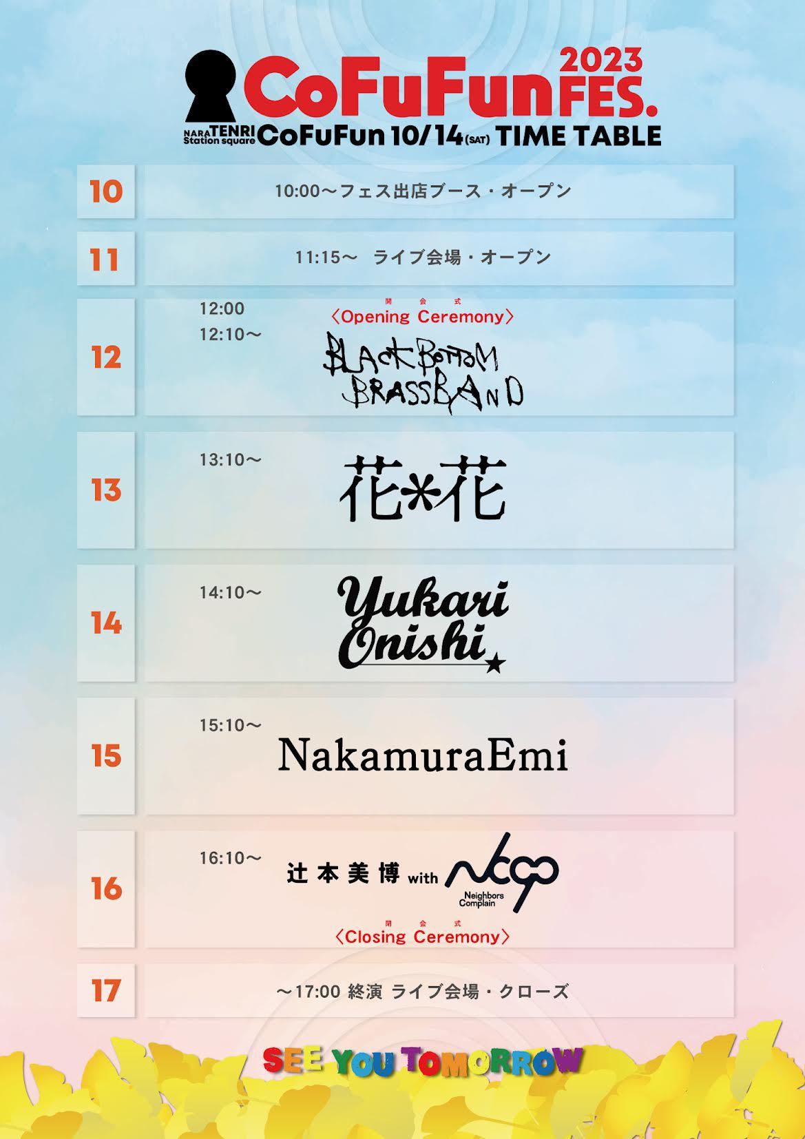 2023年10月14日(土)・15日(日)に、奈良・天理駅前広場コフフンにて開催される『CoFuFun FES.』のタイムテーブルが発表された。