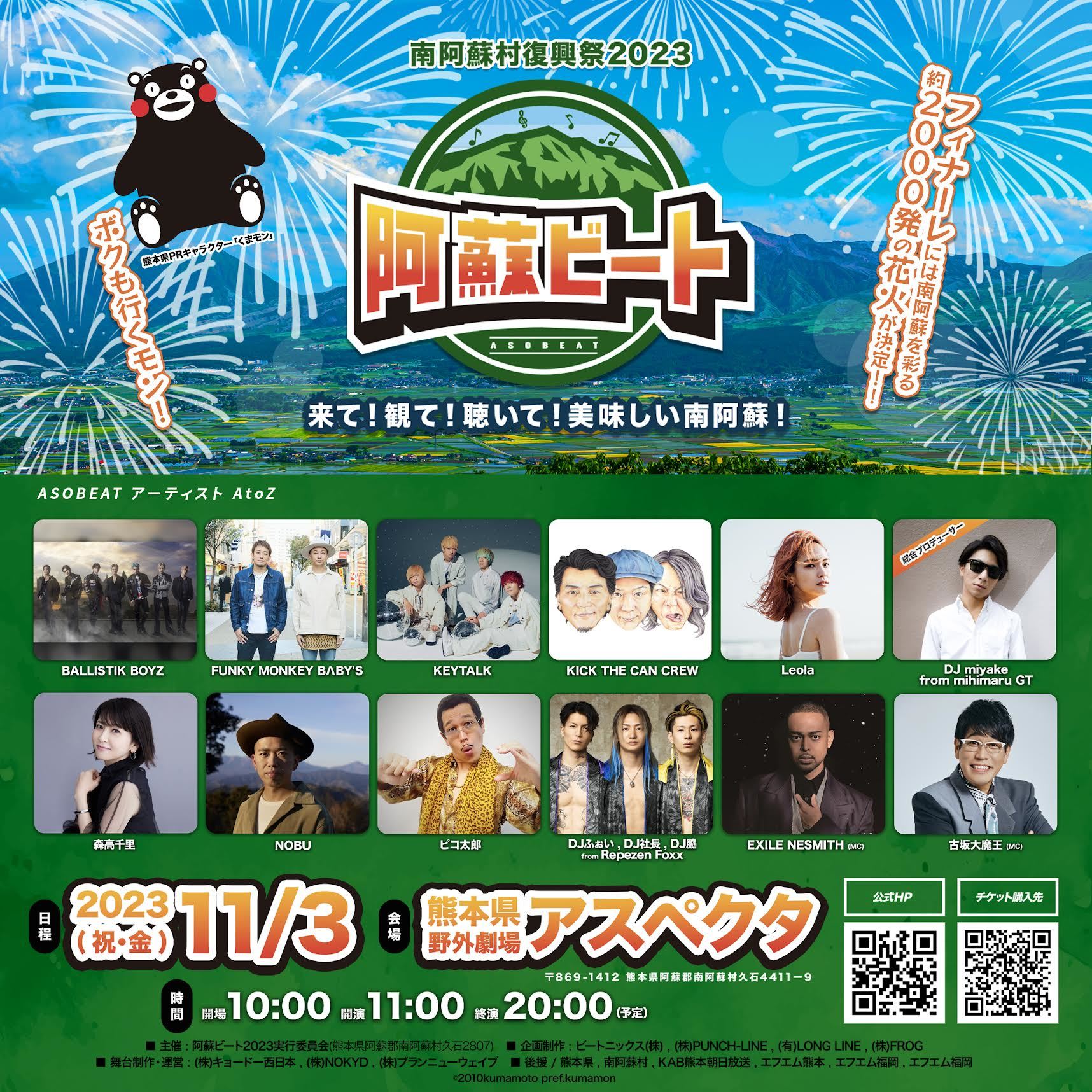 『阿蘇ビート2023』は、miyake(mihimaru GT)による総合プロデュースにて2023年11月3日(金・祝)に初開催される野外フェスイベント。本イベントにて音楽と食を通じてエシカルビレッジ”南阿蘇”を多くの人に体感してもらい、2016年熊本地震にて甚大な被害を受けた南阿蘇村の復興を新たなフェーズへと進めていくという。
