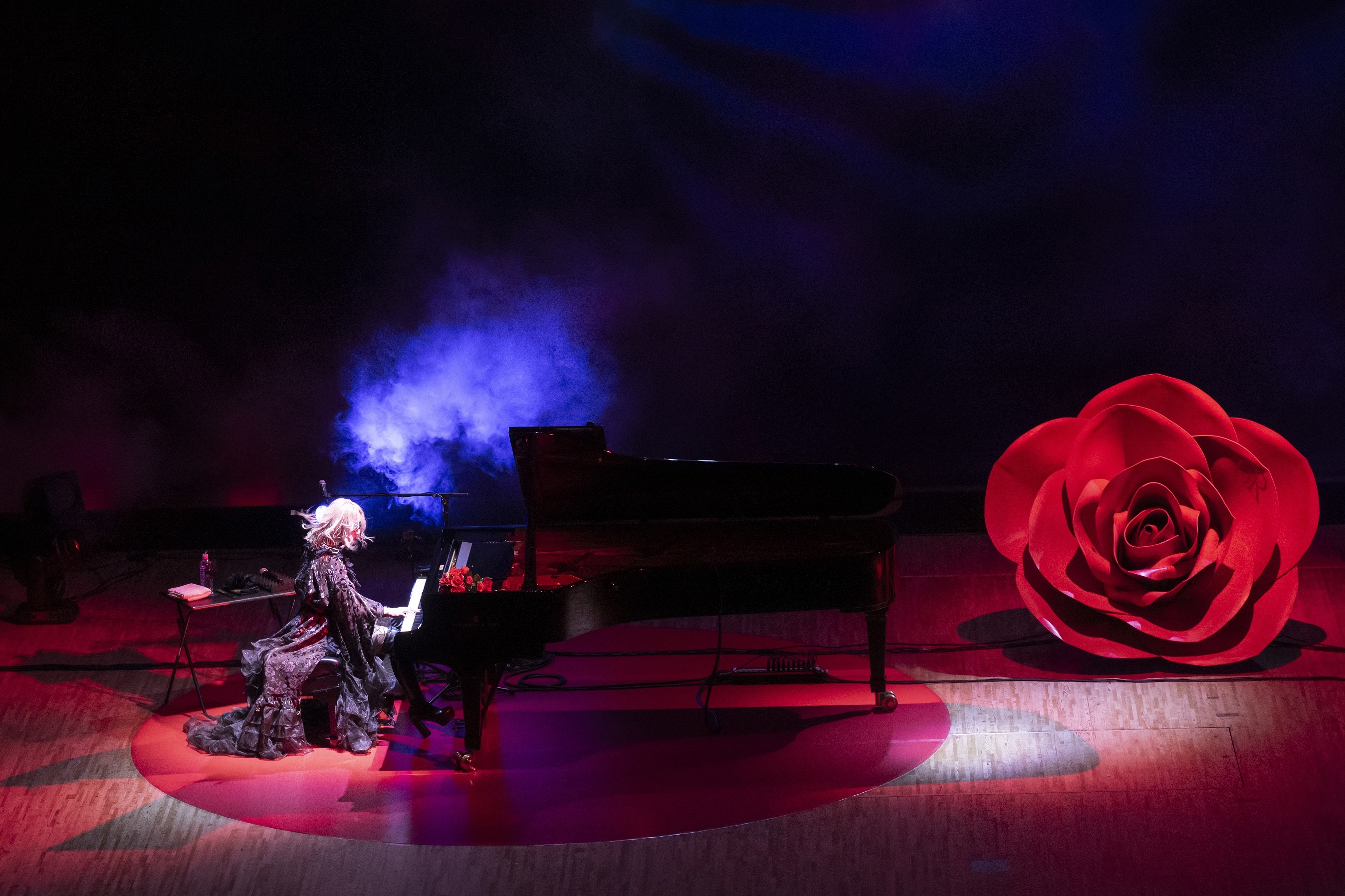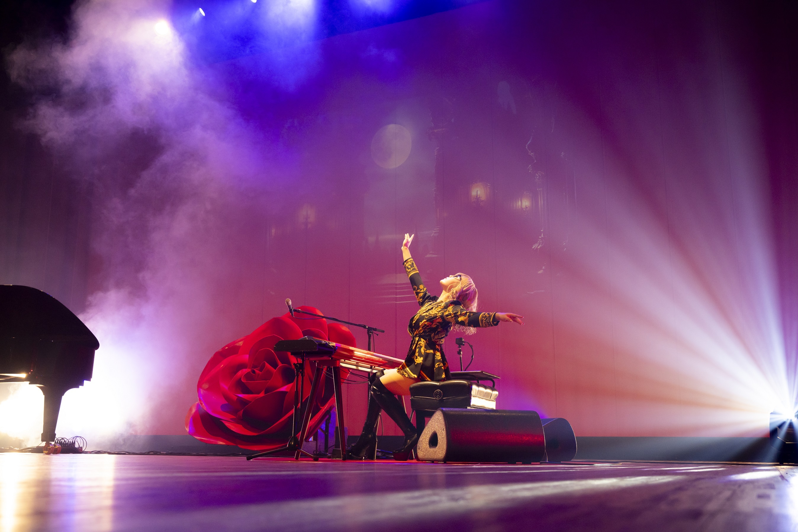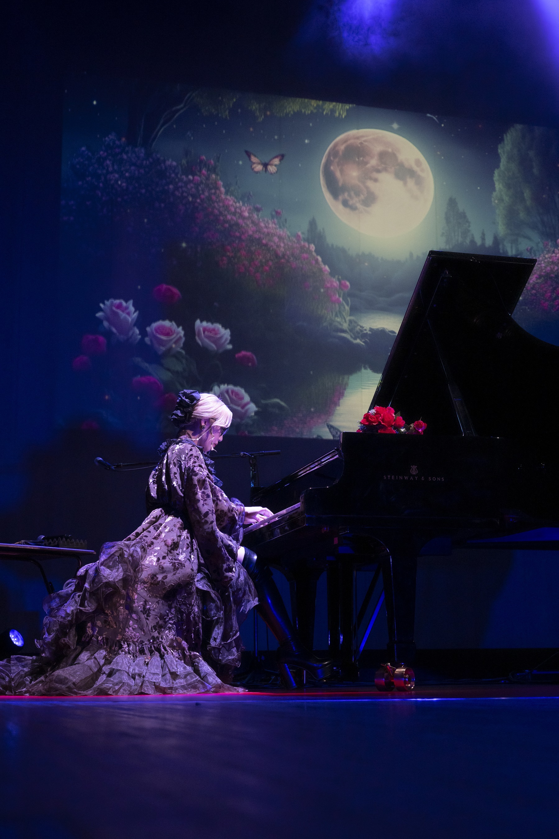 鳥のさえずりが響く場内がゆっくり暗転すると、荘厳なストリングスの音色が流れ始めた。ステージ背面に大きな満月が映し出され、下手側にはグランドピアノ、上手側には赤色のキーボード、そして中央には大きなバラのモニュメントが置かれた舞台に、黒いドレス姿の五条院が姿を現す。客席から大きな拍手が上がる中、彼女はピアノの前に座り、柔らかな音色を奏で始めた。1曲目は「ARTEMIS〜美しきお月光に照らされ、君は何を想ふ〜」。コンサート当日は奇しくも、中秋の名月。なんともこの日にふさわしい選曲だった。流麗で幻想的でありながらも徐々に熱を帯びていく演奏で、早くも客席を陶酔させると、続く「TOCCATA」で、その空気を一変させる五条院。赤いスポットライトに照らされながら、身体を大きく後ろに反らせたり、鍵盤に顔を近づけて前屈みになったりと、情熱的かつ壮絶な勢いで指を走らせる。