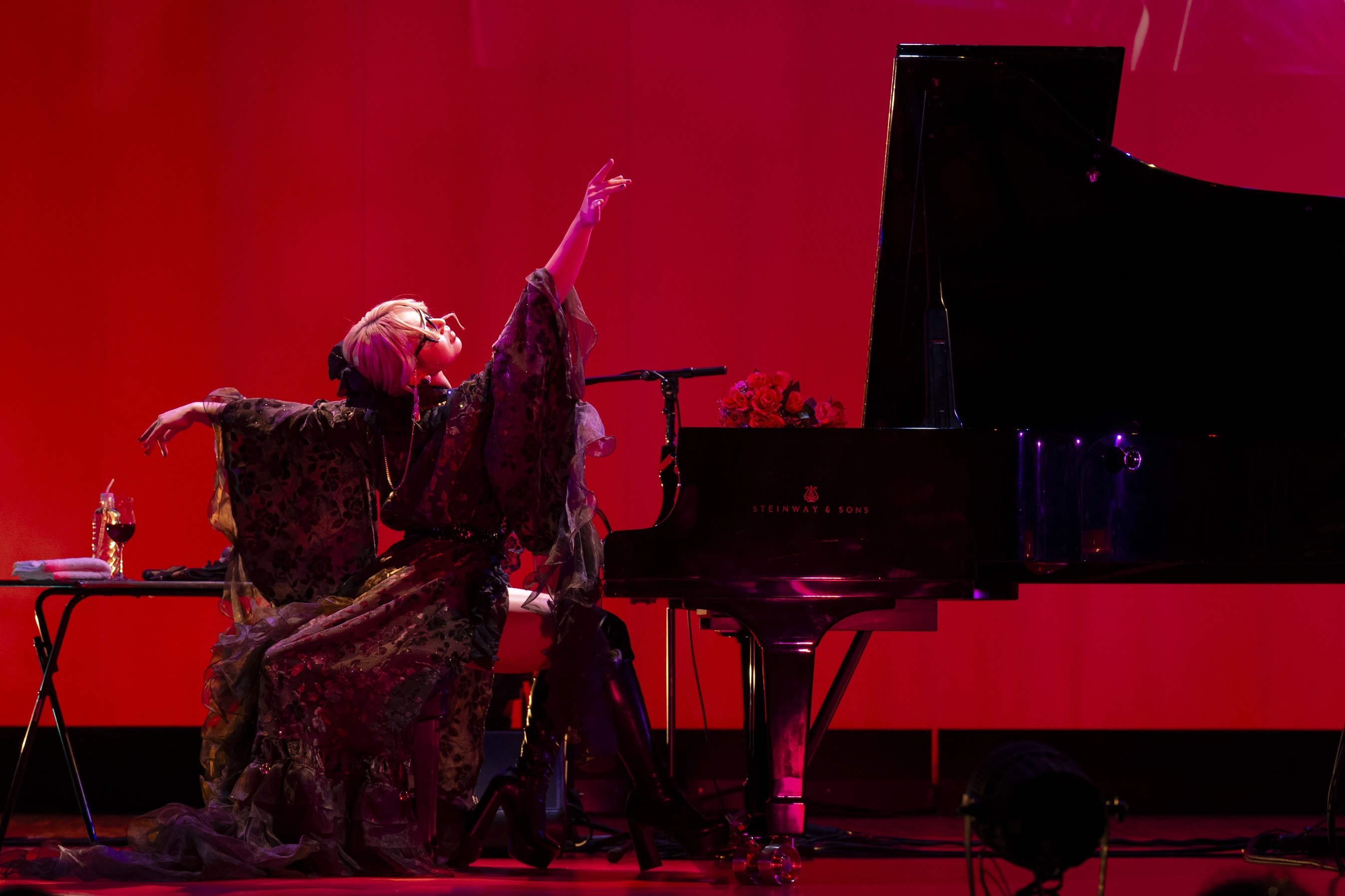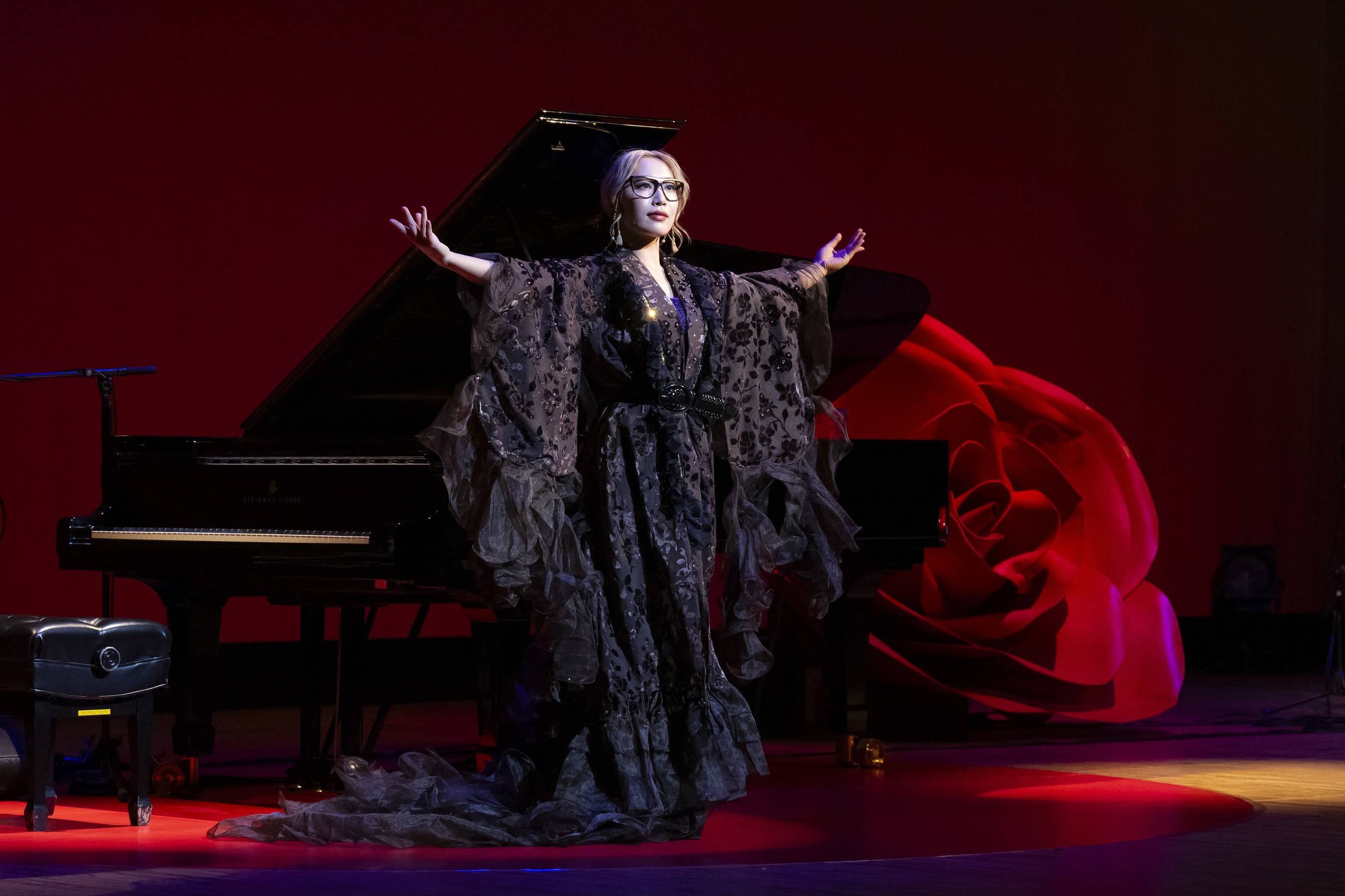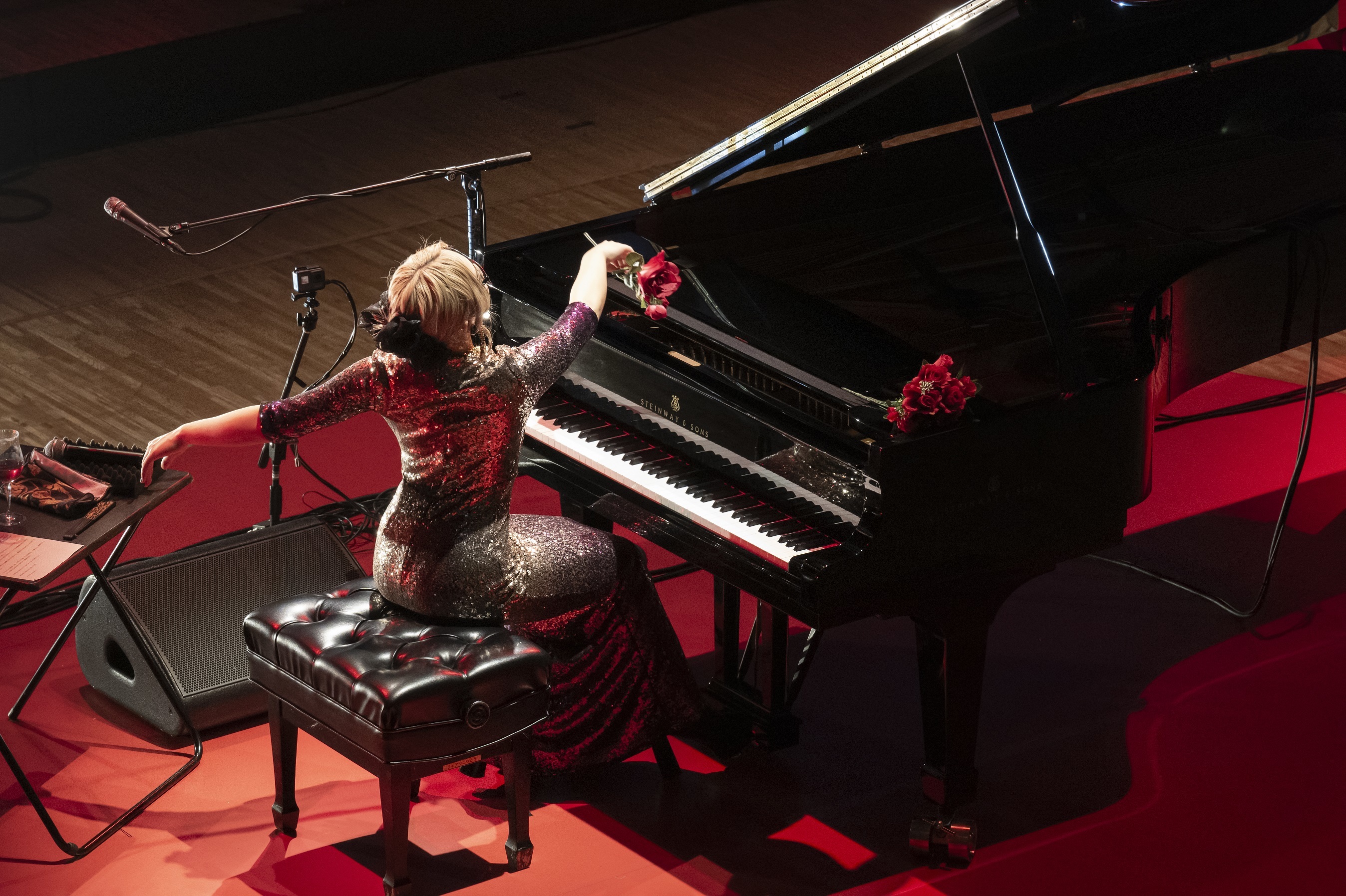鳥のさえずりが響く場内がゆっくり暗転すると、荘厳なストリングスの音色が流れ始めた。ステージ背面に大きな満月が映し出され、下手側にはグランドピアノ、上手側には赤色のキーボード、そして中央には大きなバラのモニュメントが置かれた舞台に、黒いドレス姿の五条院が姿を現す。客席から大きな拍手が上がる中、彼女はピアノの前に座り、柔らかな音色を奏で始めた。1曲目は「ARTEMIS〜美しきお月光に照らされ、君は何を想ふ〜」。コンサート当日は奇しくも、中秋の名月。なんともこの日にふさわしい選曲だった。流麗で幻想的でありながらも徐々に熱を帯びていく演奏で、早くも客席を陶酔させると、続く「TOCCATA」で、その空気を一変させる五条院。赤いスポットライトに照らされながら、身体を大きく後ろに反らせたり、鍵盤に顔を近づけて前屈みになったりと、情熱的かつ壮絶な勢いで指を走らせる。