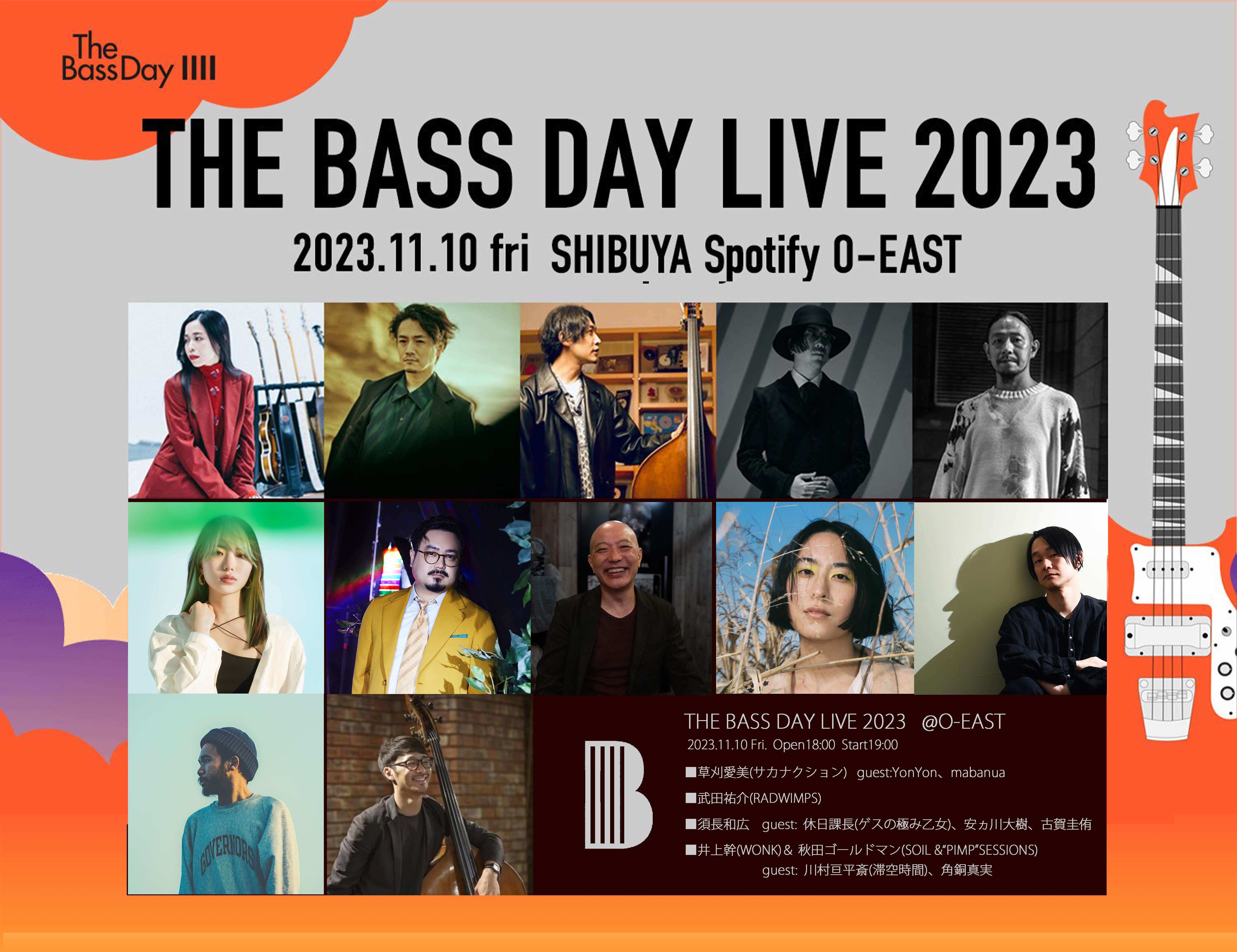 『THE BASS DAY LIVE 2023』では、日本の音楽シーンを牽引するベーシスト、草刈愛美(サカナクション)/武田祐介(RADWIMPS)/須長和広/井上幹(WONK)/秋田ゴールドマン(SOIL&"PIMP"SESSIONS)、あきらかにあきら(THE ORAL CIGARETTES)/高木祥太(BREIMEN)/TOKIE/MISA(BAND-MAID)が、それぞれジャンルレスに一期一会のパフォーマンスを繰り広げる。