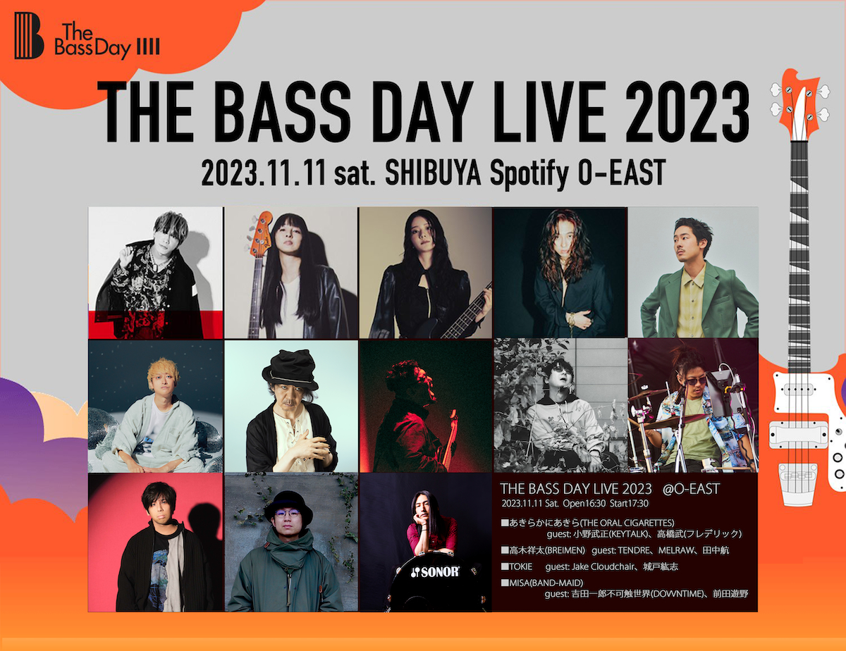 記念日登録されてから9年目を迎える「ベースの日」に、Spotify O-EASTでライブ・イベント『THE BASS DAY LIVE 2023』が4年ぶりに2DAYS開催(11月10日(金)・11日(土))される。今回、それぞれのベーシストが迎えるゲスト出演者が発表となった。