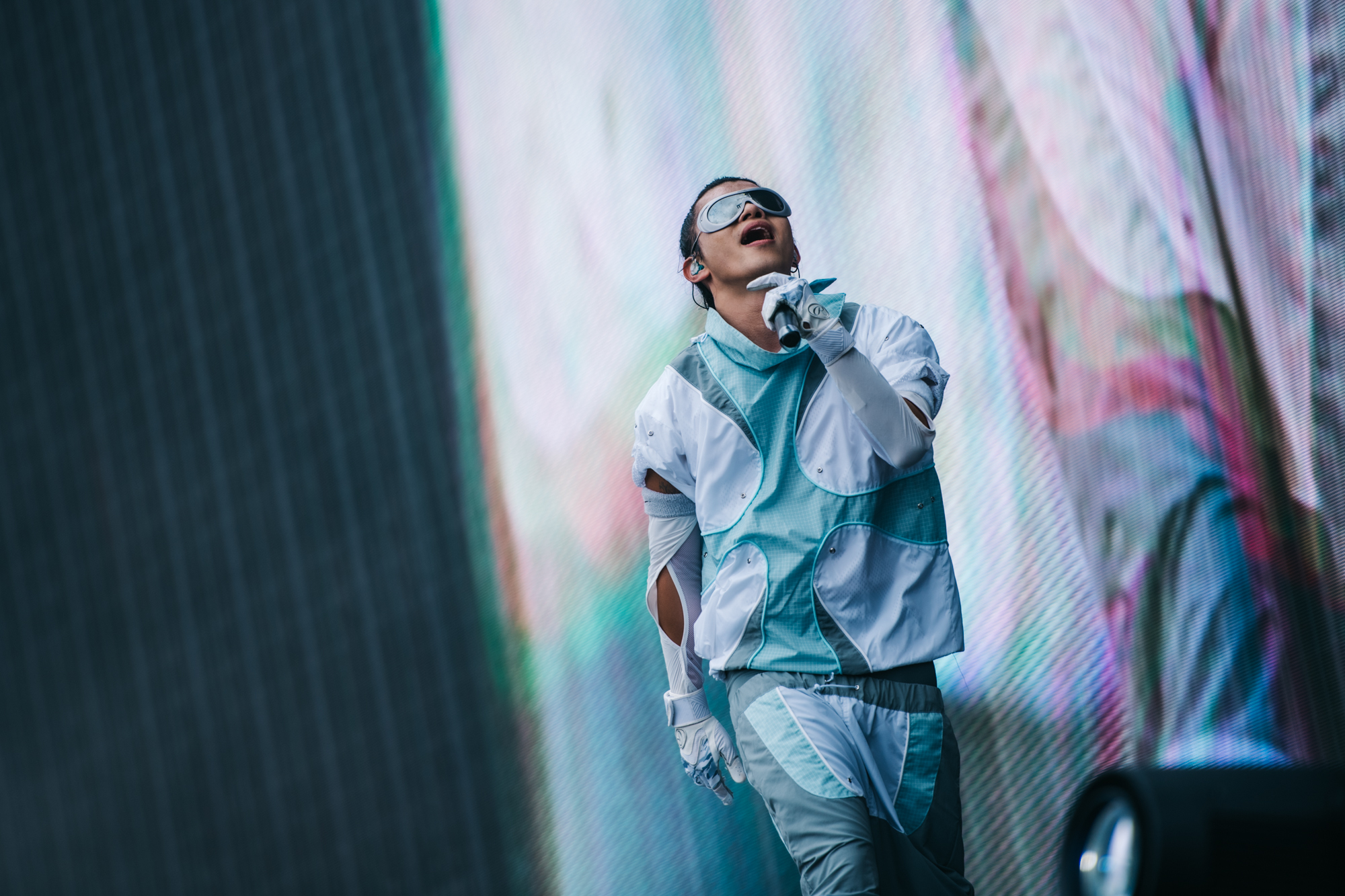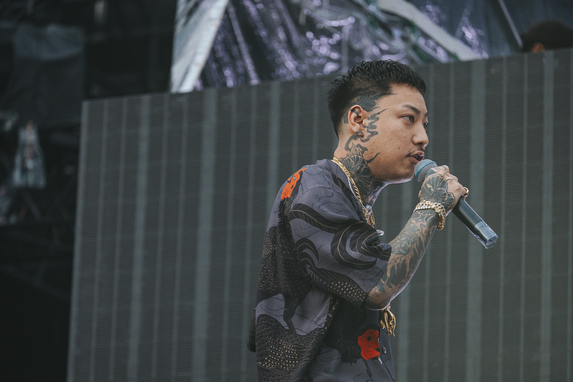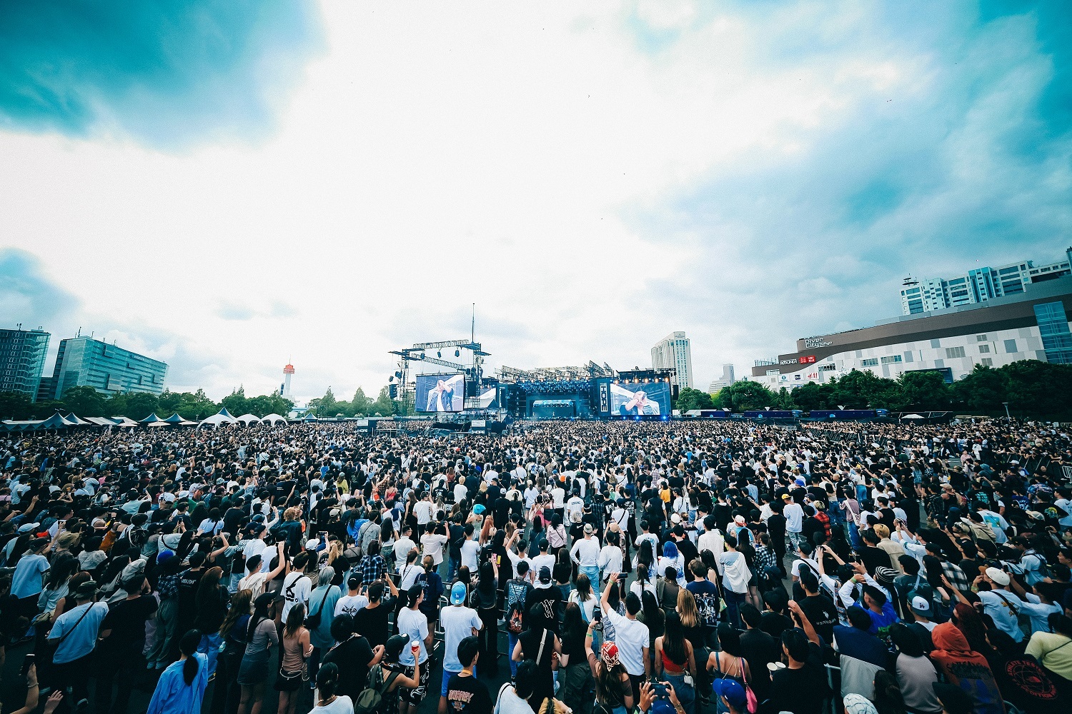 15時近くなると、曇り空から明るい日差しが覗いてぐっと気温が上がって来た。JP THE WAVYがステージ巧者ぶりを発揮して会場をさらに熱くし、最新曲「What's Poppin feat.LANA」ではLANAがジョインして熱気を煽る。次に登場したTohjiは、さらに火に油を注ぐ…というよりもあくまでマイペース、超然としたスマートなパフォーマンスでオーディエンスの目と耳を釘付けにする。異彩を放つモードファッションに身を包み、Mall boysクルーの盟友・gummyboyと2マイクで届ける楽曲は、ヒップホップ経由のEDMとダブステップと言うべきか、スタジアム映えする強烈なダンスミュージック。ステージを走り抜けながらも汗くささを感じない、独特のお洒落な存在感はほかにはない。