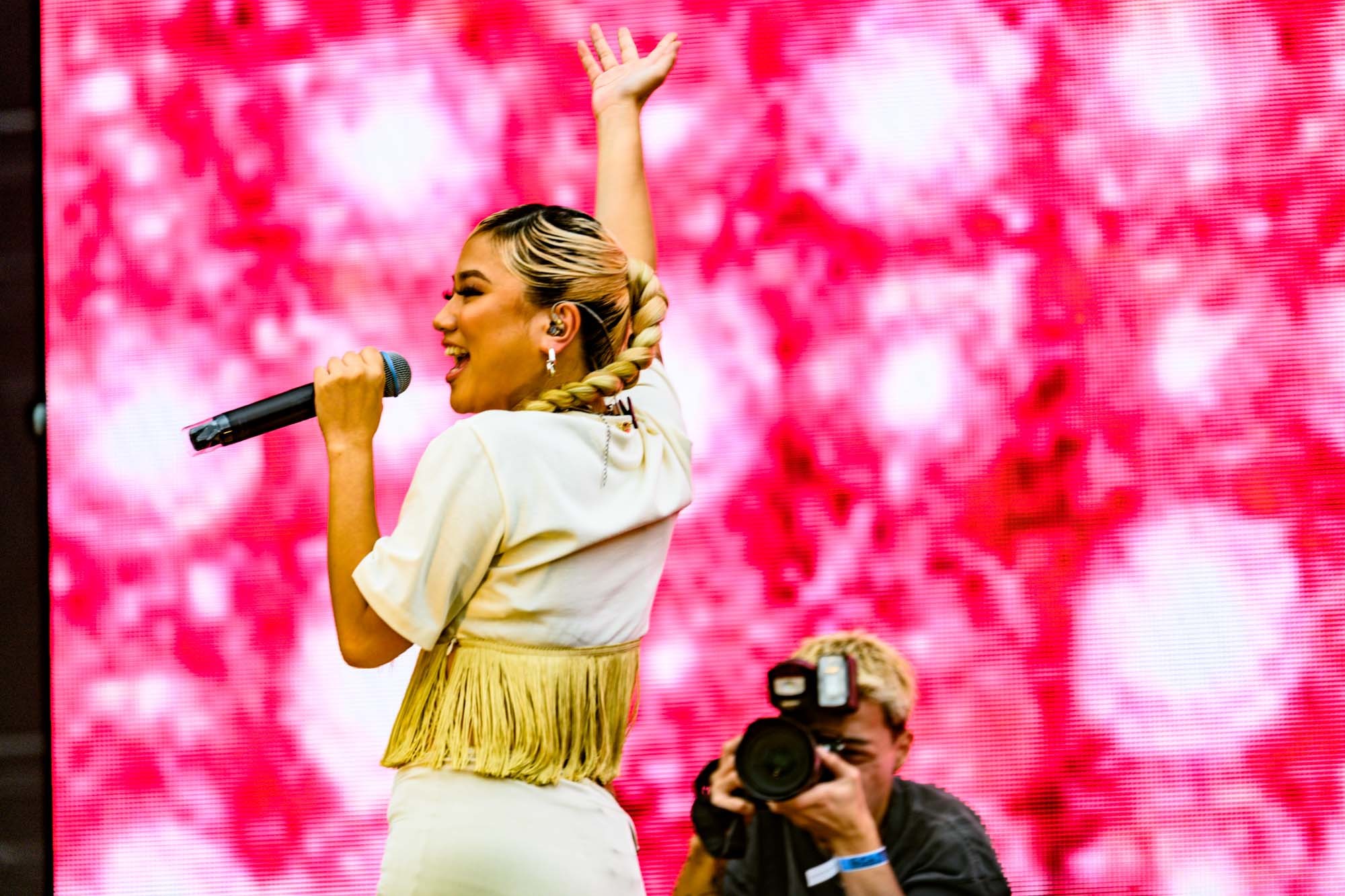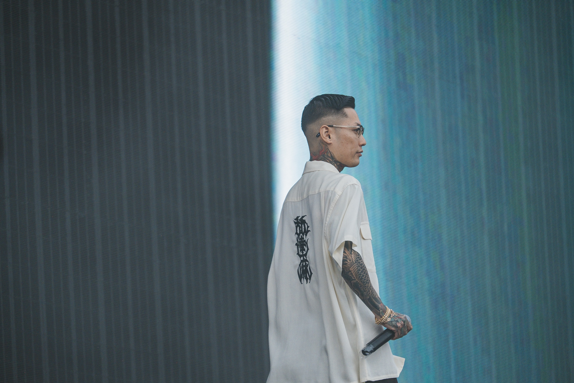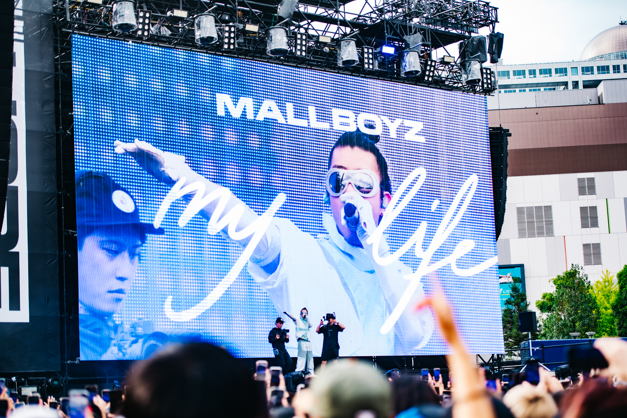15時近くなると、曇り空から明るい日差しが覗いてぐっと気温が上がって来た。JP THE WAVYがステージ巧者ぶりを発揮して会場をさらに熱くし、最新曲「What's Poppin feat.LANA」ではLANAがジョインして熱気を煽る。次に登場したTohjiは、さらに火に油を注ぐ…というよりもあくまでマイペース、超然としたスマートなパフォーマンスでオーディエンスの目と耳を釘付けにする。異彩を放つモードファッションに身を包み、Mall boysクルーの盟友・gummyboyと2マイクで届ける楽曲は、ヒップホップ経由のEDMとダブステップと言うべきか、スタジアム映えする強烈なダンスミュージック。ステージを走り抜けながらも汗くささを感じない、独特のお洒落な存在感はほかにはない。