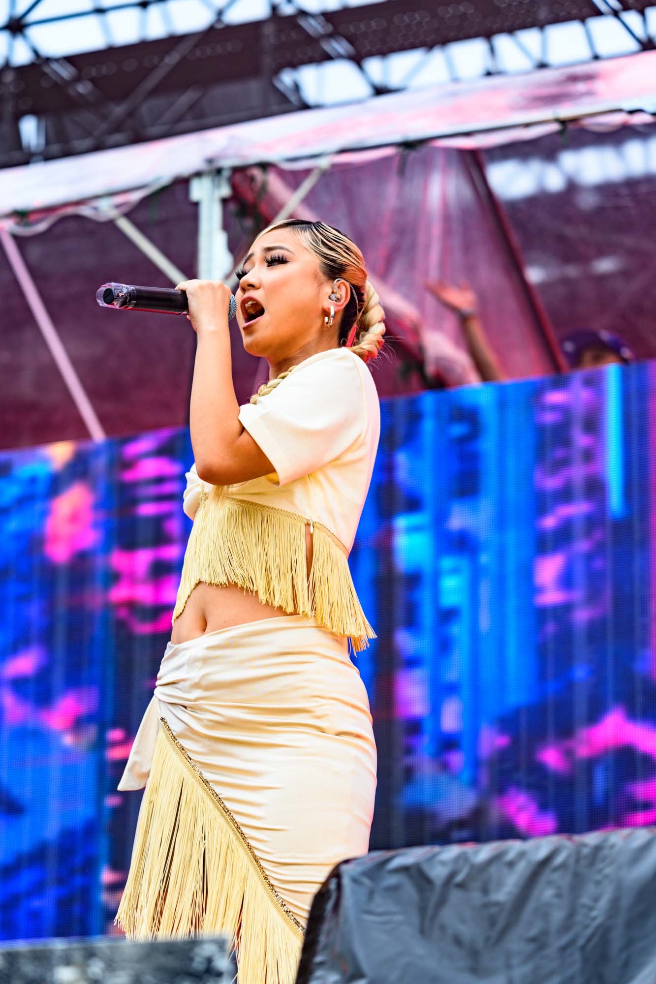 このブロックに堂々と抜擢されたのだから、ちゃんみなの人気と期待度は本物だ。実際、大ステージに映える演出の完成度の高さとパフォーマンス力は明らかで、ダンサーチームを従えて一糸乱れぬ振付で大歓声を浴びたかと思えば、ロックシンガーにも負けないド迫力ボイスでオーディエンスをノックアウト。LANAと同じく会場内の女性人気は圧倒的だが、コケティッシュでありながらも媚びずに凛としたたずまいは、男くさいラッパーたちに囲まれても揺るぎない包容力がある。「美人」から「Never Grow Up」までヒットチューンをずらりと並べ、今ここだけの華やかな空間を存分に楽しませてくれたドリーミーな20分間。
