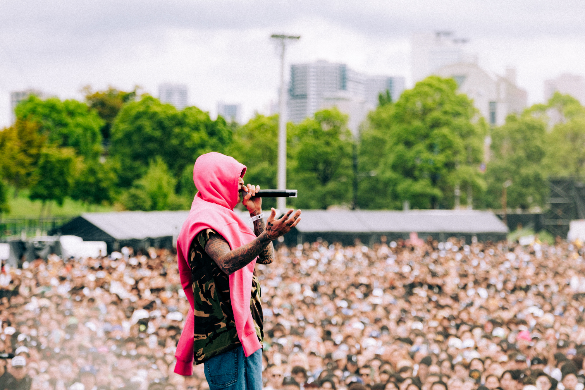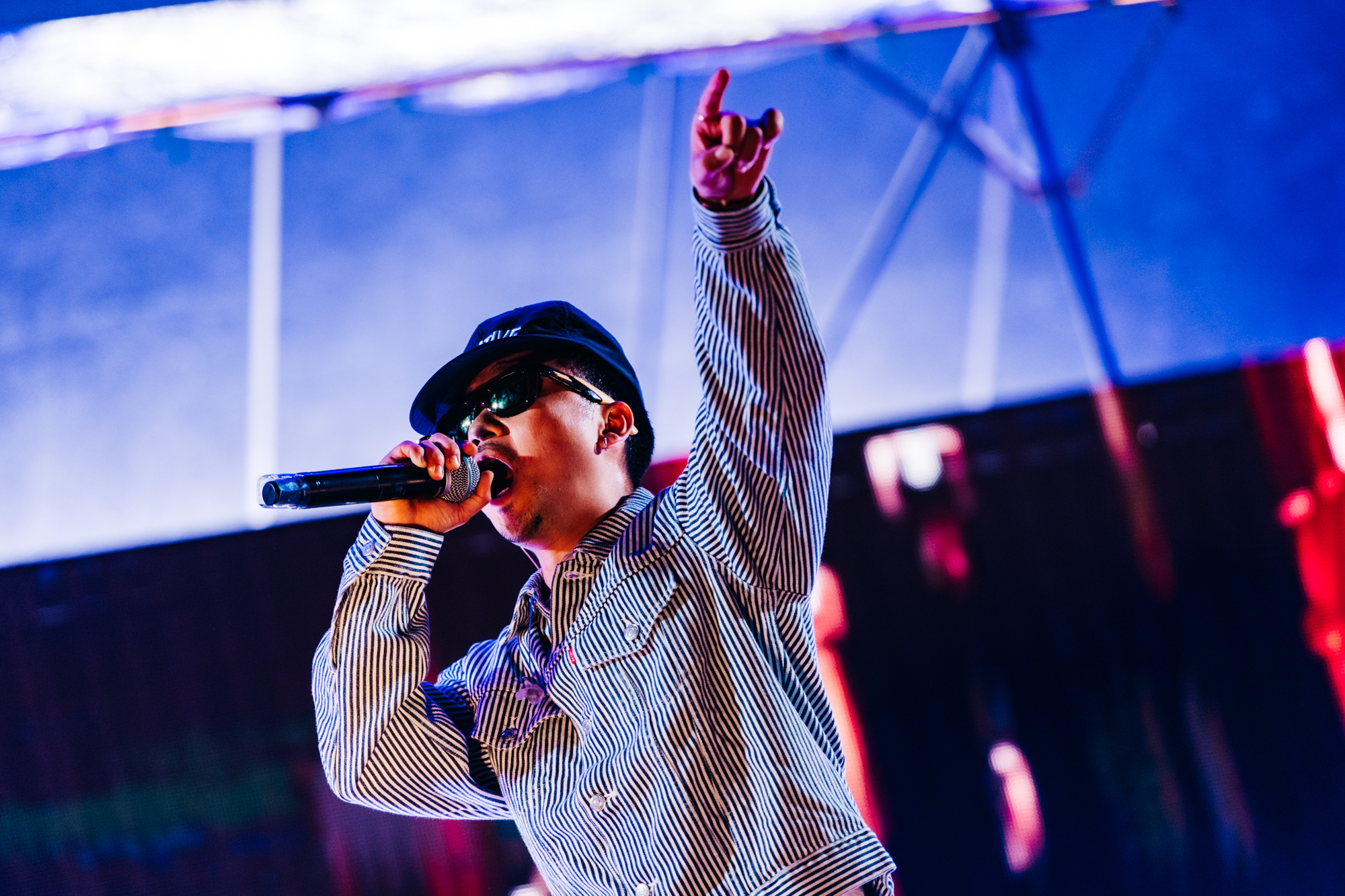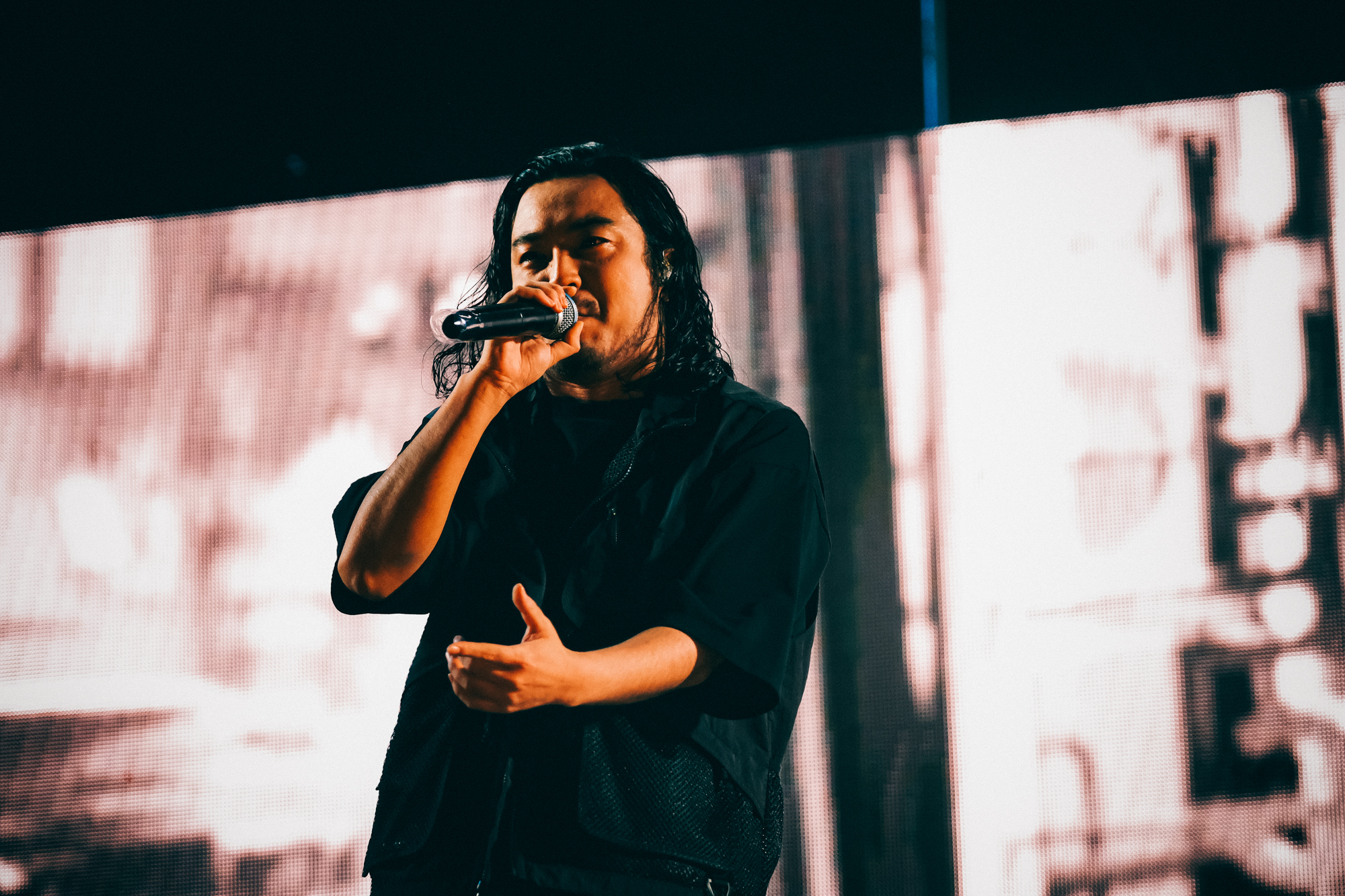 いつの間にか時刻は19時を回った。ここからは持ち時間20分のアクトが3人、そしてヘッドライナーへ向けて盛り上がってゆくゴールデンタイム。にも関わらず、「12時から来てくれた人は疲れてるだろうから、ゆっくりBGM代わりに聴いてください」と言葉をかけ、チルでスムーズなムードを演出したPUNPEEの姿勢には頭が下がる。「お隣さんより凡人」の、往年の日本語ラップのフレーズを盛り込んだラップにはジンと来たし、BIMを迎えた「Night Rider」で新しいシーンにもしっかりコミットする。装飾を排して真っ当なラップに徹する、さすがの貫禄。