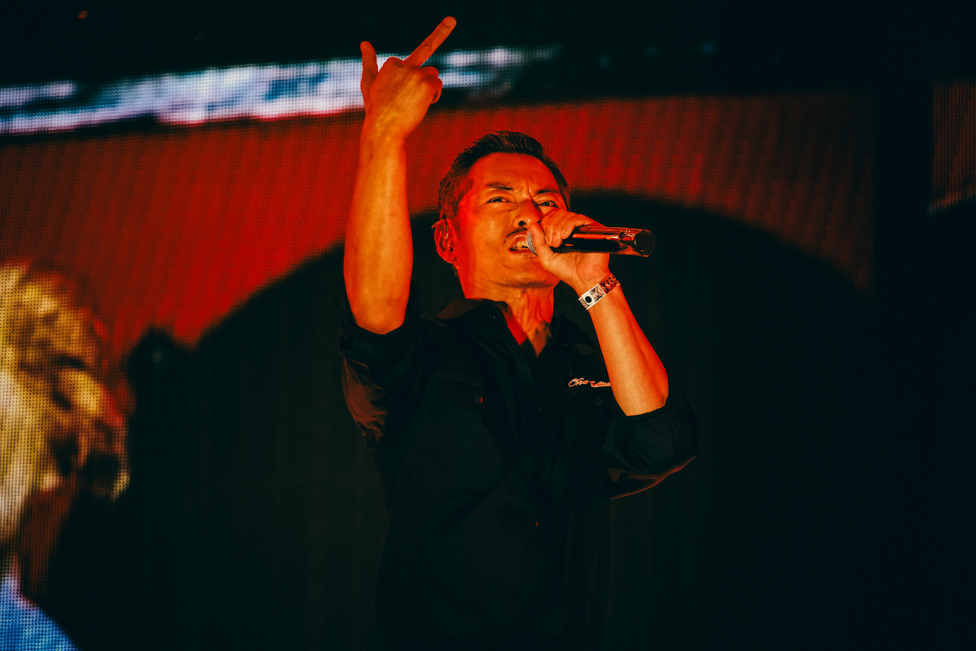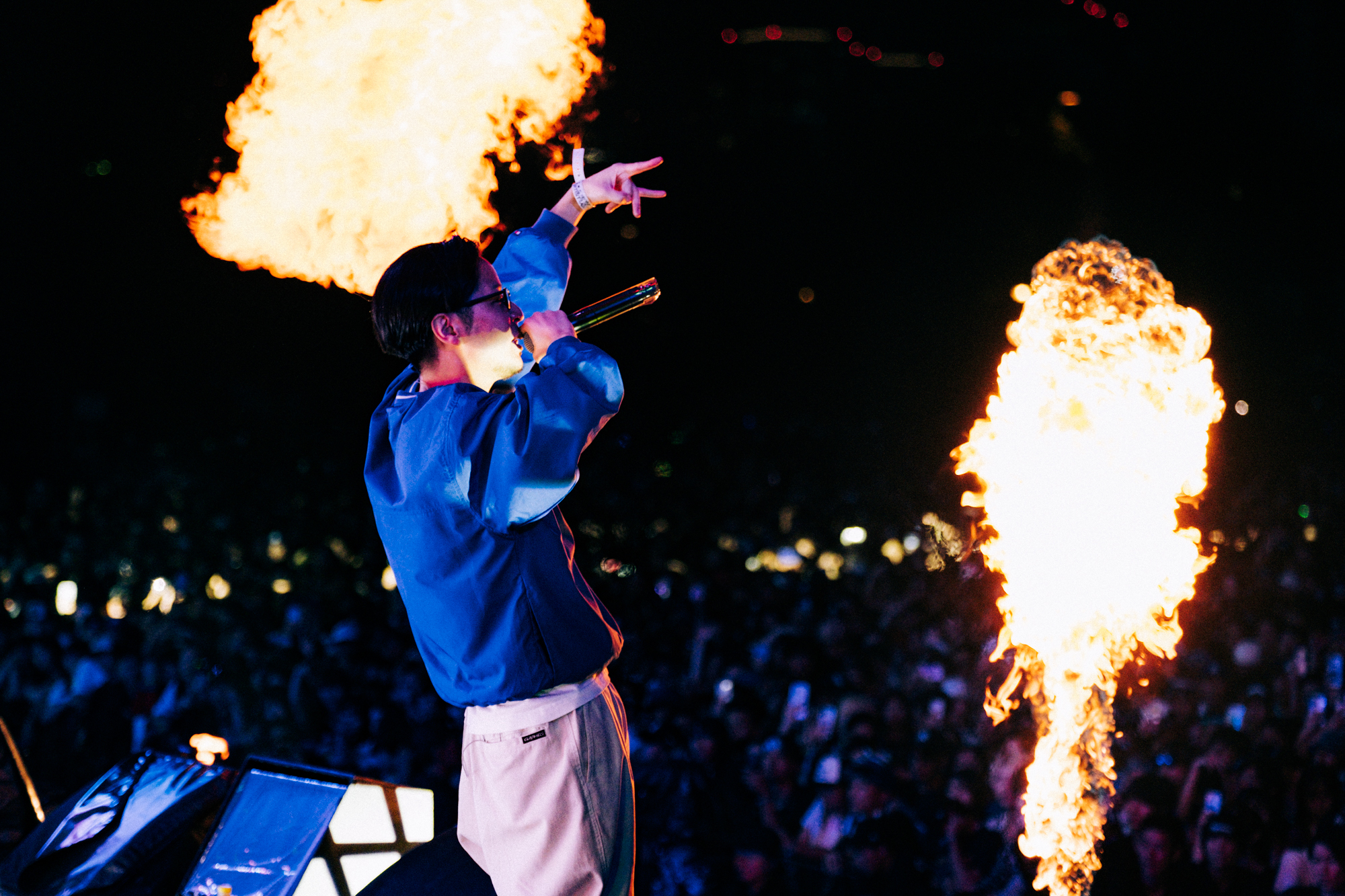 ラストアクト登場までまだ2時間ある18時にAK-69が登場してしまうとは、出番を決めた『THE HOPE』も受けたAK-69も実に懐が深い。AK-69にしてみれば、これからは若くてイキのいい奴がメインを張るべきだという意識もあるだろう。しかし一たびステージに立てばキングの貫禄は絶対に譲らない。スクリーンが真っ赤に染まり、激しく炎がぶち上がり、ド派手な照明が輝く中、すさまじい気迫のラップと歌で格の違いを見せつける。「Ding Ding Dong~心の鐘~」から「Flying B」まで選曲も完璧だ。オーディエンスはただ盛り上がるだけでなく、ケタ違いのパワーに口あんぐりで見とれているように見える。「日本のヒップホップ。よくここまで来た」という言葉がずしりと重い。若手中心の今日のアクトの中で、身をもって到達点を示す圧倒的な存在感には痺れるしかない。
